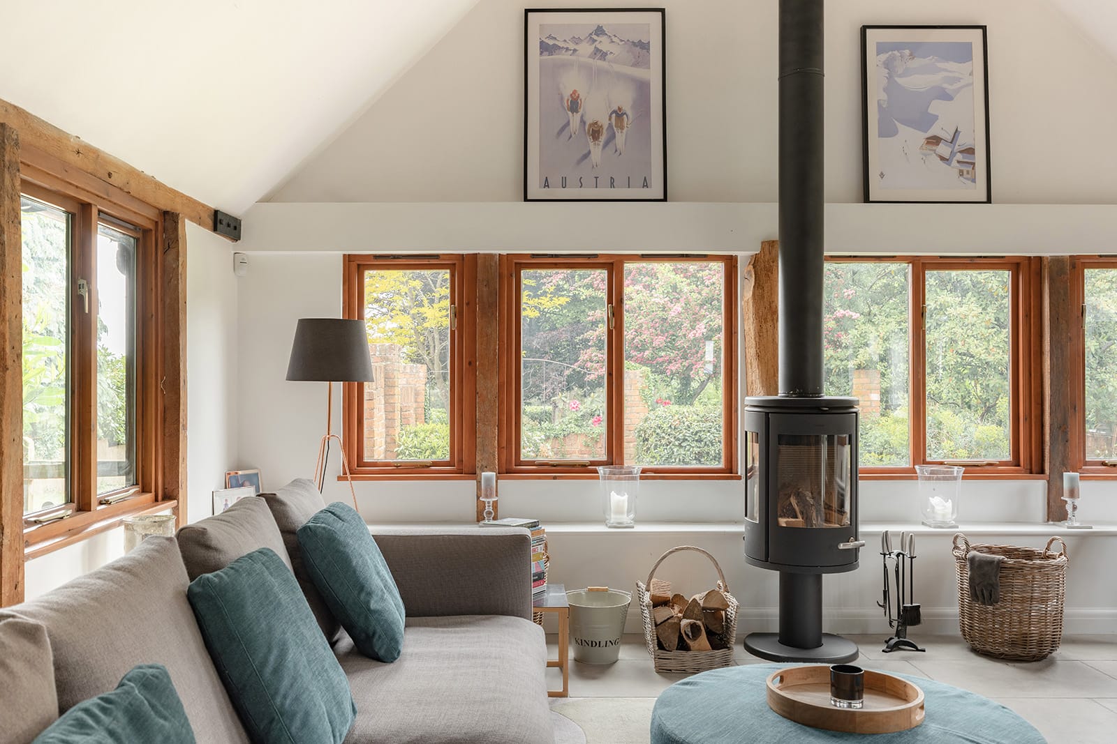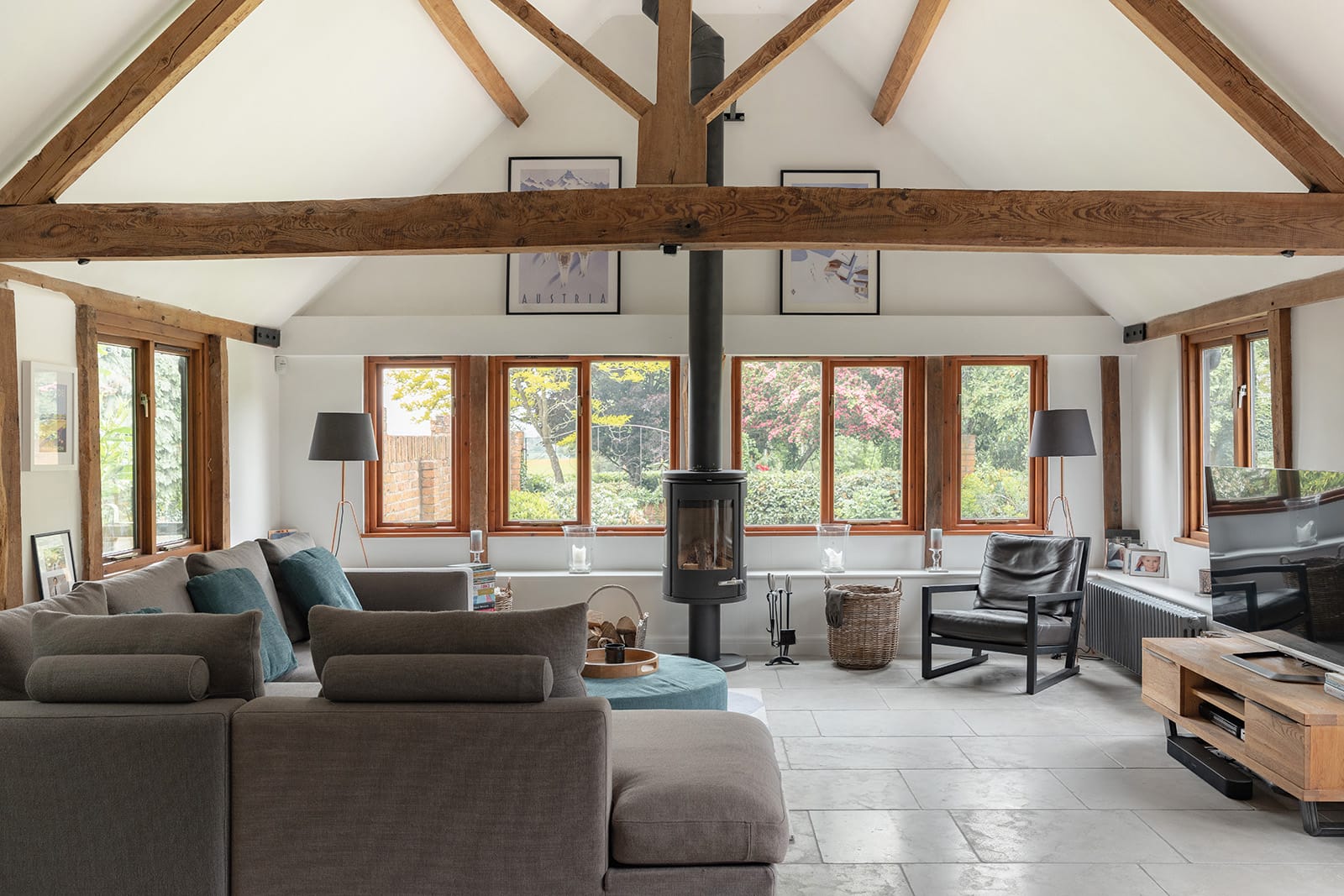 At its heart lies a magnificent open-plan space of some 700 sq ft, crowned by a vaulted ceiling rising over 13 feet. Original trusses, lovingly exposed, celebrate the building’s agricultural heritage, while natural light pours through triple-aspect windows. A contemporary woodburner anchors the space with sculptural elegance. The kitchen, crafted by Humphrey Munson, is a masterclass in timeless design: Shaker cabinetry in soft grey is paired with black granite worktops and a generous island offers informal dining for six.