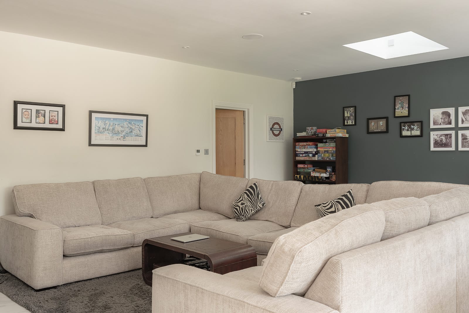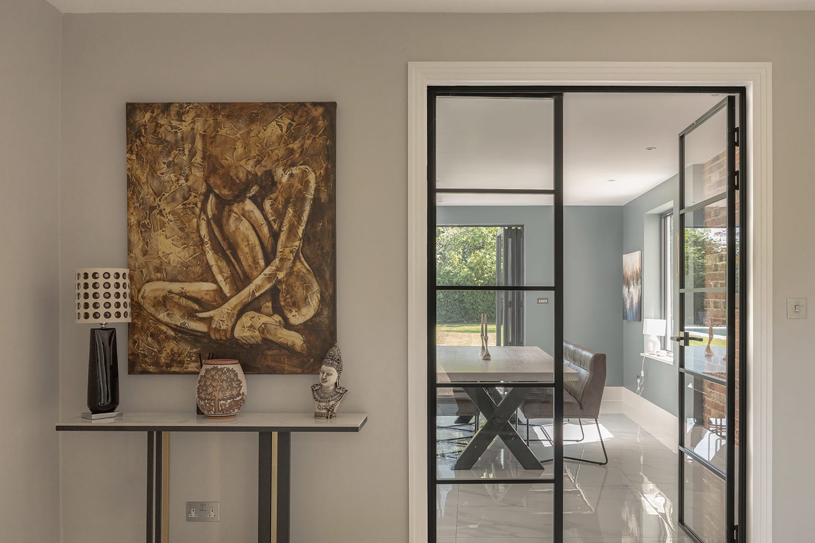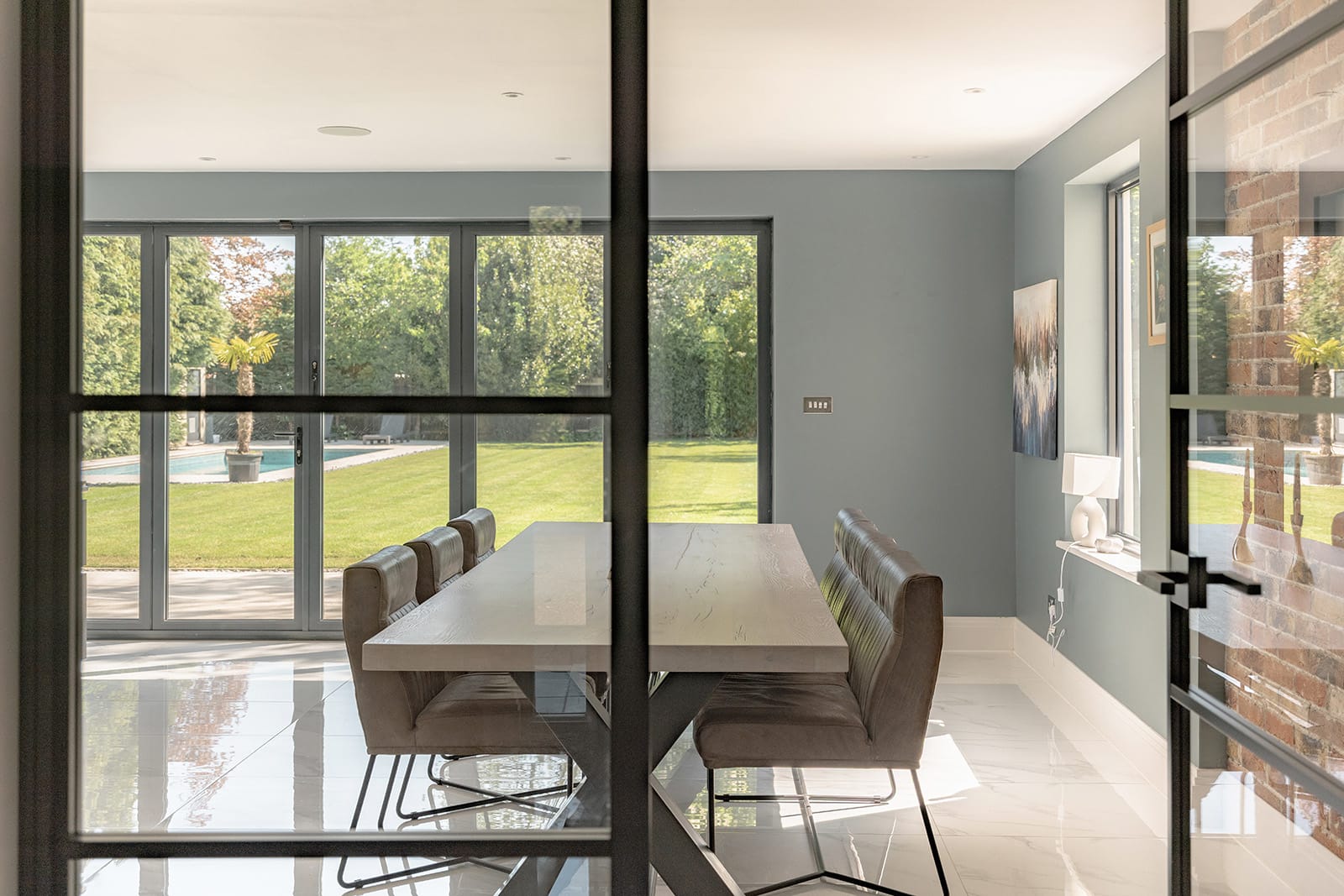 From the hallway, steel-framed Crittall-style glazed double doors open to a spectacular kitchen and dining space – around 500 sq ft of triple-aspect open-plan living, gloriously lit by a 16ft wall of bifold glazing that draws the garden deep into the interior. A generous central island acts as the social anchor and culinary stage, flanked by integrated appliances and precision Nolte cabinetry. A concealed, oversized pocket door offers connection – or separation – to the adjacent family room, where skylights punctuate the ceiling and bifold doors continue the home’s seamless dialogue with the garden.