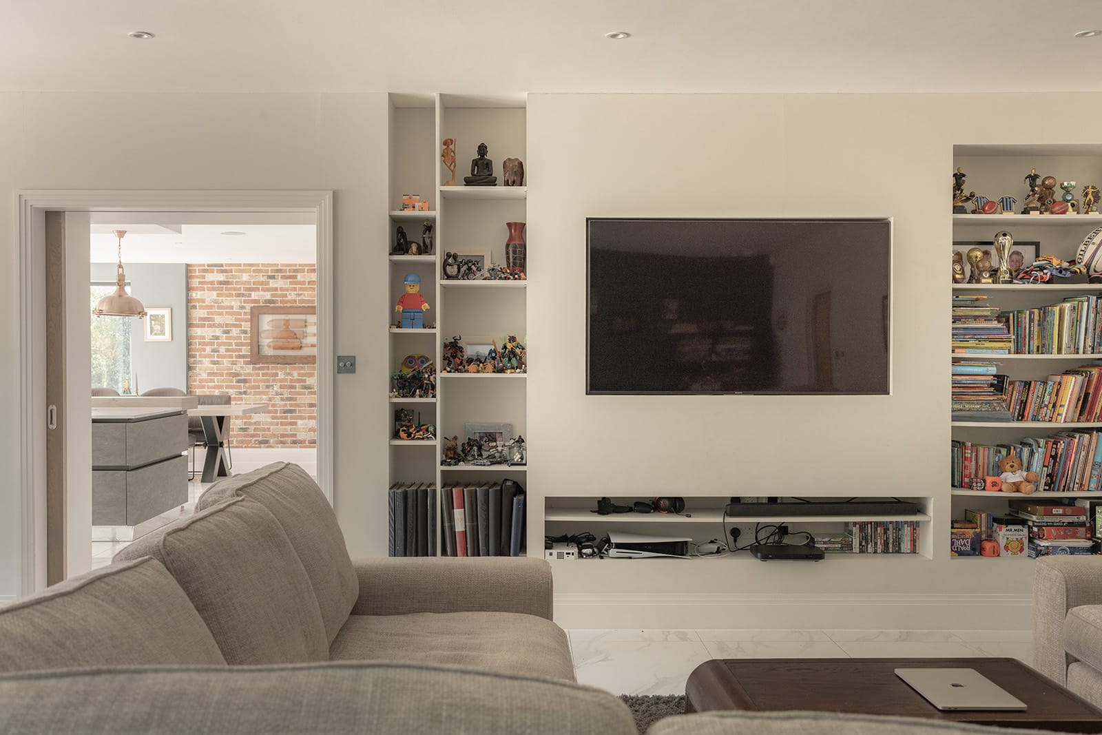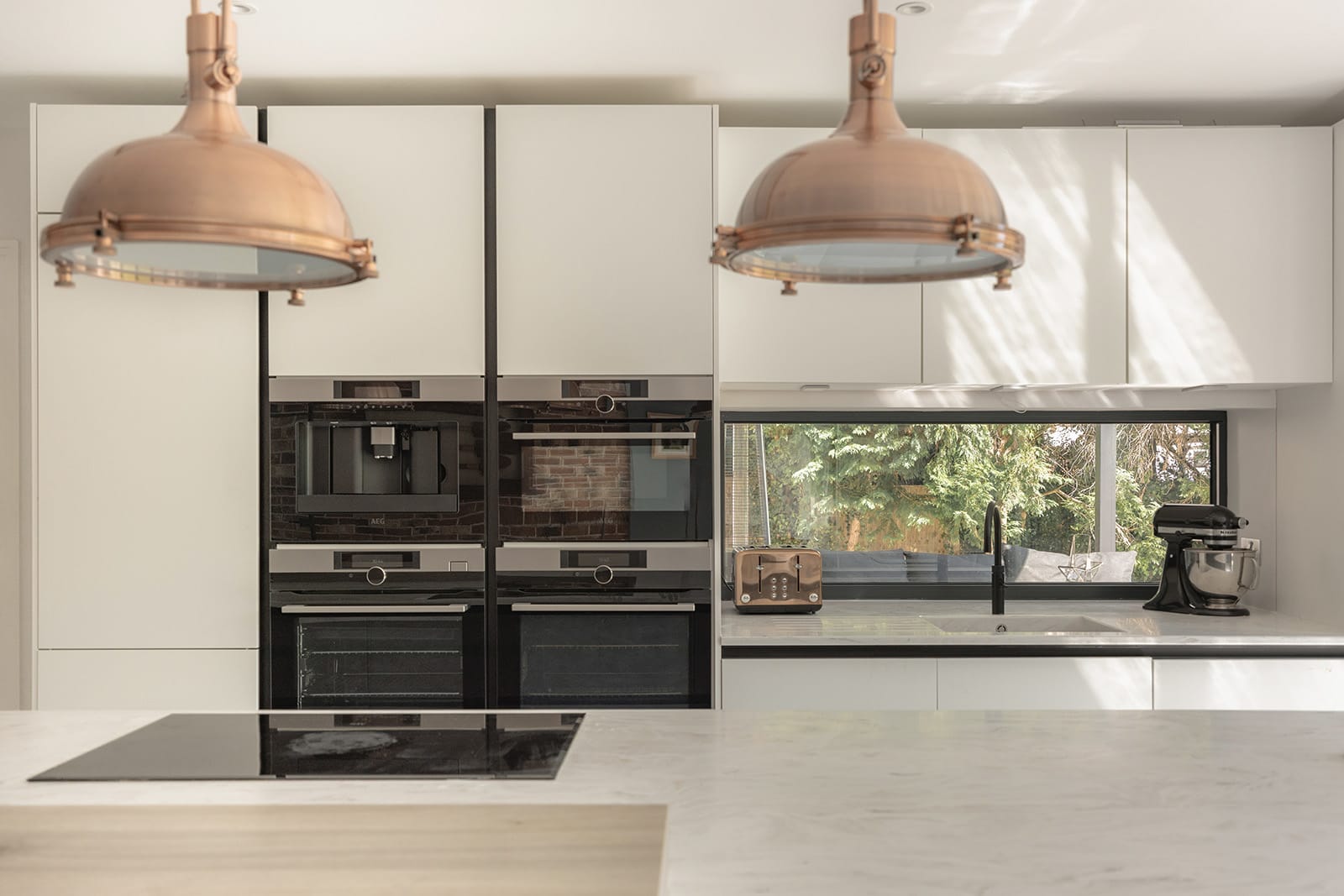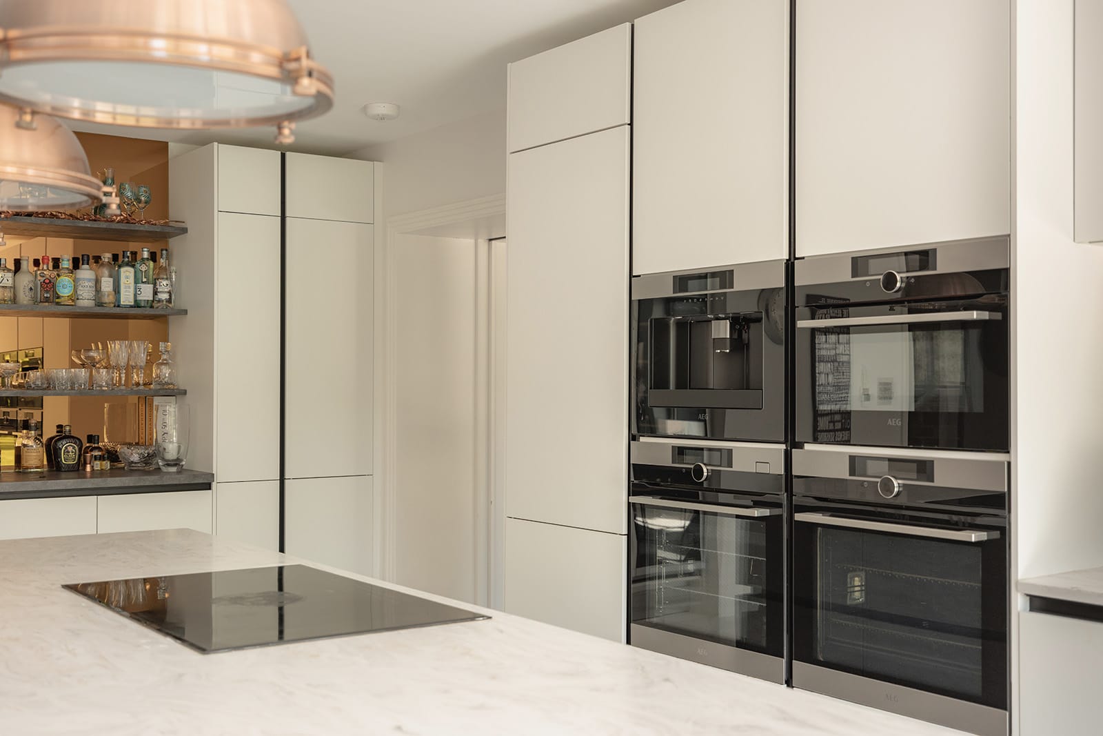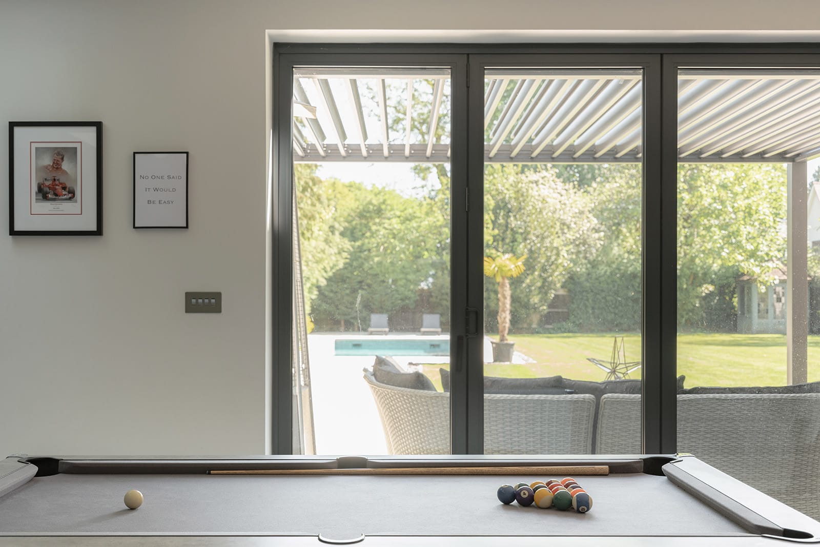 From the hallway, steel-framed Crittall-style glazed double doors open to a spectacular kitchen and dining space – around 500 sq ft of triple-aspect open-plan living, gloriously lit by a 16ft wall of bifold glazing that draws the garden deep into the interior. A generous central island acts as the social anchor and culinary stage, flanked by integrated appliances and precision Nolte cabinetry. A concealed, oversized pocket door offers connection – or separation – to the adjacent family room, where skylights punctuate the ceiling and bifold doors continue the home’s seamless dialogue with the garden.