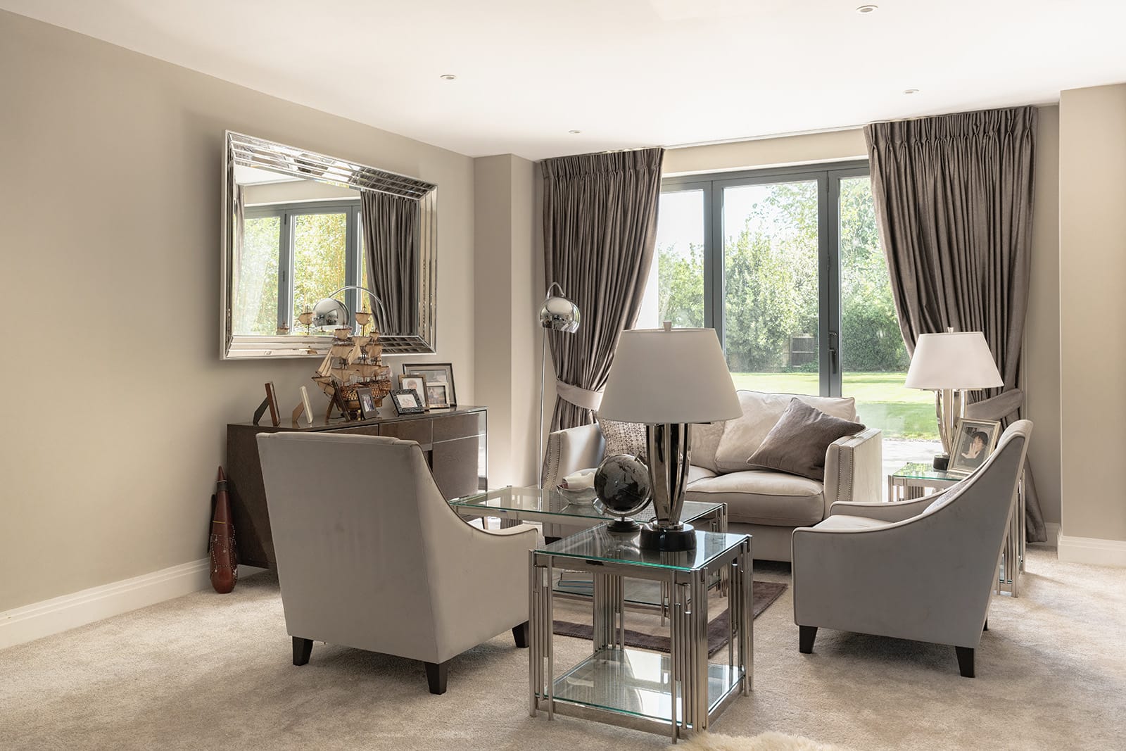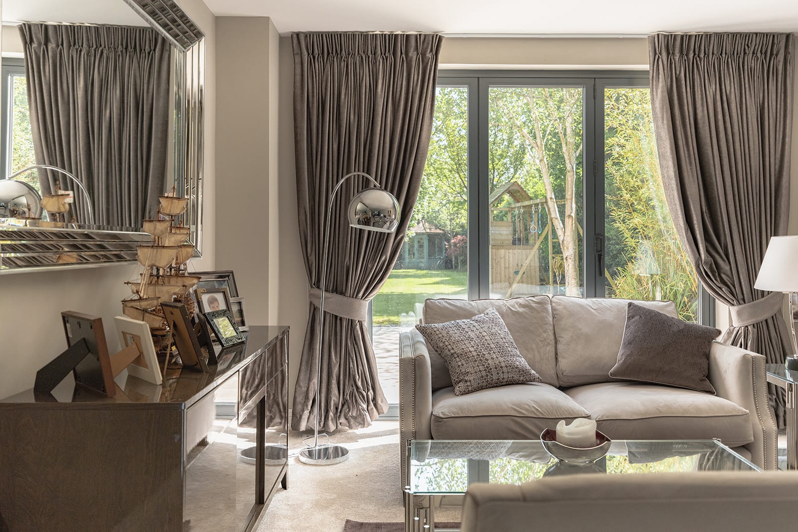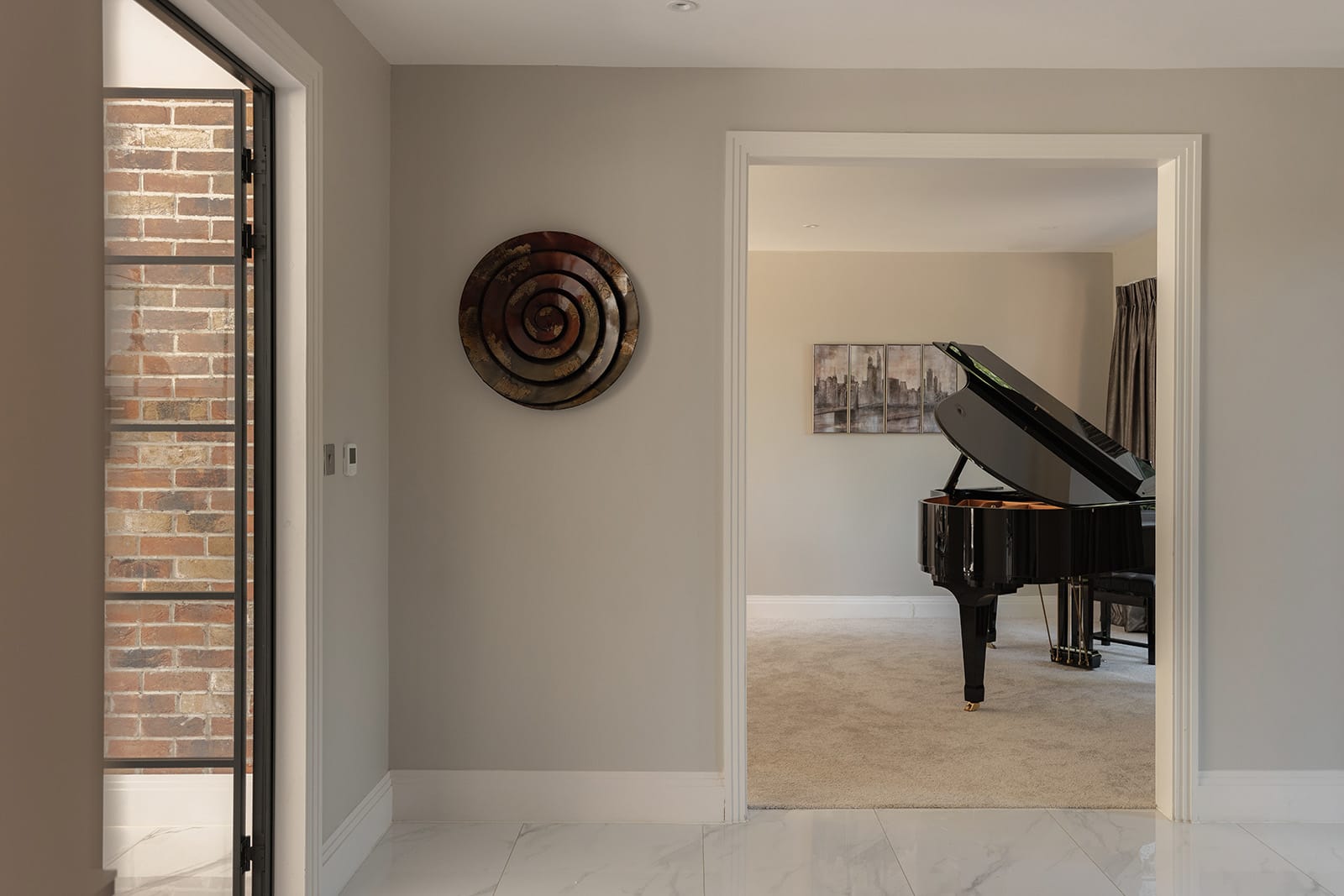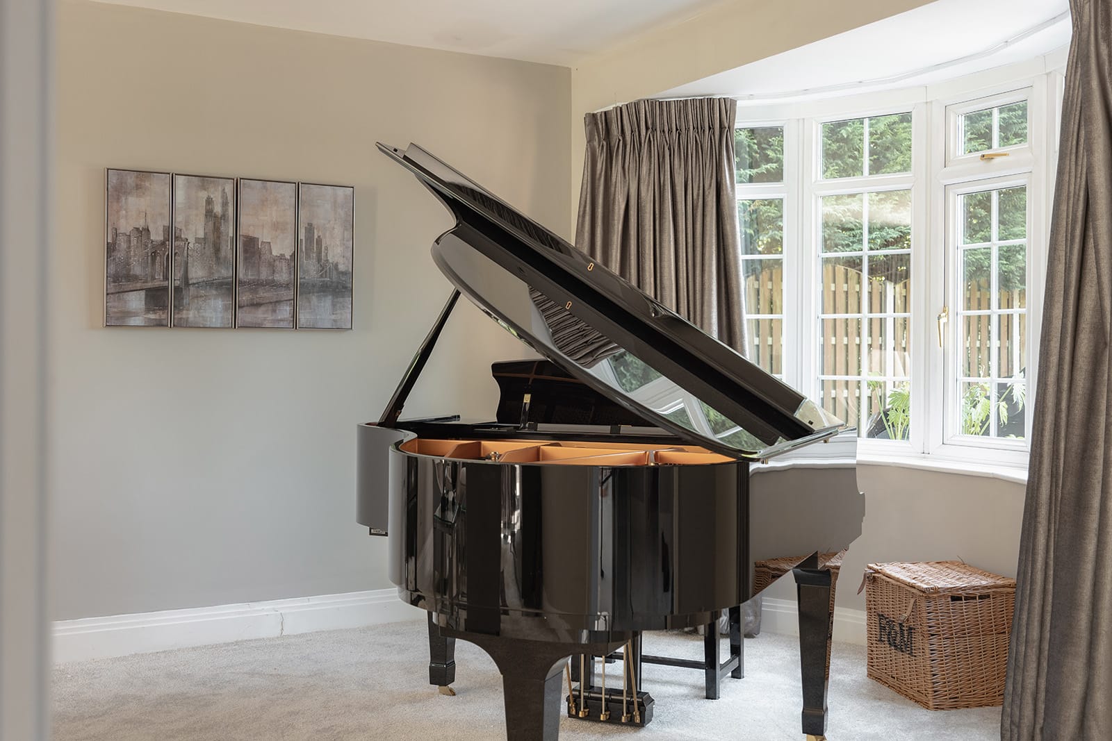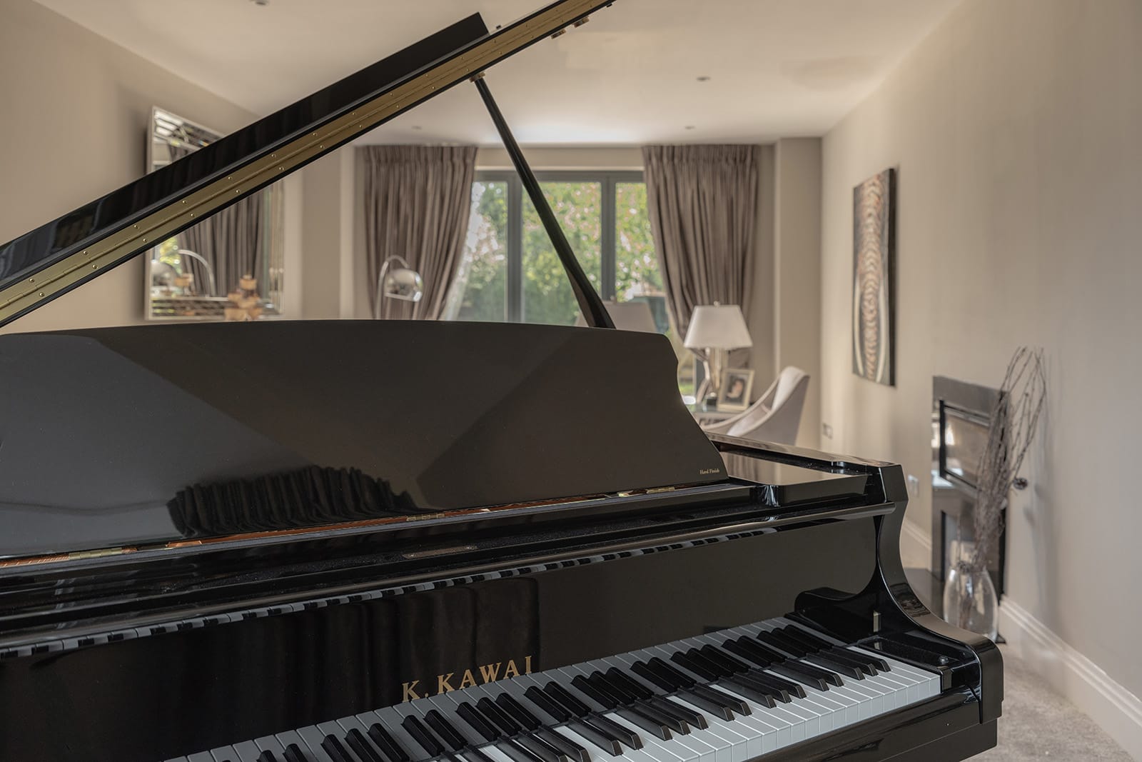 The property begins with a wide, welcoming hallway, a prelude to the unfolding light and volume that follows. To the right, the formal sitting room enjoys a dual aspect, anchored by a broad bay window and bifold doors that lead to the rear garden. Here, a grand piano sits comfortably, attesting to the generosity of scale.