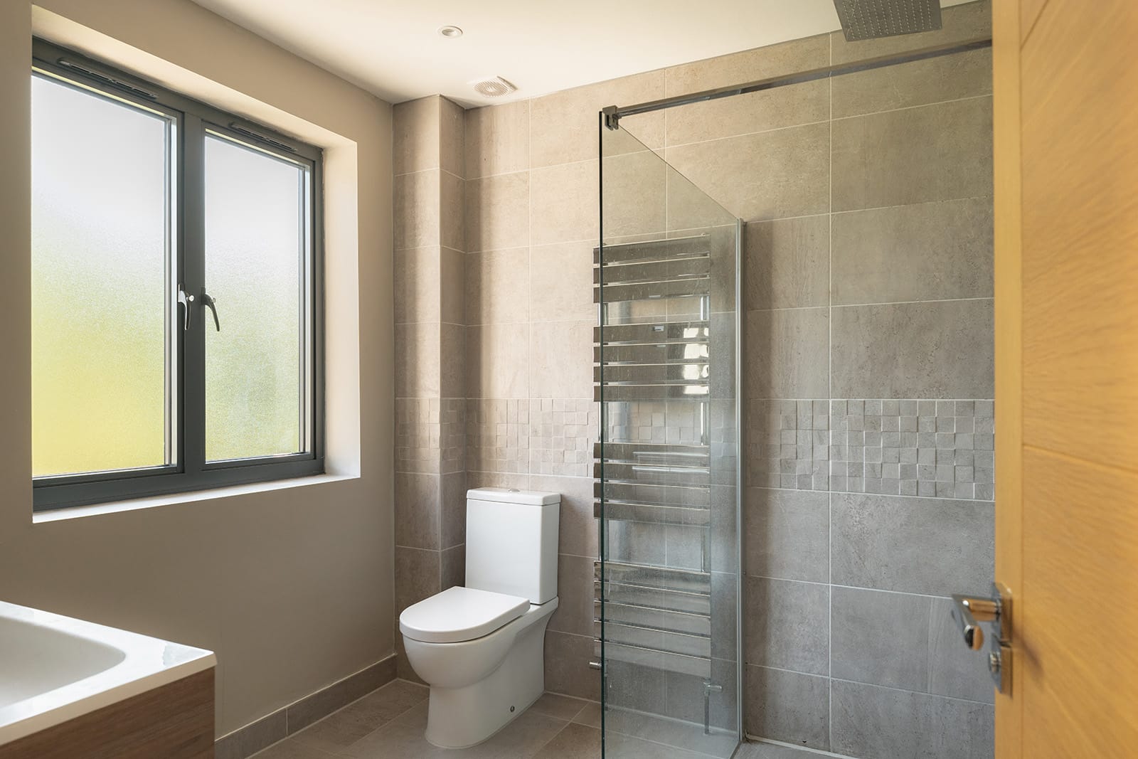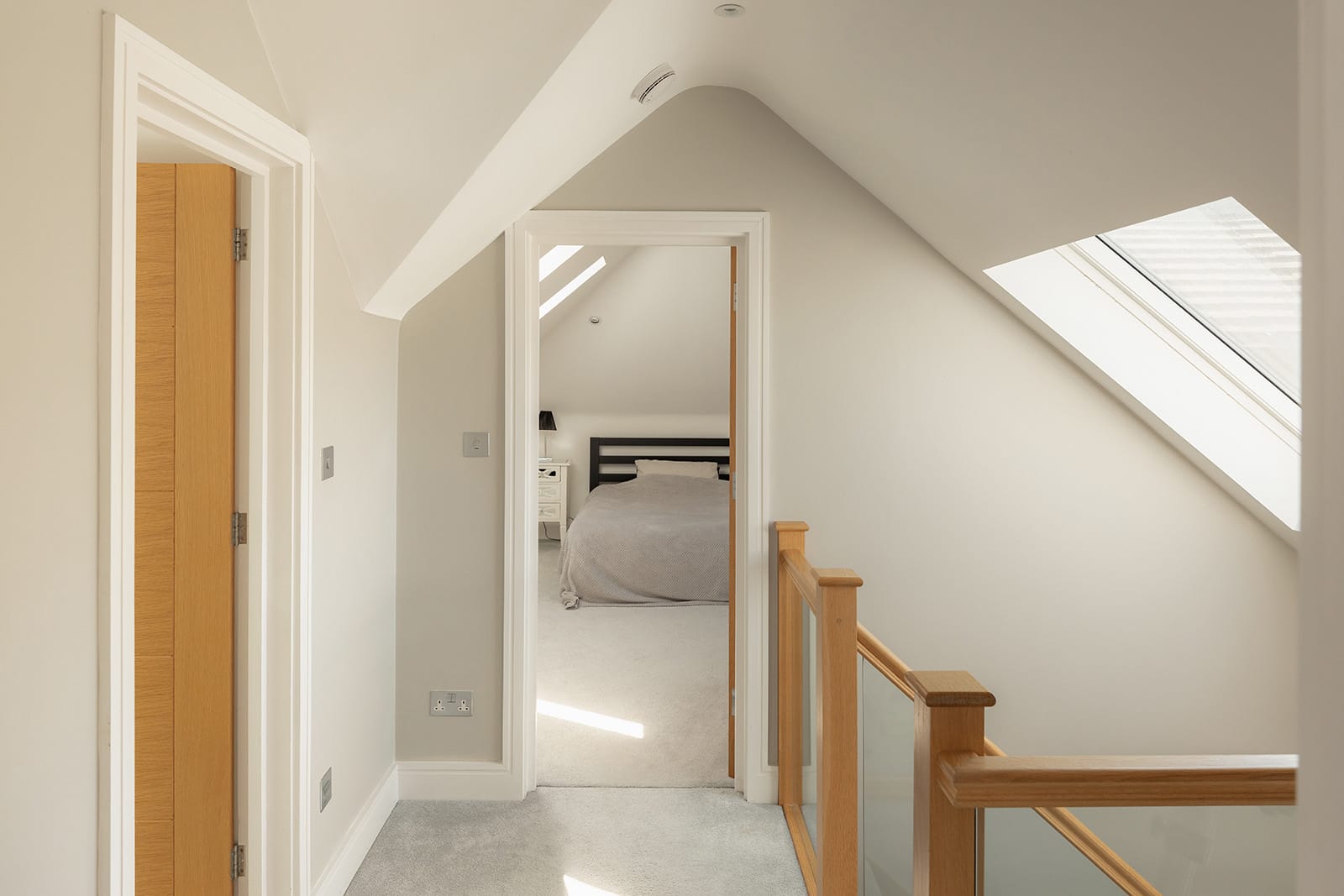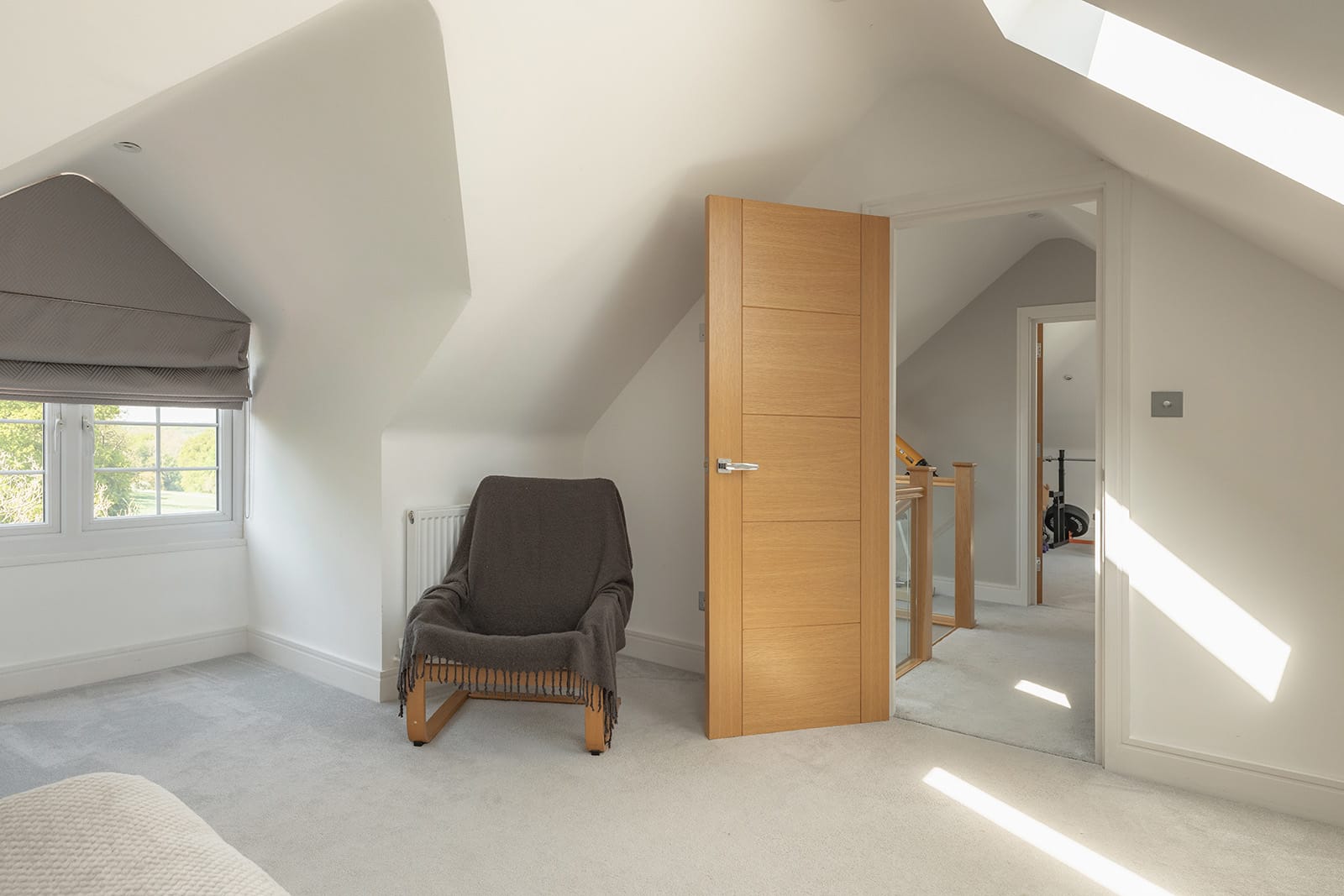 An oak and glass staircase ascends to the second floor, where two further bedrooms, both with elevated views over open countryside, share a sleek family bathroom, again finished with a freestanding bath and contemporary fixtures.
