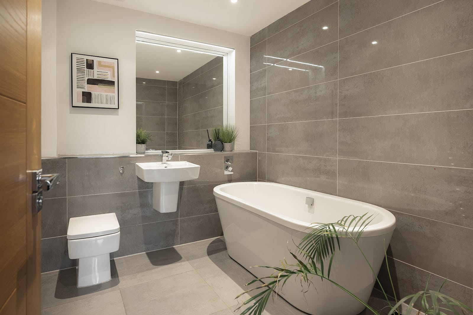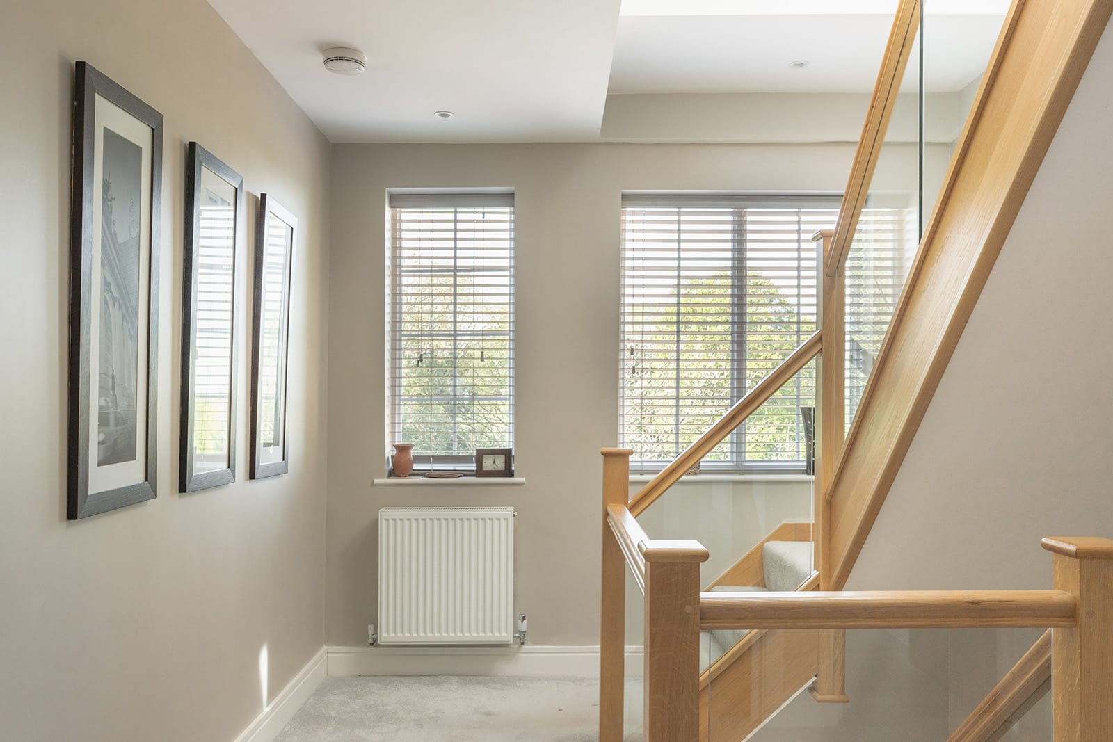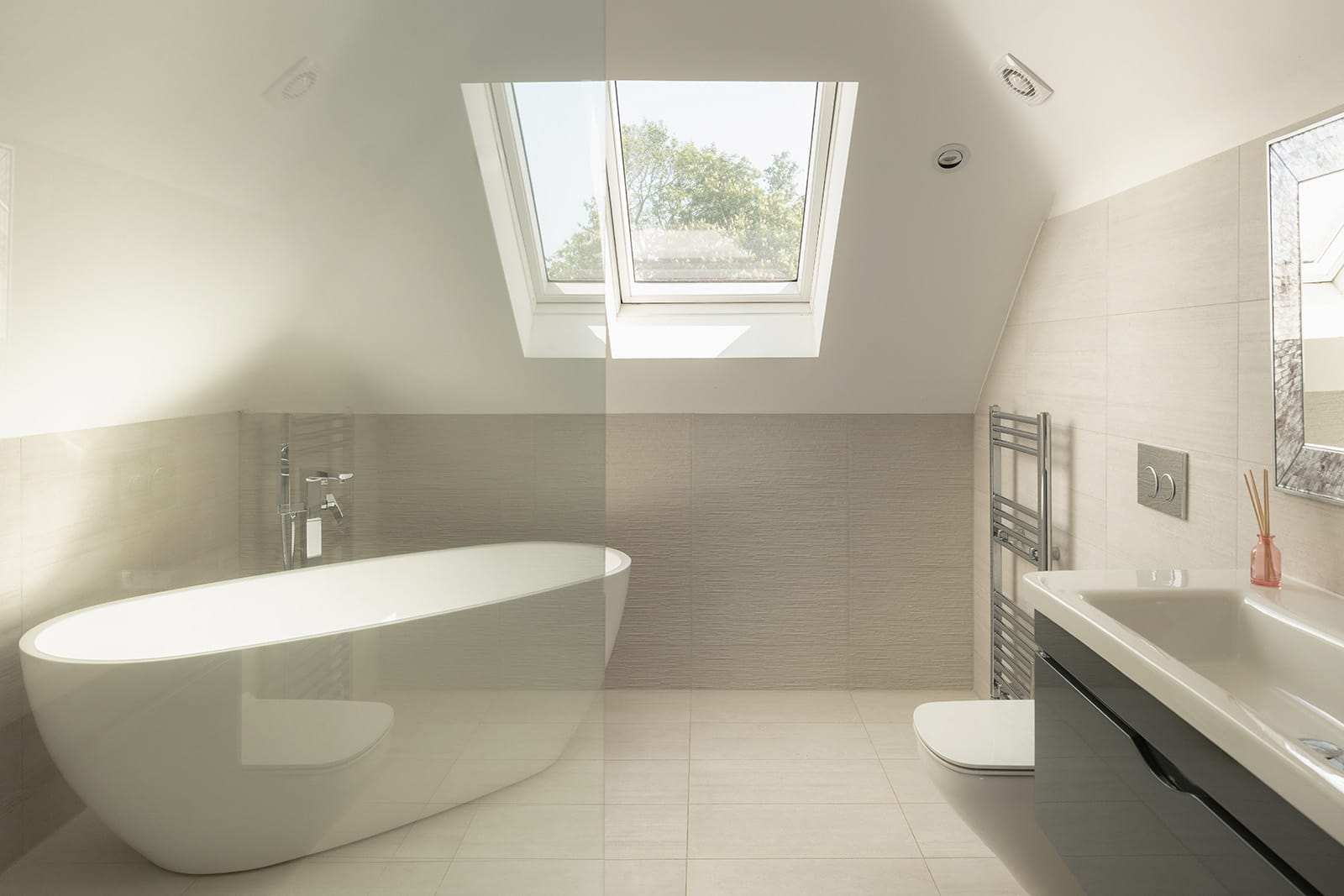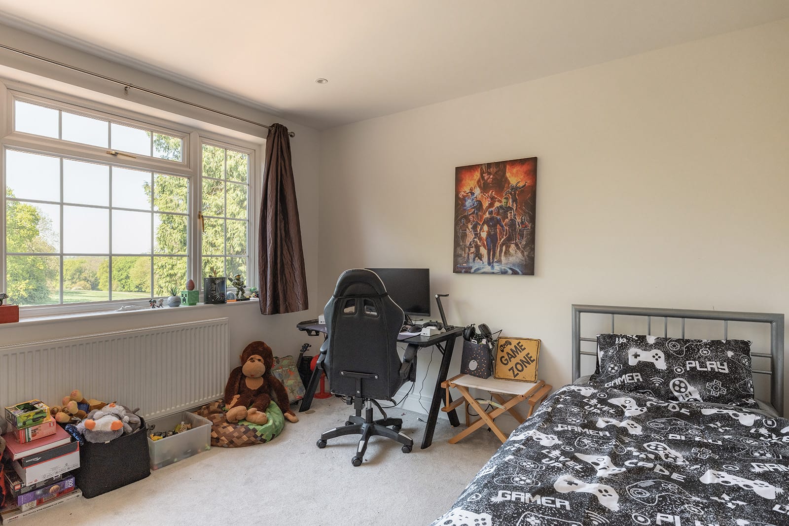 An oak and glass staircase ascends to the second floor, where two further bedrooms, both with elevated views over open countryside, share a sleek family bathroom, again finished with a freestanding bath and contemporary fixtures.