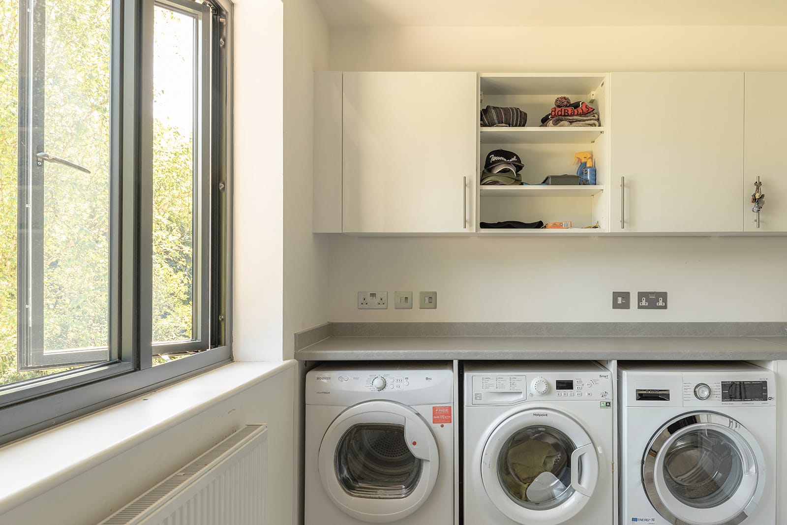 Upstairs, the first floor houses the principal bedroom suite, which comes complete with a dressing room, fitted wardrobes and a beautifully appointed en suite shower room. Two additional bedrooms on this level benefit from private en suites, while the fourth bedroom enjoys use of the main family bathroom. A dedicated laundry room reflects the home’s thoughtful planning.