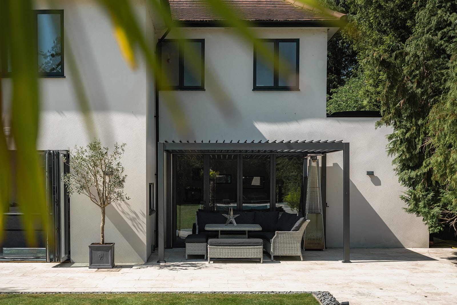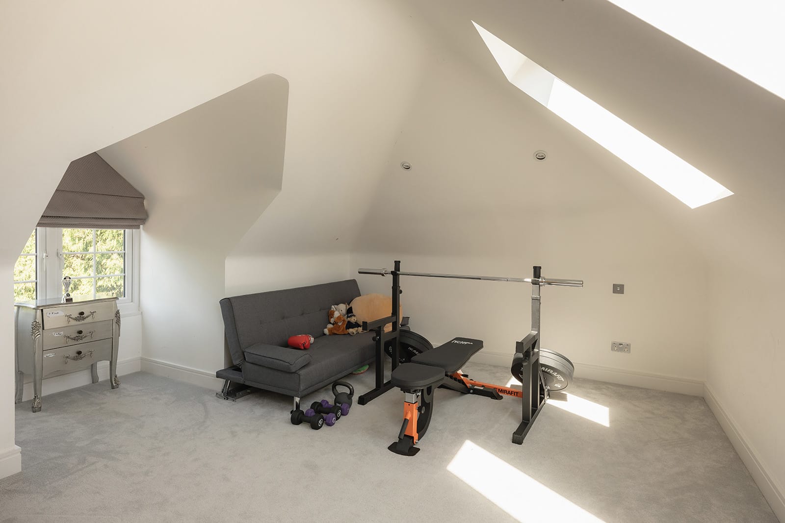 Functionality is elegantly folded into the design, with two cloakrooms, a plant room for mechanical systems, and a reimagined garage now serving as a home gym.
