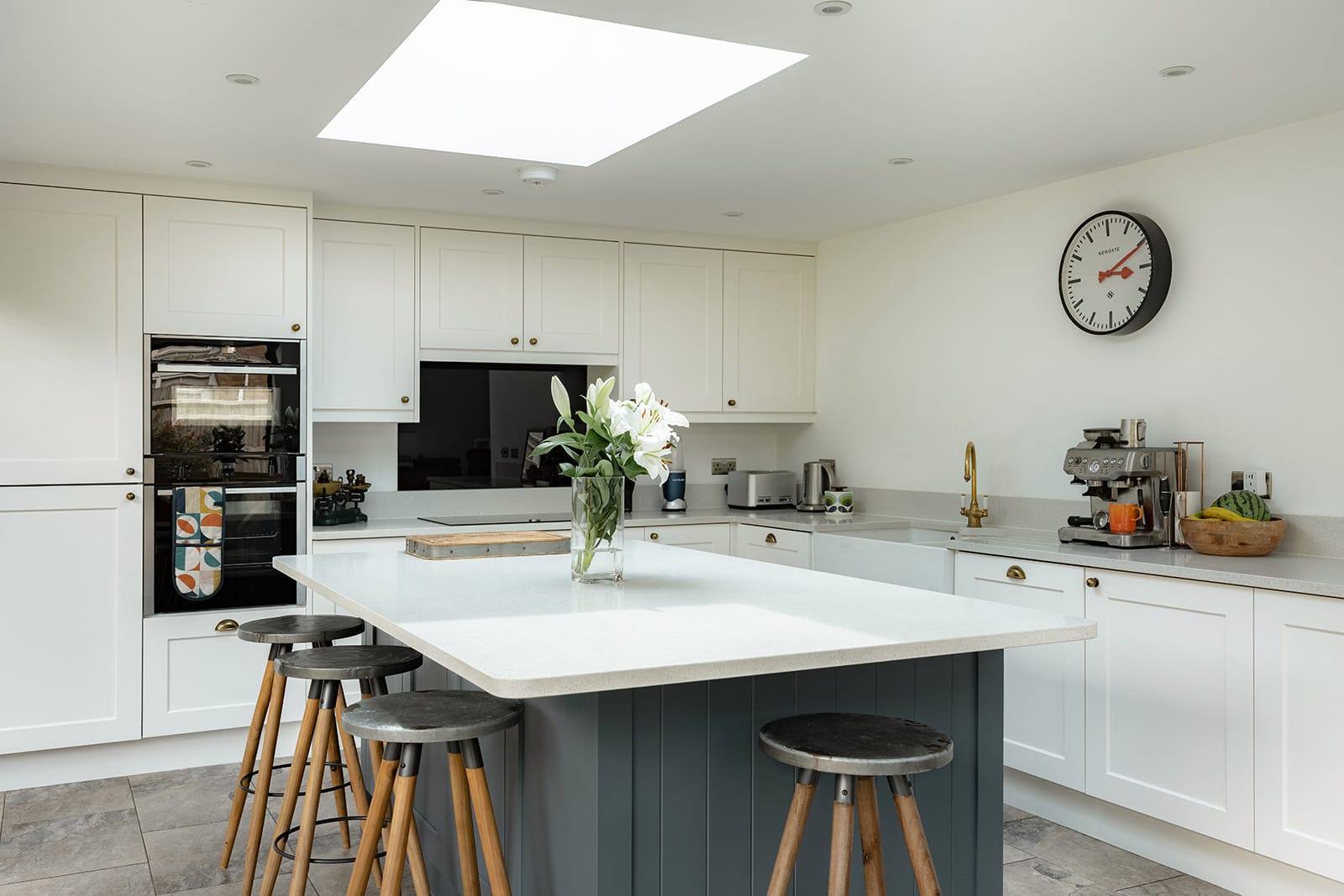 The modern kitchen, dining and family space sits within the extension to the rear; a beautifully conceived addition, drenched in light from a trio of skylights and wall of bifold doors that open directly onto the garden. Traditional cabinetry anchors the kitchen, which includes integrated appliances and a substantial central island that invites gathering and conversation. Underfloor heating runs throughout the space.