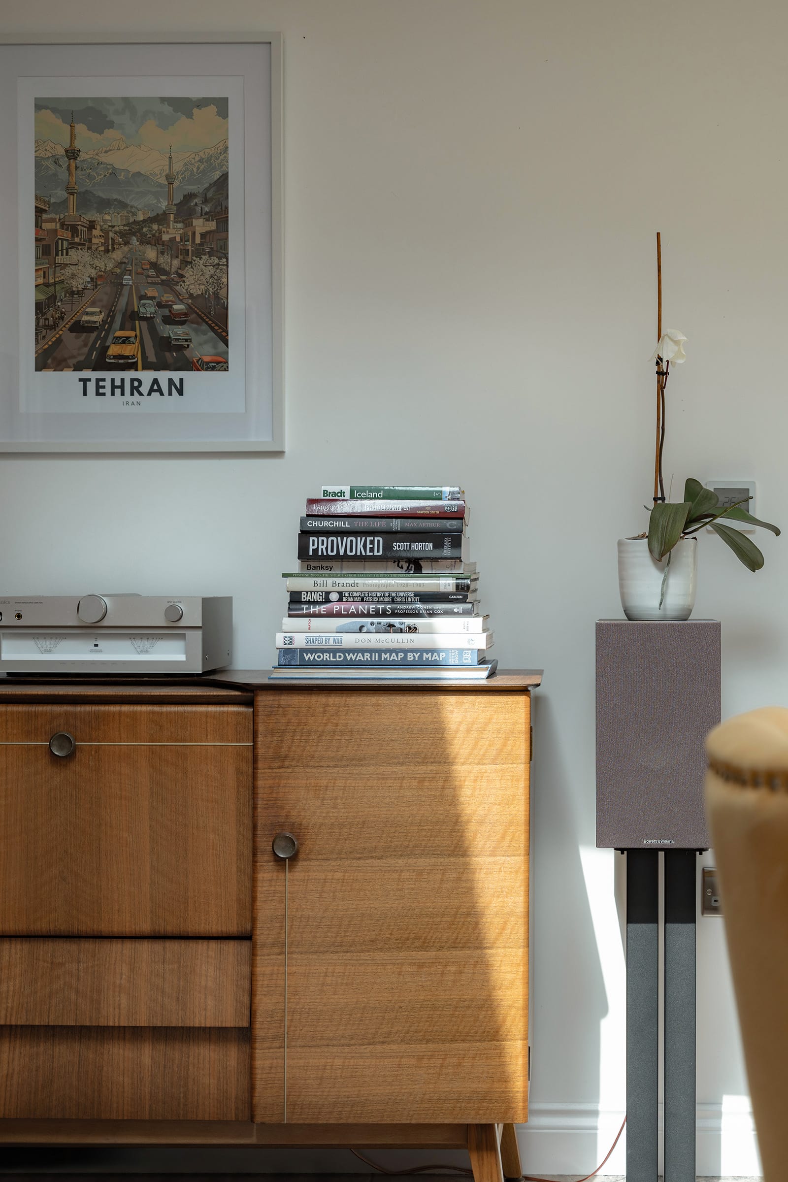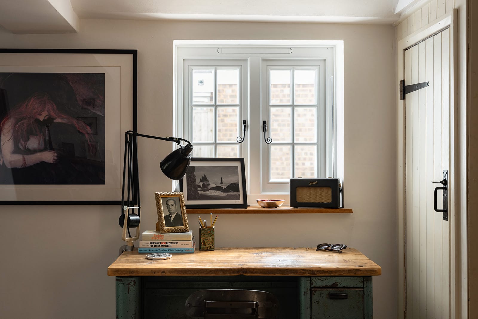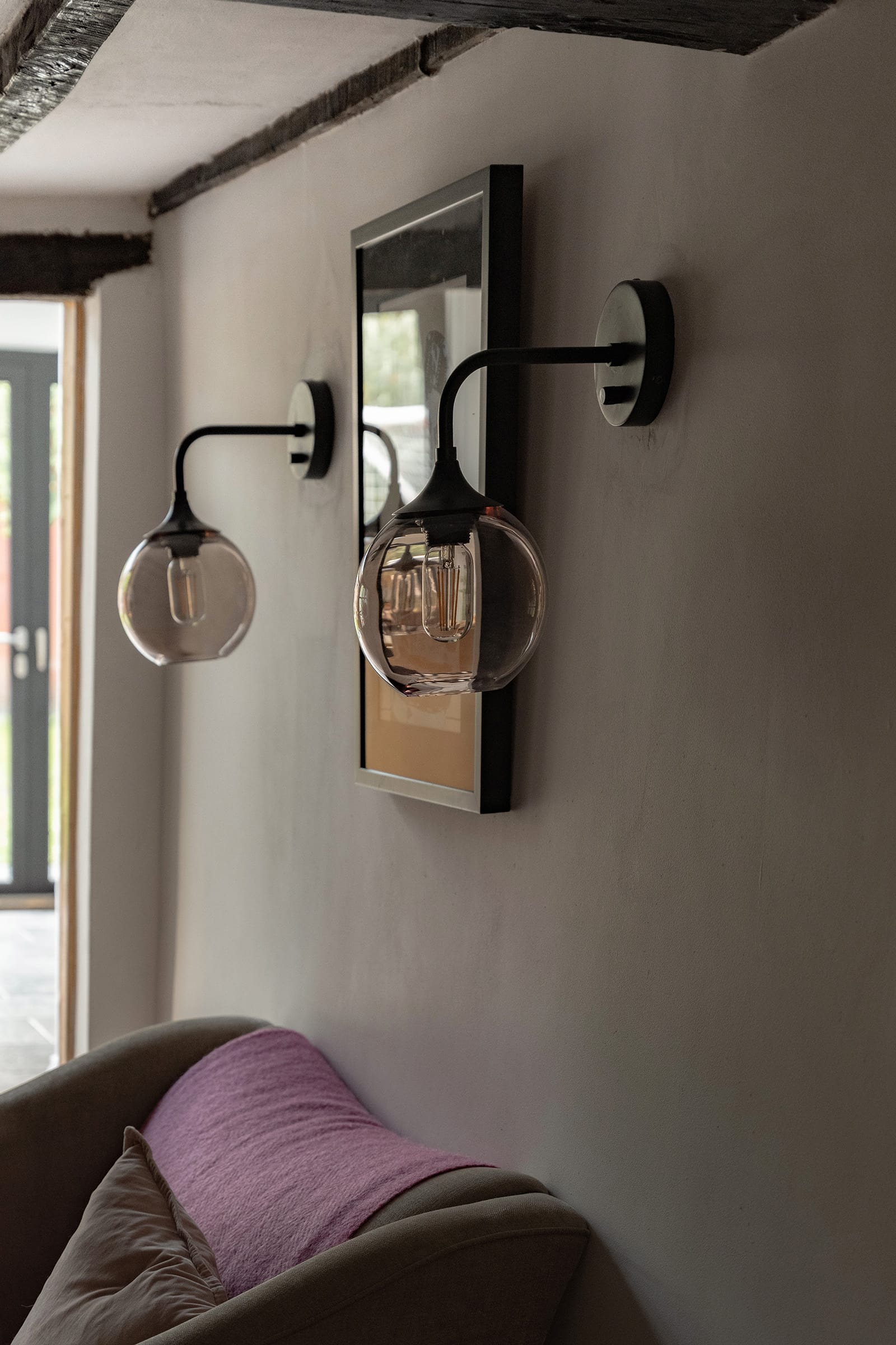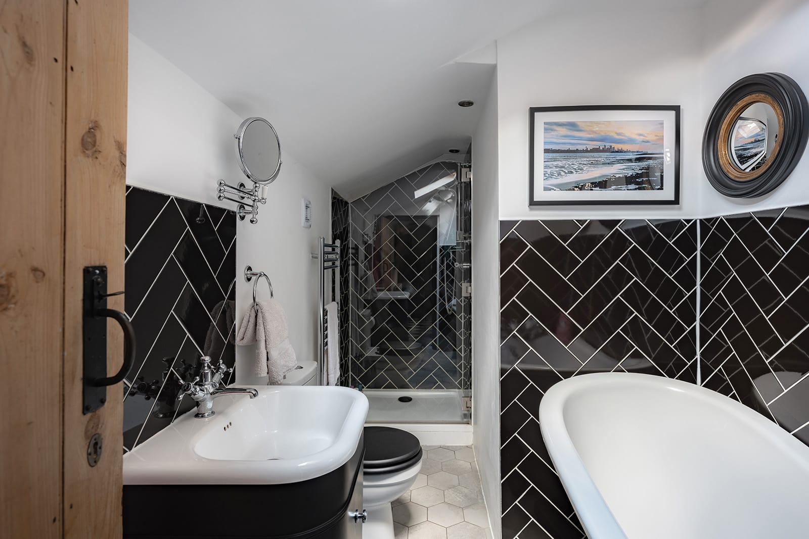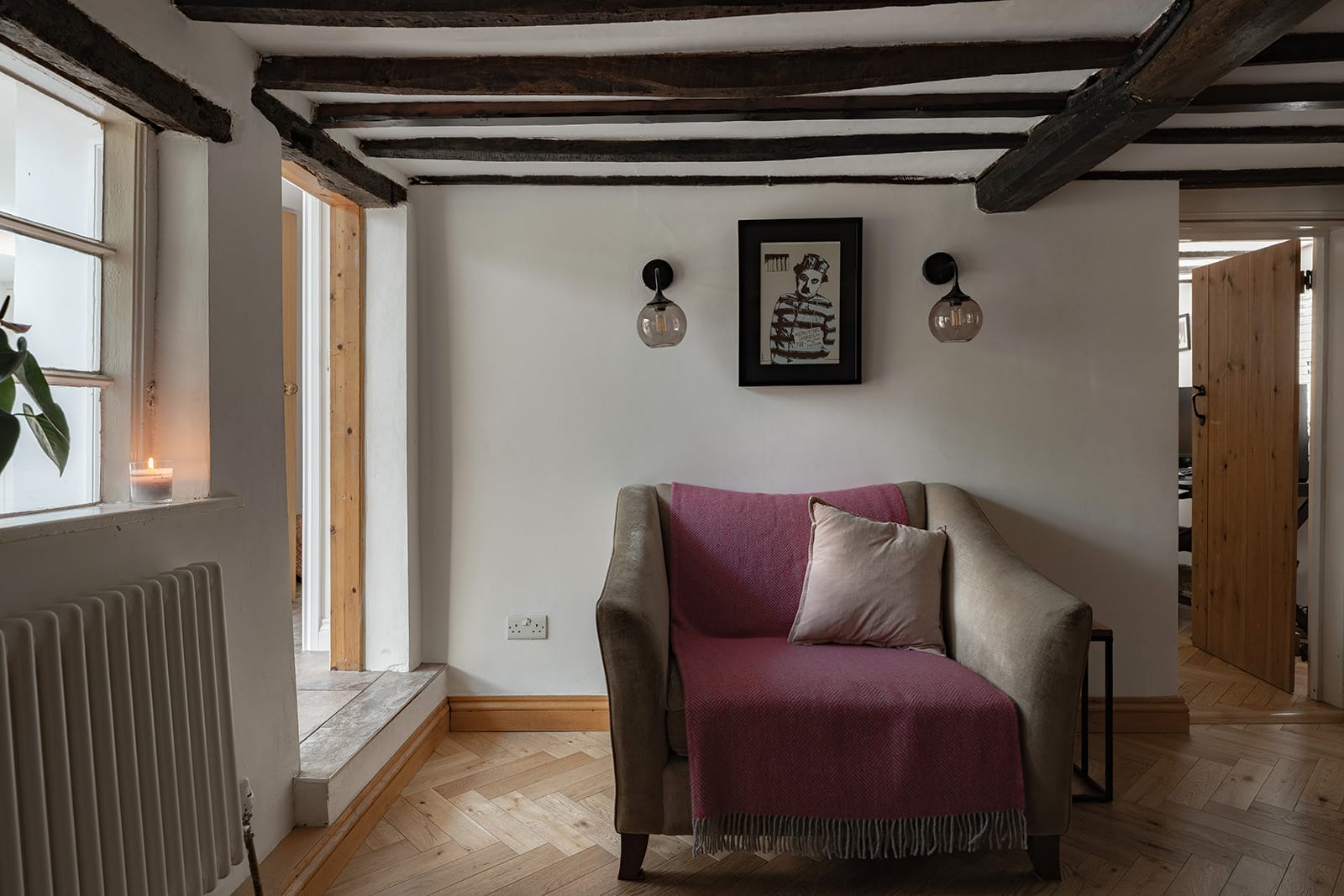 The four bedrooms are arranged across two floors. Upstairs, the principal bedroom is accessed via its own dressing room and enjoys an en suite shower room. A charmingly idiosyncratic window set at low level offers views of the lane from the bed. A second upstairs bedroom features exposed beams and an undulating lathe-and-plaster ceiling. The remaining two bedrooms are on the ground floor, one of which also benefits from its own en suite shower room, and both offering flexibility of use. A family bathroom, designed in a classic black-and-white palette, features a freestanding bath and walk-in shower. There is also a separate utility room.