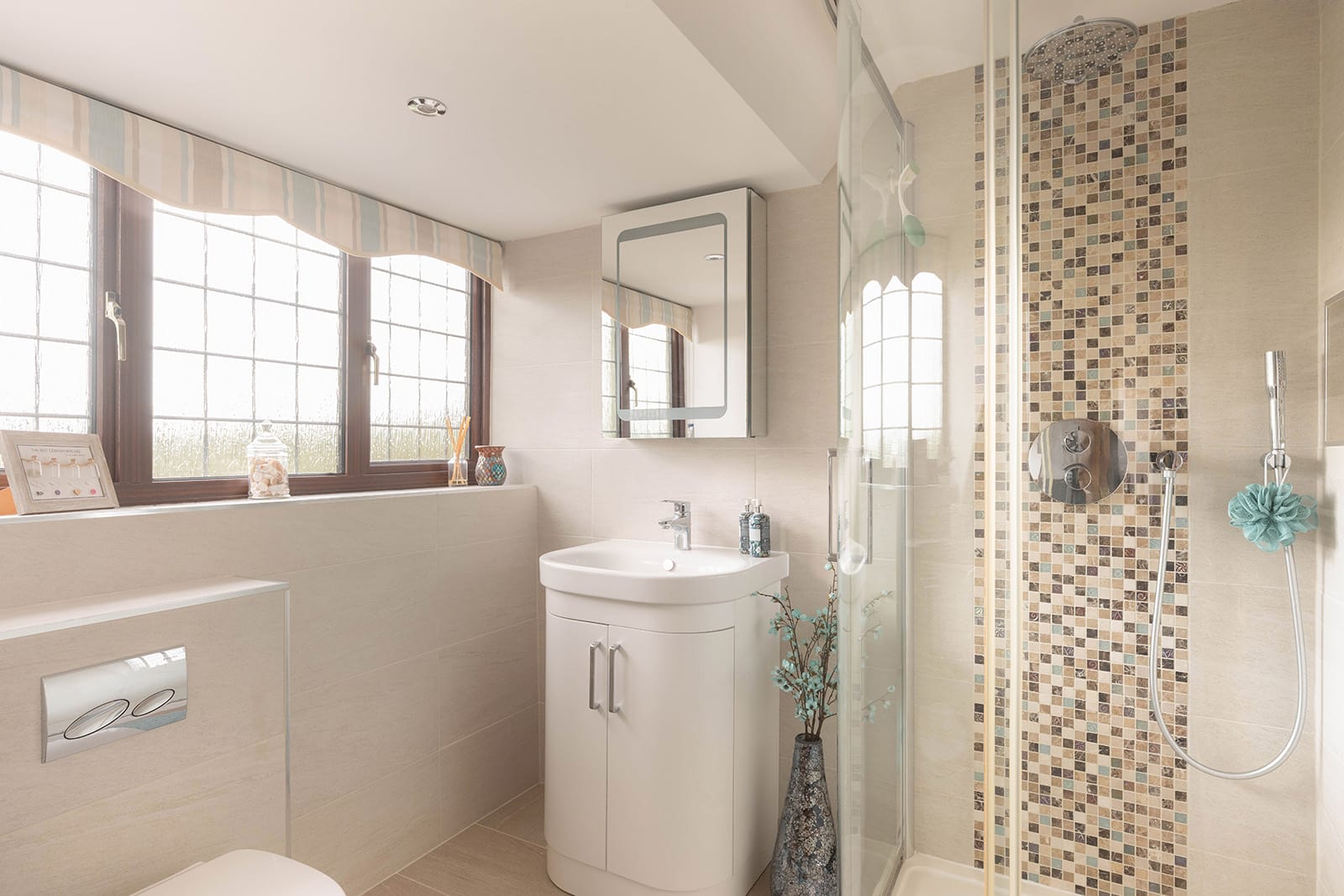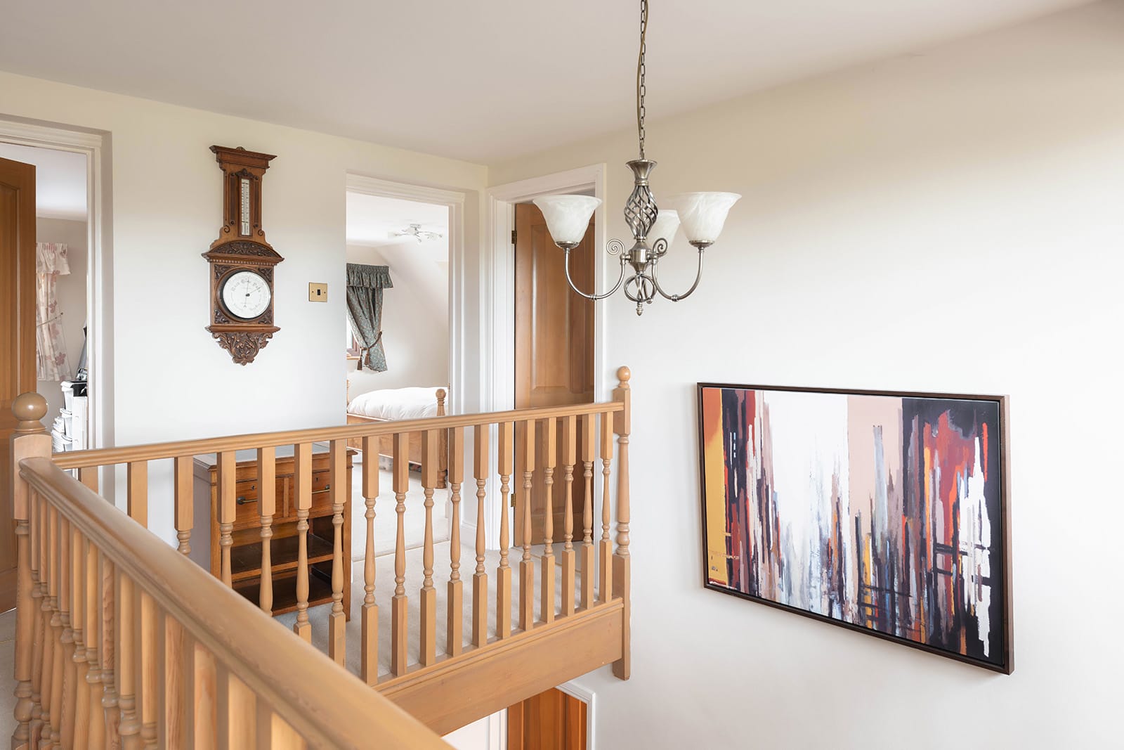 Upstairs, the staircase rises to a beautiful galleried landing – an architectural flourish that lends a sense of openness and ceremony to the first floor. The principal bedroom is quietly luxurious, with fitted wardrobes and a generously appointed en suite featuring both bath and walk-in shower. Three further double bedrooms offer ample space for family and guests, all served by a sleek, modern family bathroom.