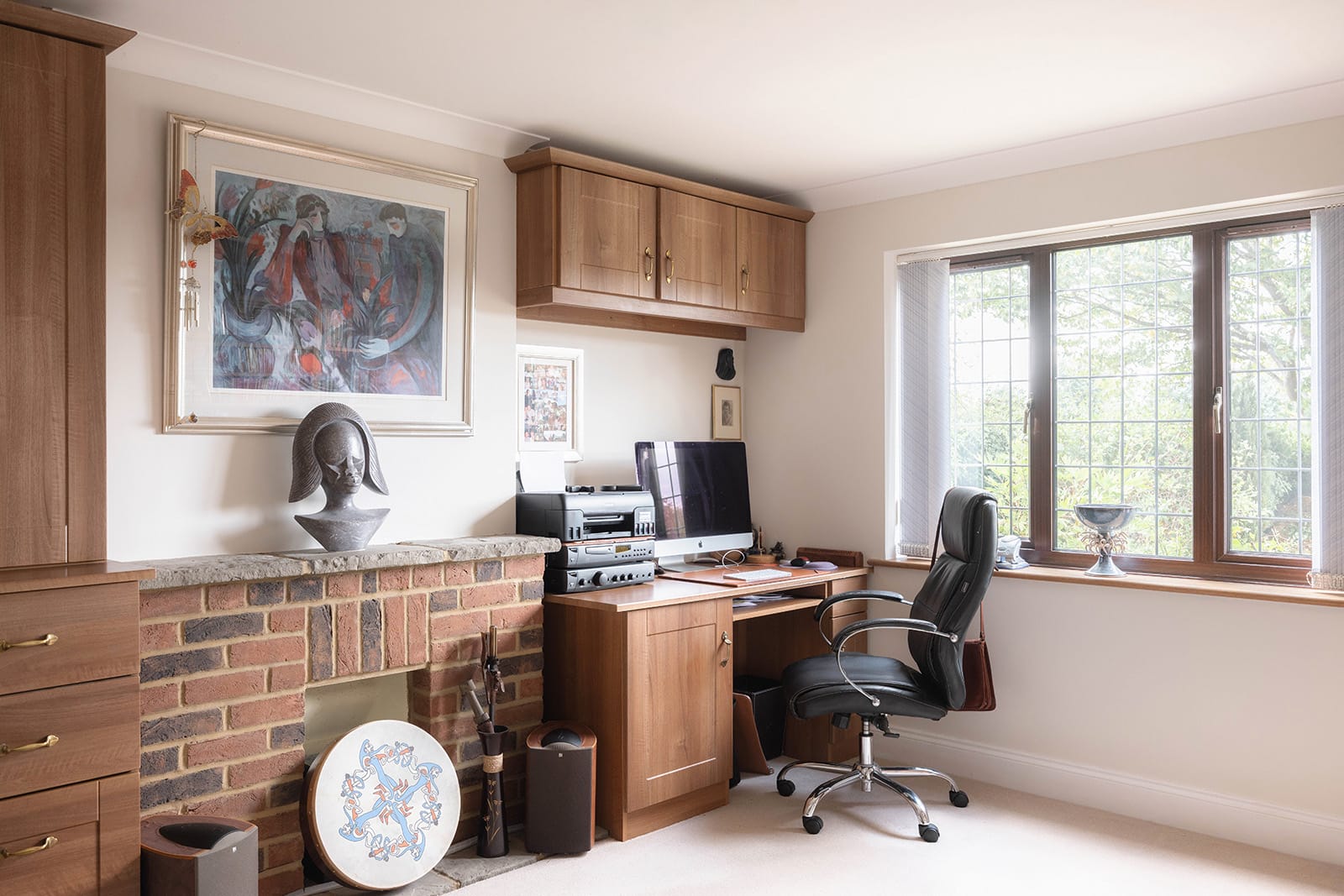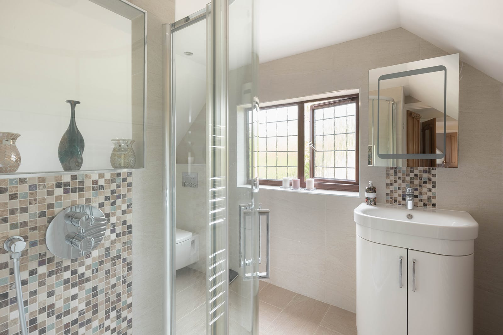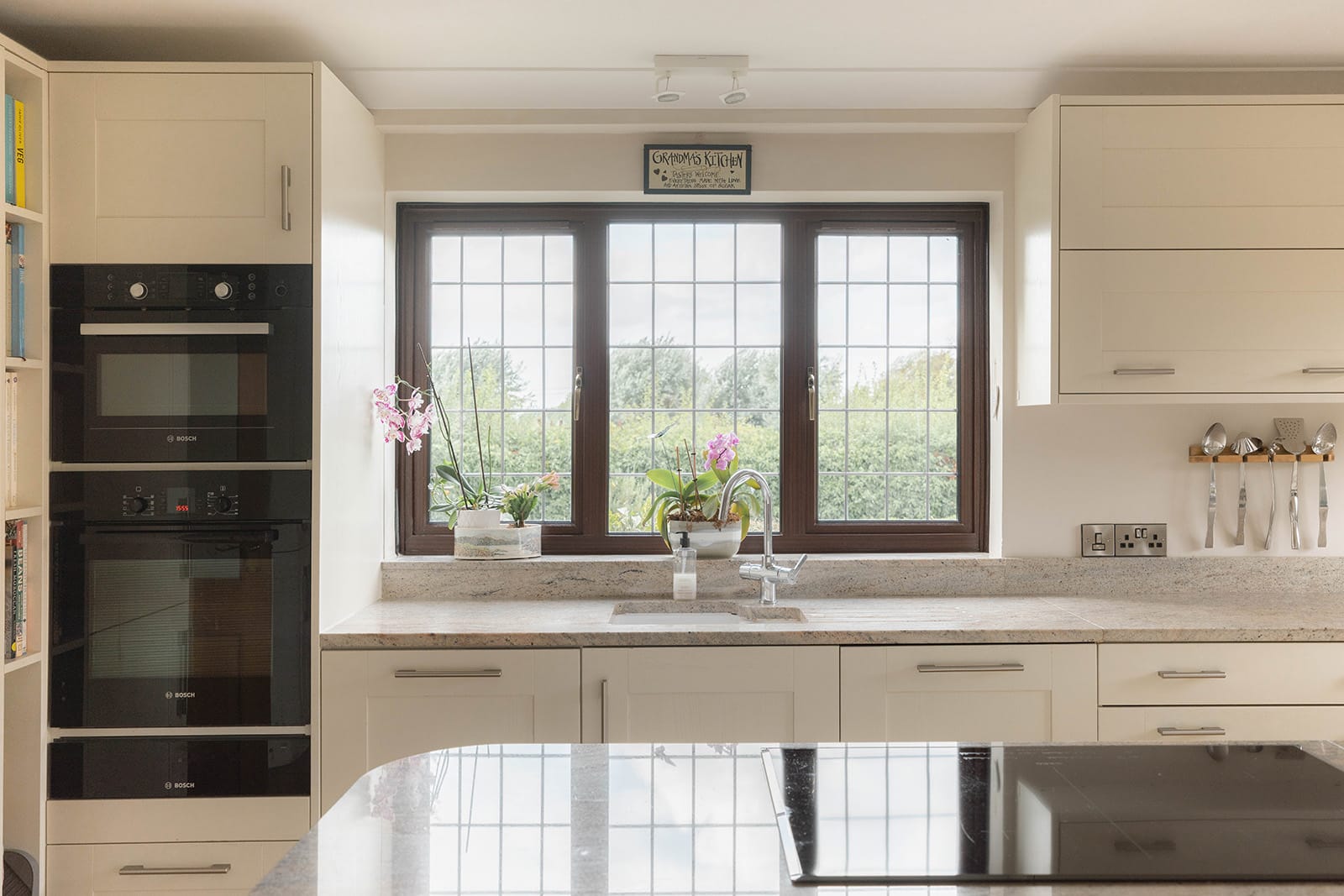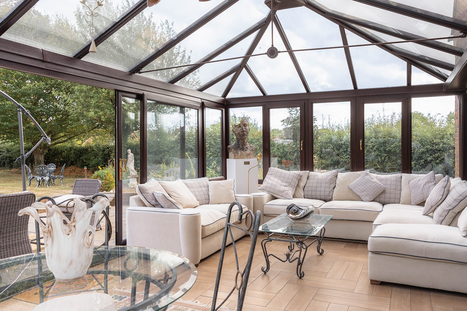 The heart of the home is undoubtedly the open-plan kitchen and dining area, a space that unfolds the full depth of the house. Dual-aspect windows draw in natural light throughout the day, illuminating the quartz worktops, soft-curved cabinetry and ceramic-tiled flooring underfoot. An adjoining utility room adds practical convenience. Flowing through double doors, this space extends into the sitting room, then to a striking conservatory, where full-height glazing frames long, uninterrupted views across the garden to Ivinghoe Beacon beyond. Underfloor heating and a discreet remote-controlled ceiling fan ensure year-round comfort.