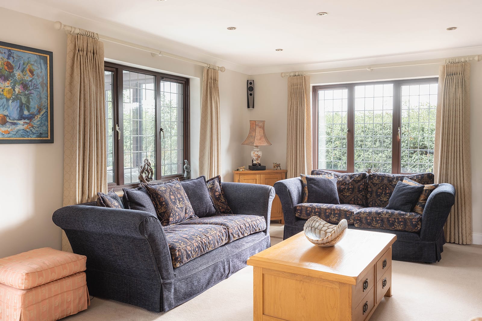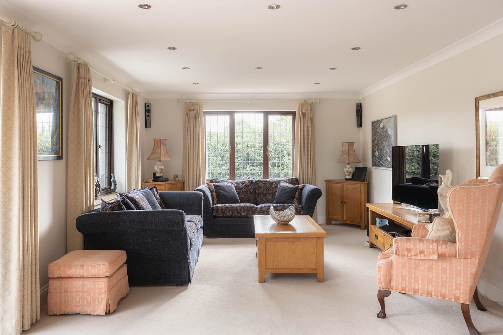 Inside, a generous hallway forms the spine of the home, leading to a series of well-proportioned reception rooms. The sitting room provides a formal yet inviting space, while a second reception room, currently used as a family room, offers flexibility for use as a home office or snug.