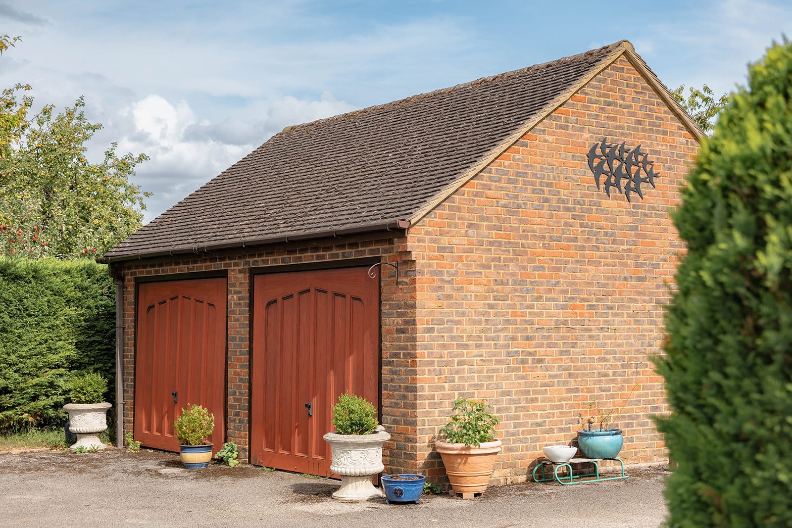 To the front, a long private driveway offers plenty of parking and leads to a double garage with electric doors and loft storage above. A garden shed and wood store complete the exterior.