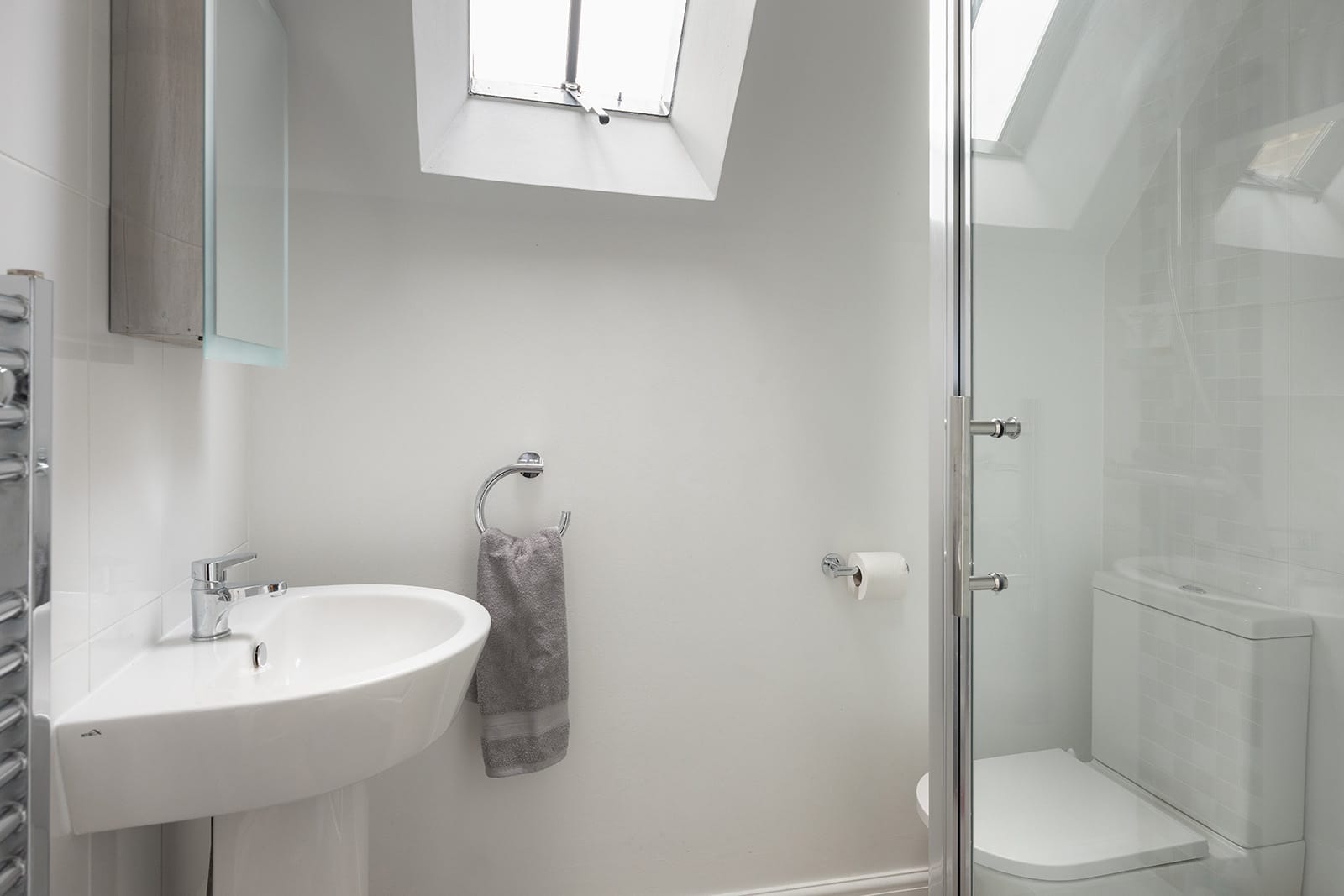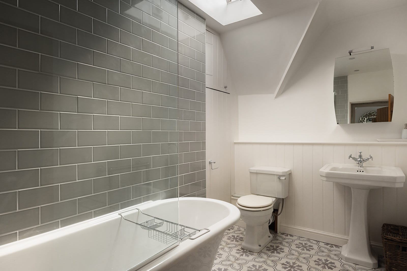Upstairs, the layout is cleverly split by a bifurcated staircase. One wing holds the principal bedroom, with its own en suite and built-in wardrobe, along with a fourth bedroom ideal for guests or as a study. The opposite wing hosts two further bedrooms and a family bathroom, dressed in traditional Victorian-style fittings and soft, understated tiling.