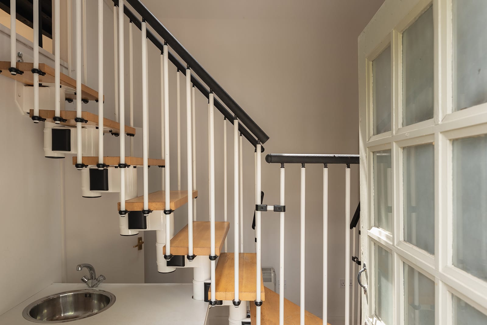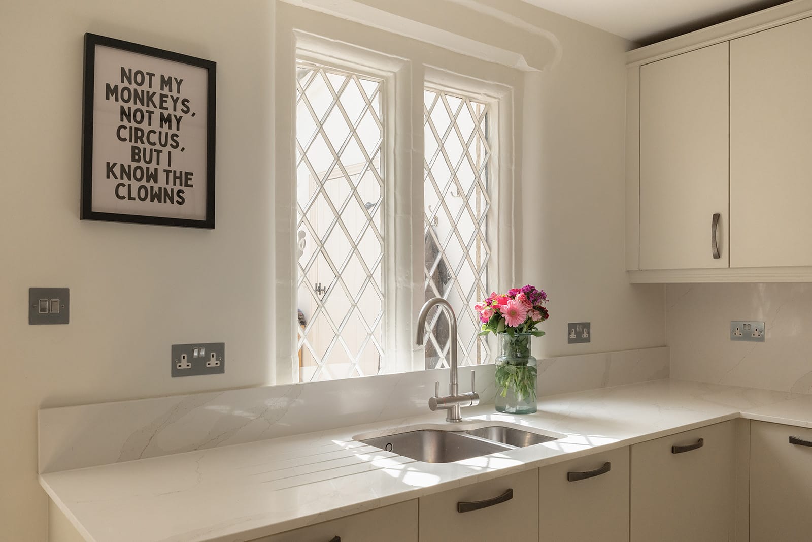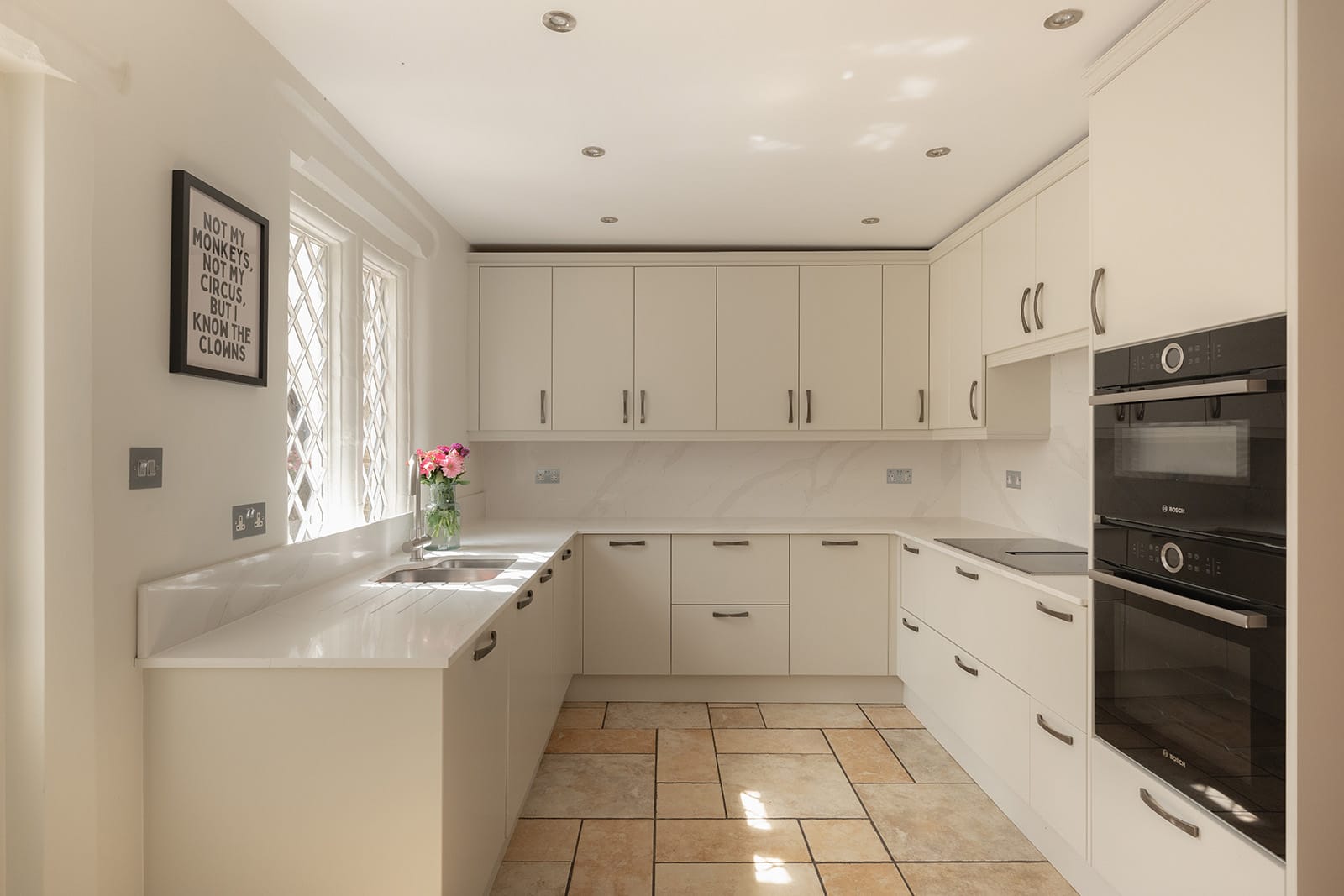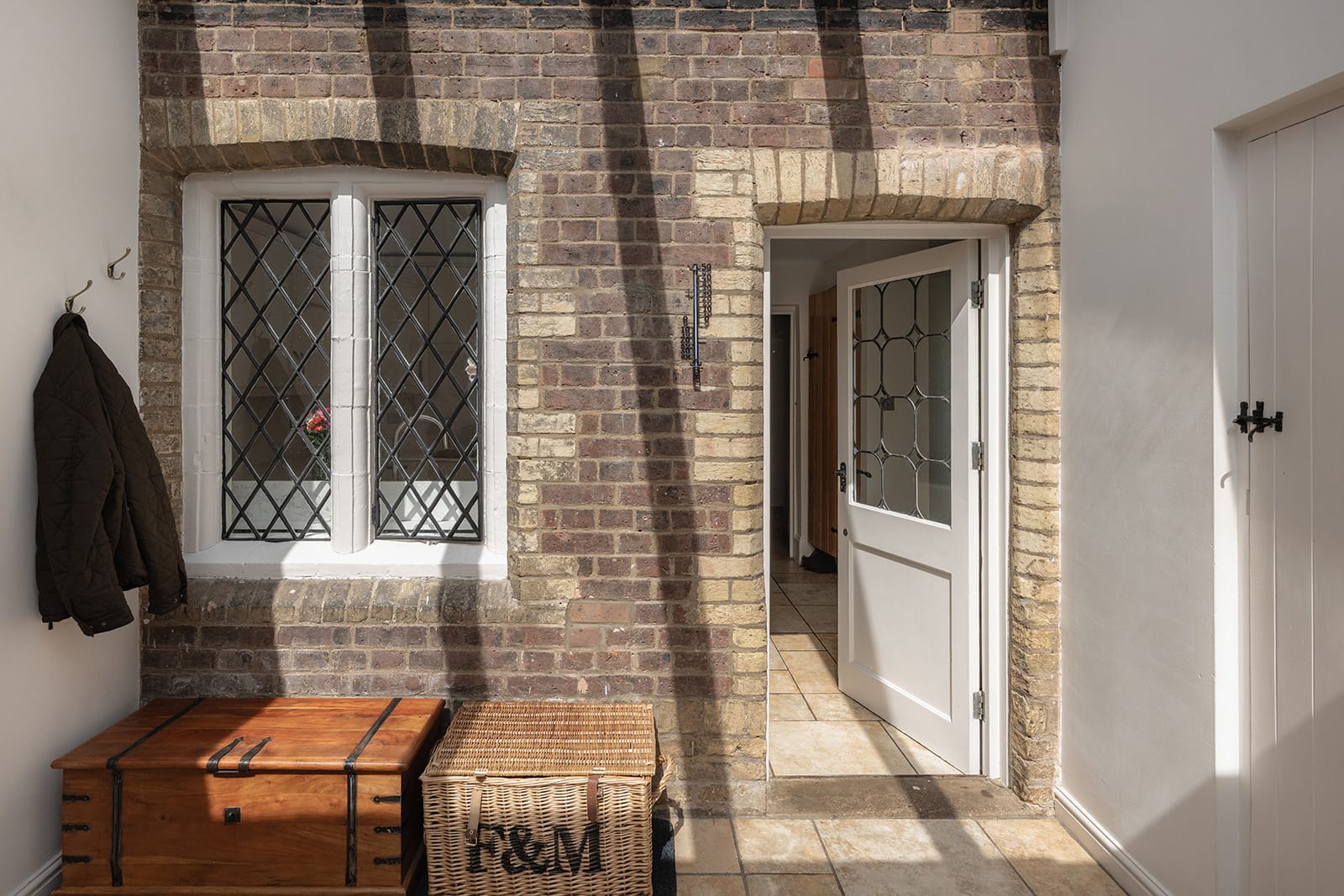 The kitchen provides a crisp counterpoint. Here, contemporary white cabinetry and stone worktops bring clarity and simplicity, offering a more modern rhythm without ever feeling out of place. Adjoining it, a single-storey garden room holds a moment of architectural storytelling: the original exterior brick wall, now an internal feature, subtly reveals the house’s layered evolution. This garden room leads to both a utility room and a cloakroom – practical, discreet and entirely in keeping.