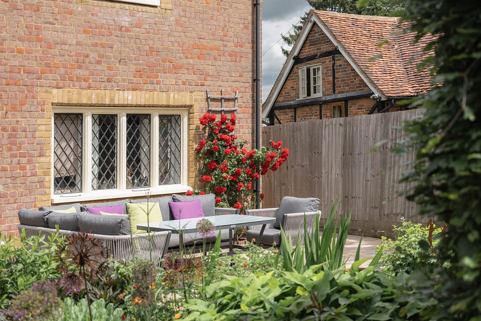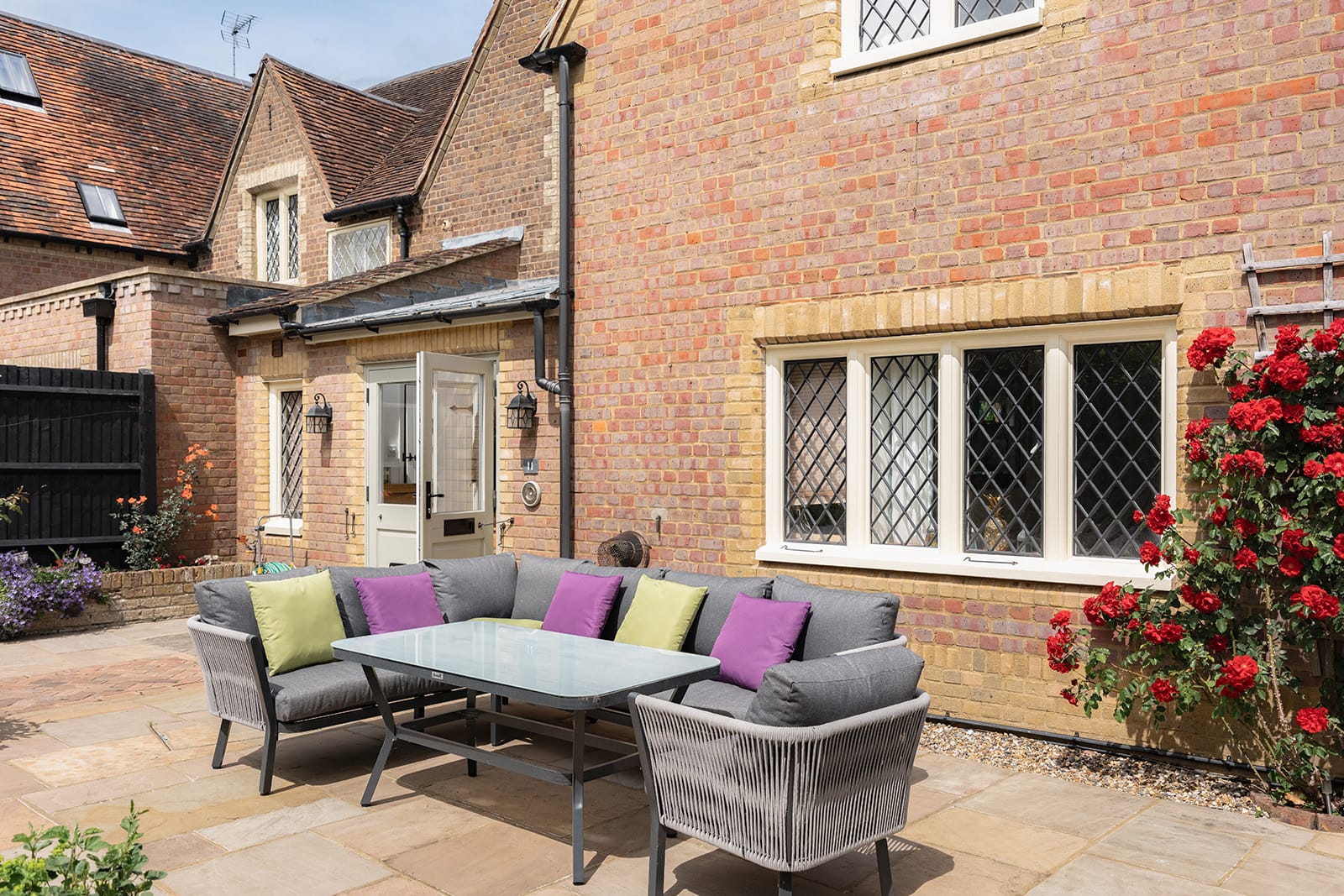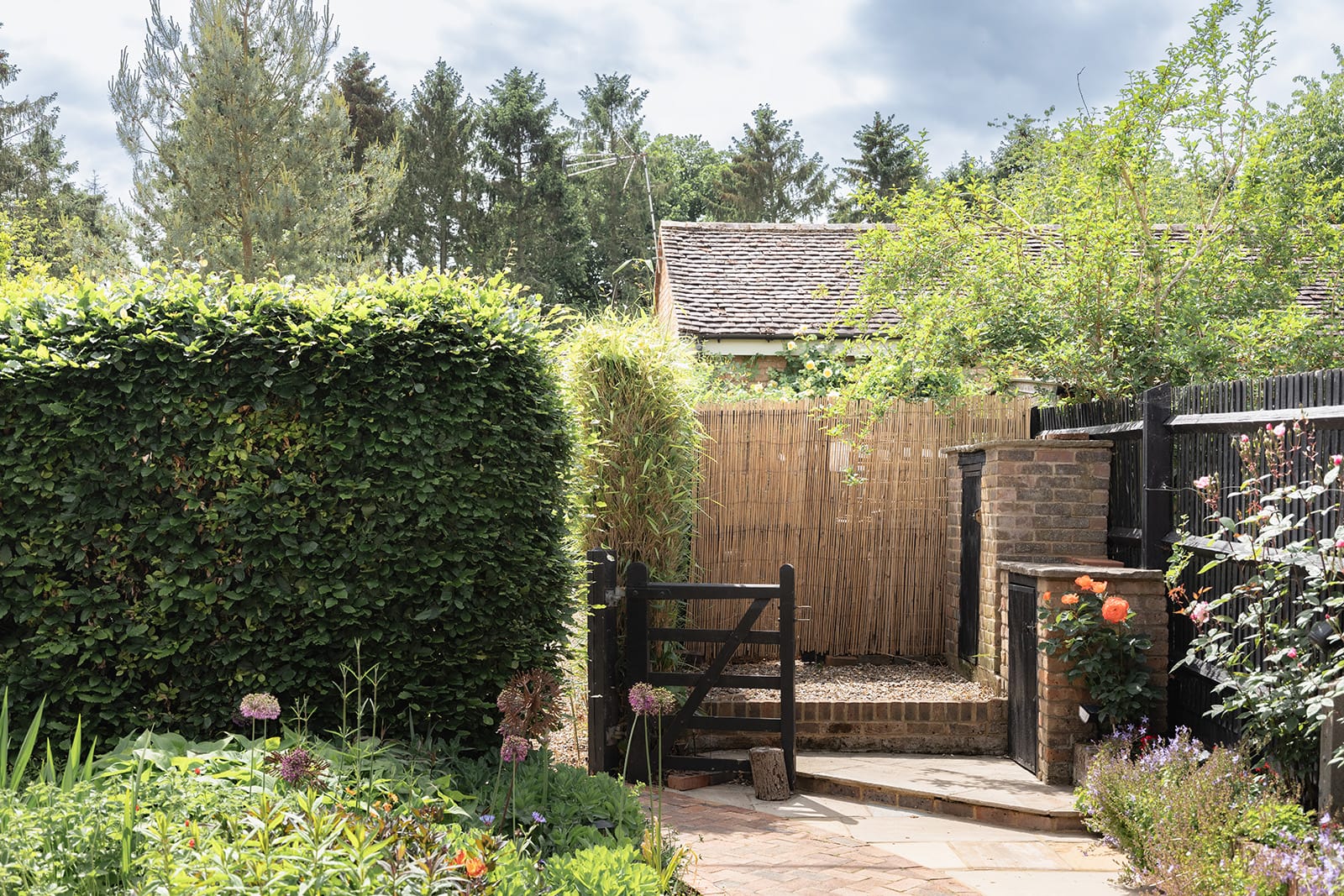To the rear, a south-westerly facing garden offers a more structured outdoor room: paved, intimate and perfect for alfresco gatherings. Here, bamboo lends movement and privacy, while a striking red rose climbs across the rear elevation. Hardy perennials flower deep into autumn, while pots of annuals and a long flower wall, thick with geraniums, impatiens and wallflowers, bring brightness and life to this secluded suntrap.