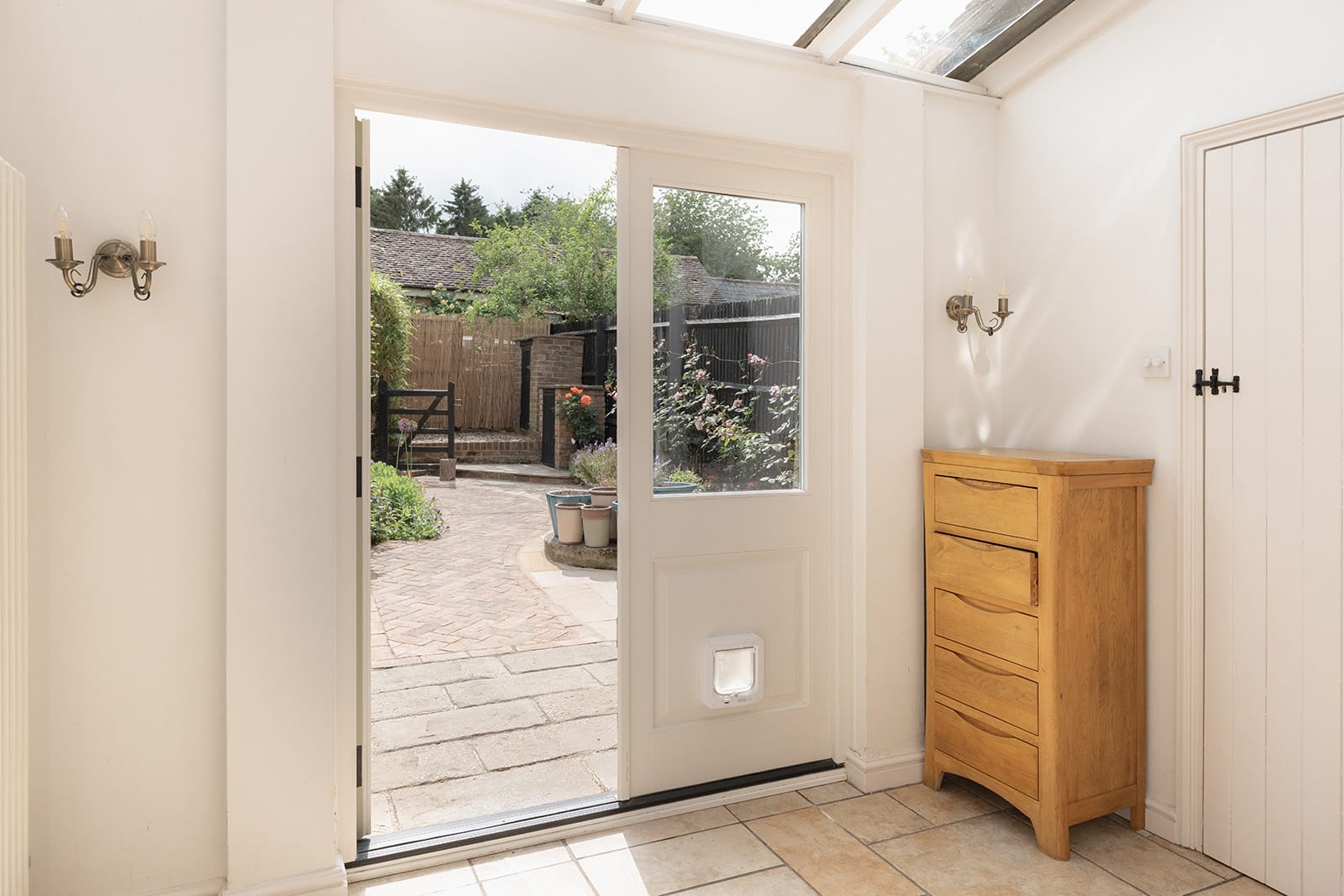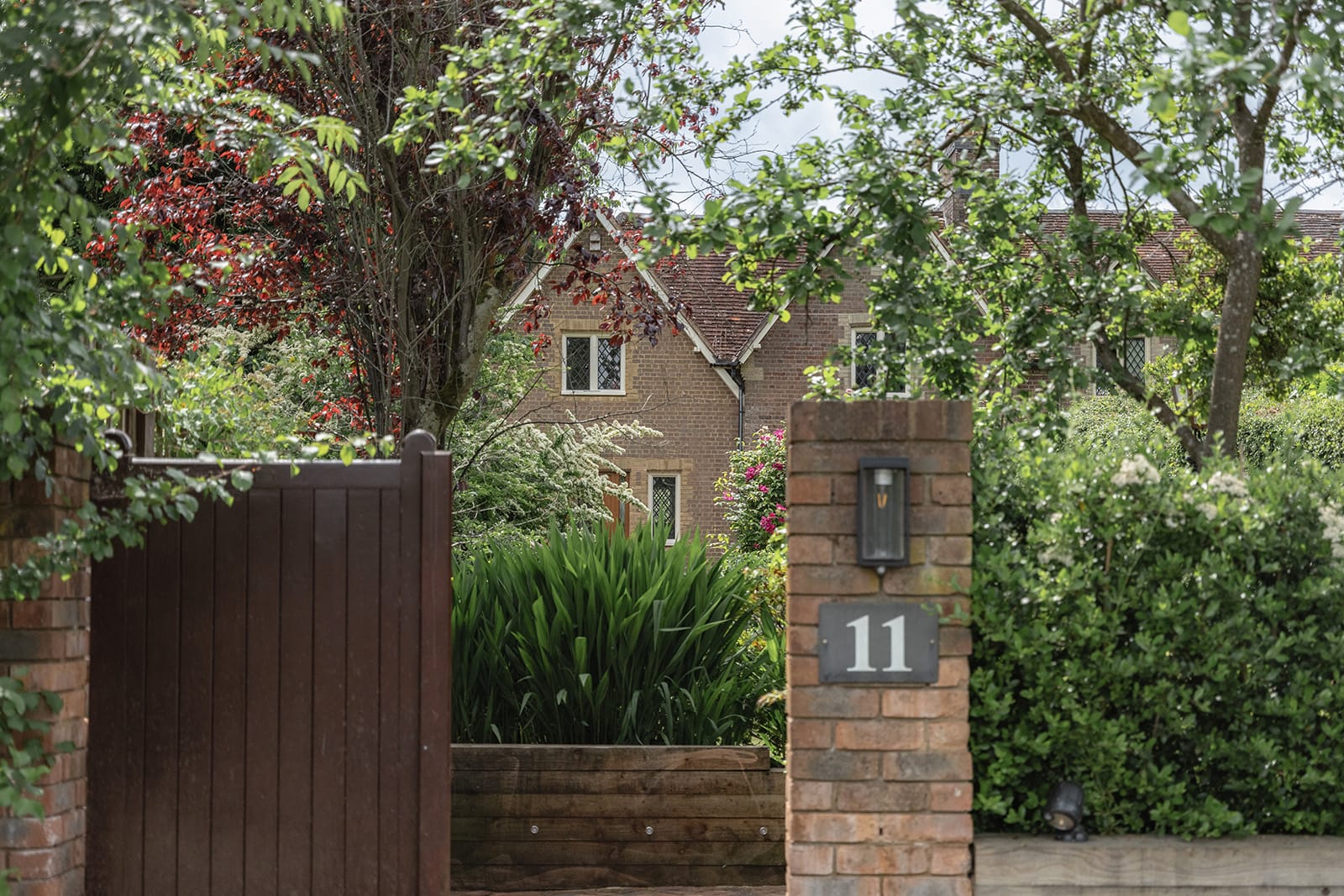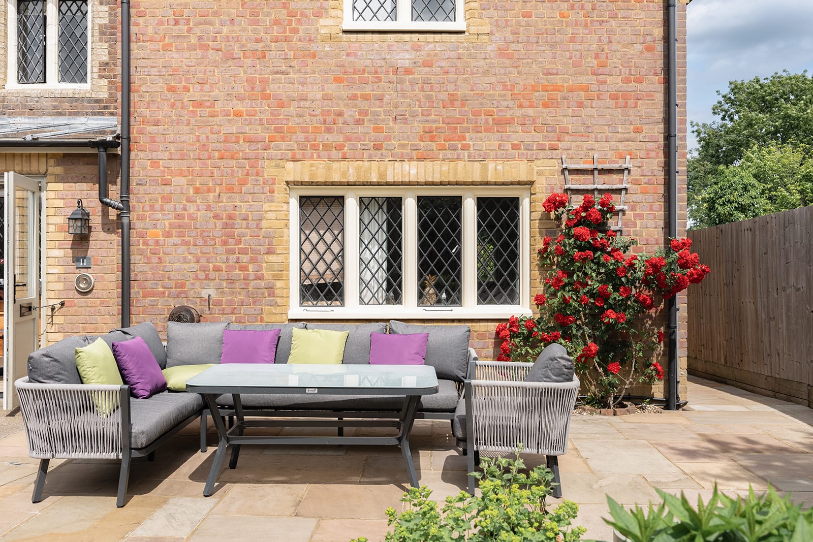 To the rear, a south-westerly facing garden offers a more structured outdoor room: paved, intimate and perfect for alfresco gatherings. Here, bamboo lends movement and privacy, while a striking red rose climbs across the rear elevation. Hardy perennials flower deep into autumn, while pots of annuals and a long flower wall, thick with geraniums, impatiens and wallflowers, bring brightness and life to this secluded suntrap.