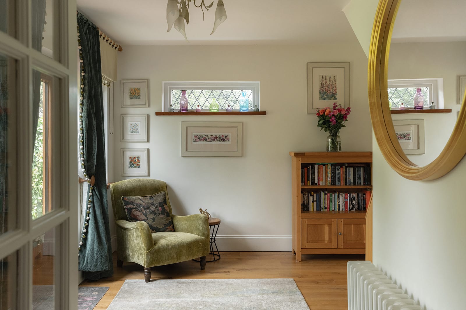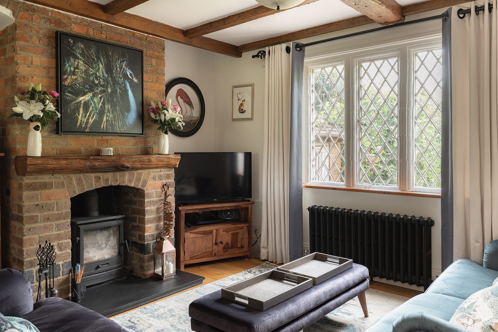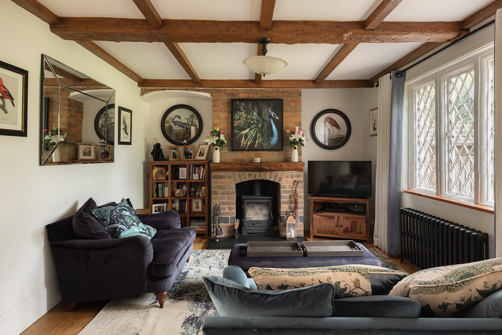 Inside, the house is filled with natural light. The reception hall functions as a snug or informal family room. Beyond this is a warm and grounded sitting room, with exposed ceiling beams and a fireplace, now home to a woodburner that anchors the room with both literal and aesthetic warmth.