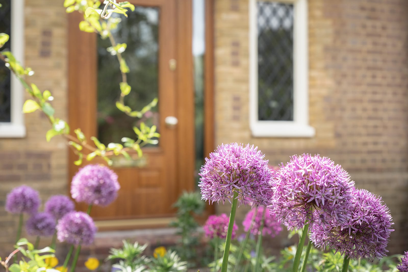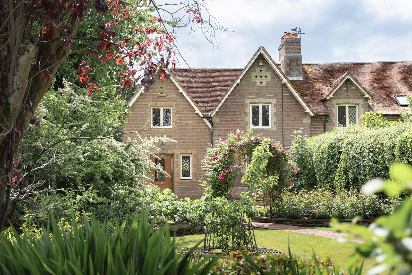 The front garden – a rare and ravishing space – extends some 100ft and is a vivid, living tapestry, flanked by mature hedgerows and punctuated by vibrant purple alliums, soft pink rhododendrons and exuberant roses. A meandering brick path passes beneath an arched trellis, heavy with fragrant Gertrude Jekyll roses and clematis. Around it, flower beds unfurl with colour through the seasons; from the earliest snowdrops and crocuses in January to drifts of tulips, azaleas and Harlow Carr roses in summer. Ancient damson and apple trees lend height, history and autumn fruitfulness. It is the sort of garden that feels both lovingly curated and happily overgrown, like something from a children’s storybook, or a memory softened by time. It offers privacy, joy and a sense of being held; like lying back into a bed of rose petals; soft, fragrant and completely enveloping.