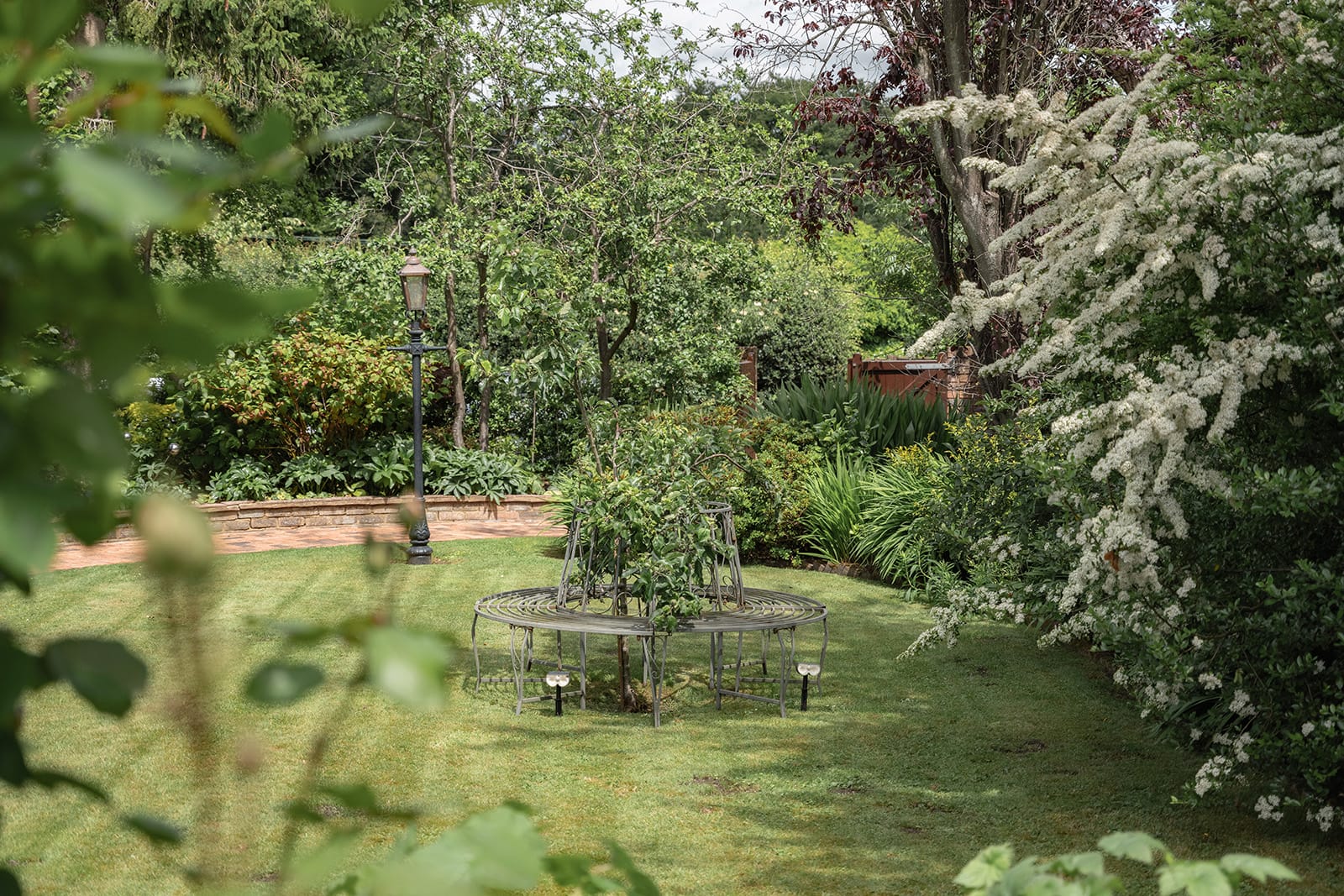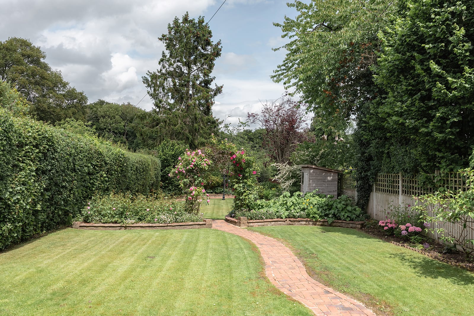 Lush 100ft garden with winding brick path and mature planting