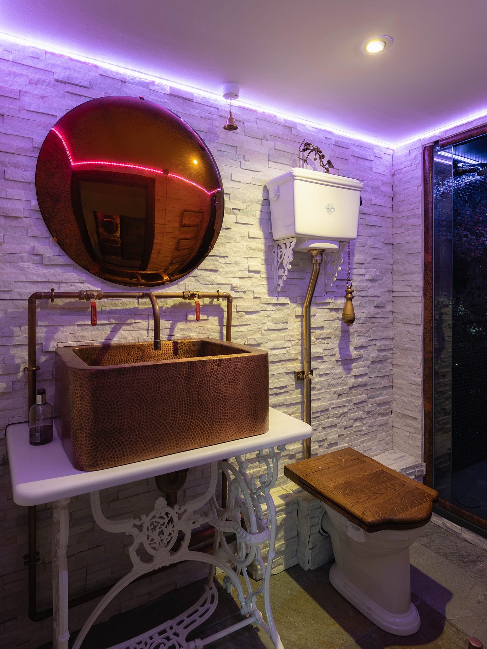 That ground-floor shower room is a theatrical counterpoint to the home’s otherwise restrained palette: a space of rich detailing and moody lighting, complete with an oversized copper basin, high-flush WC and a walk-in shower set against dark mosaic tiles. Fibre-optic lights bring a touch of celestial drama which is more boutique hotel than suburban home.
