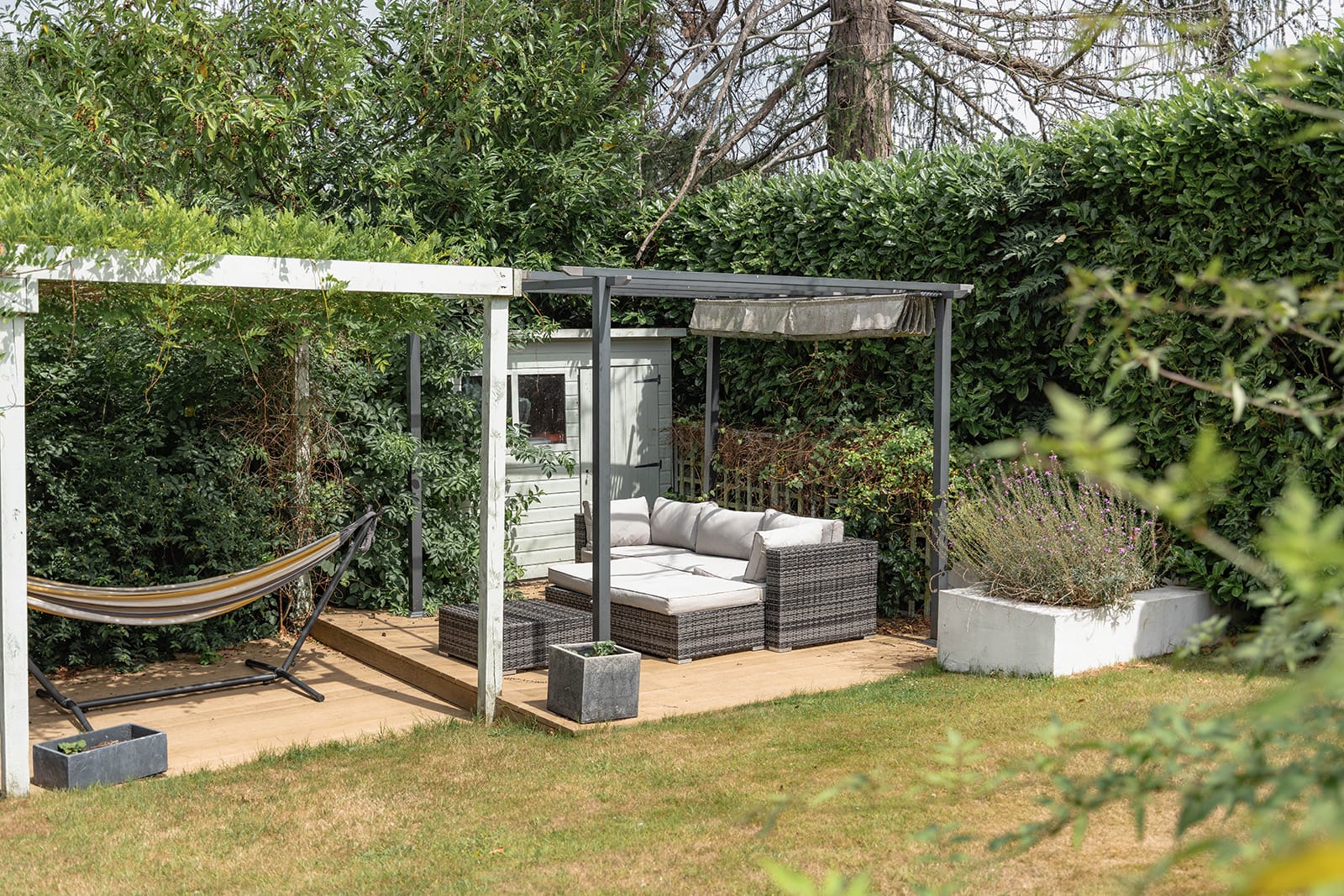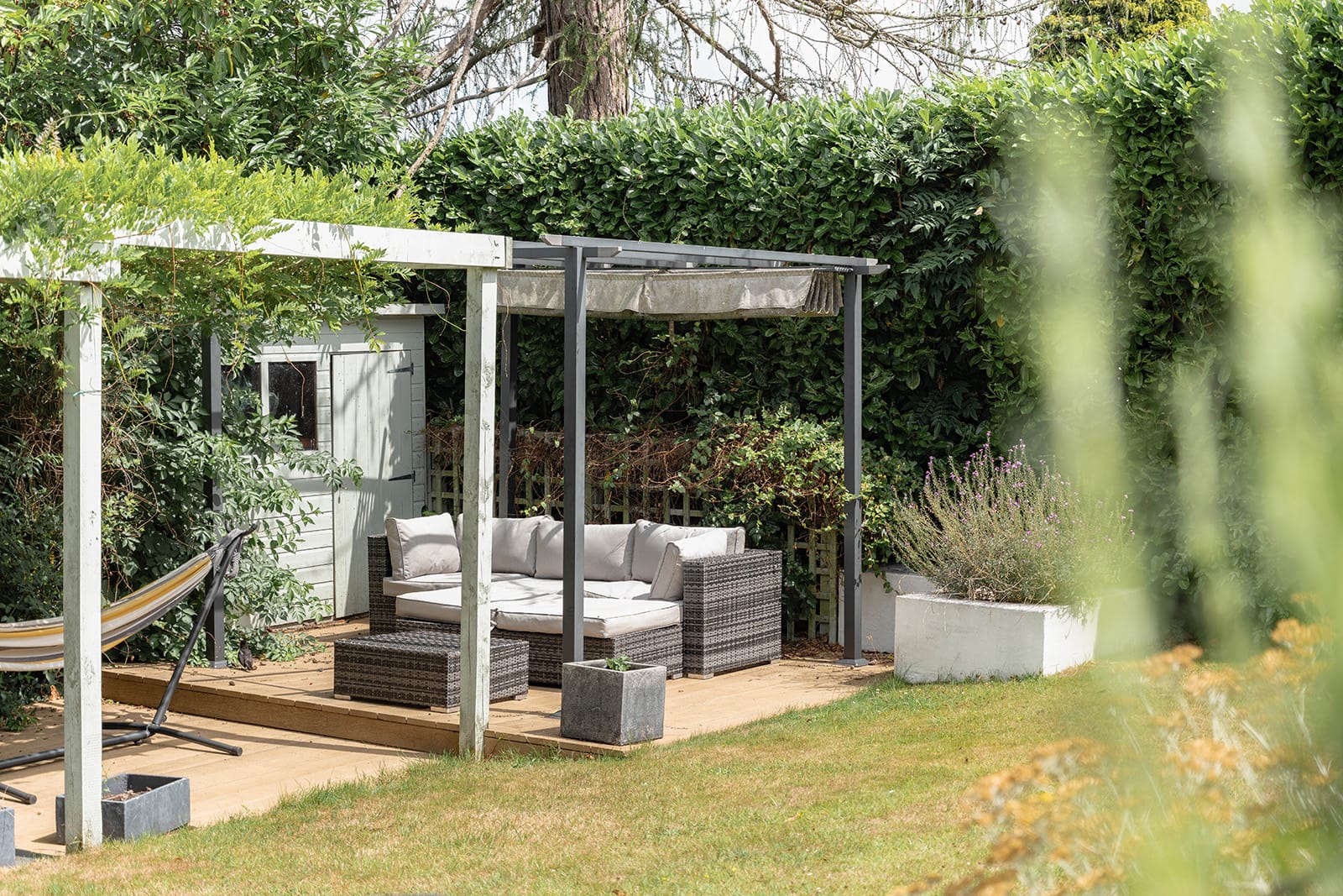 Outside, the south-easterly facing garden is quietly uplifting. Mature hedgerows offer privacy, while layered planting and herbaceous borders bring texture and seasonal colour. A full-width decked terrace runs along the rear elevation, forming a generous outdoor room for dining or relaxation. A veranda offers a secondary space for reading or quiet reflection, while the garden shed provide useful storage.