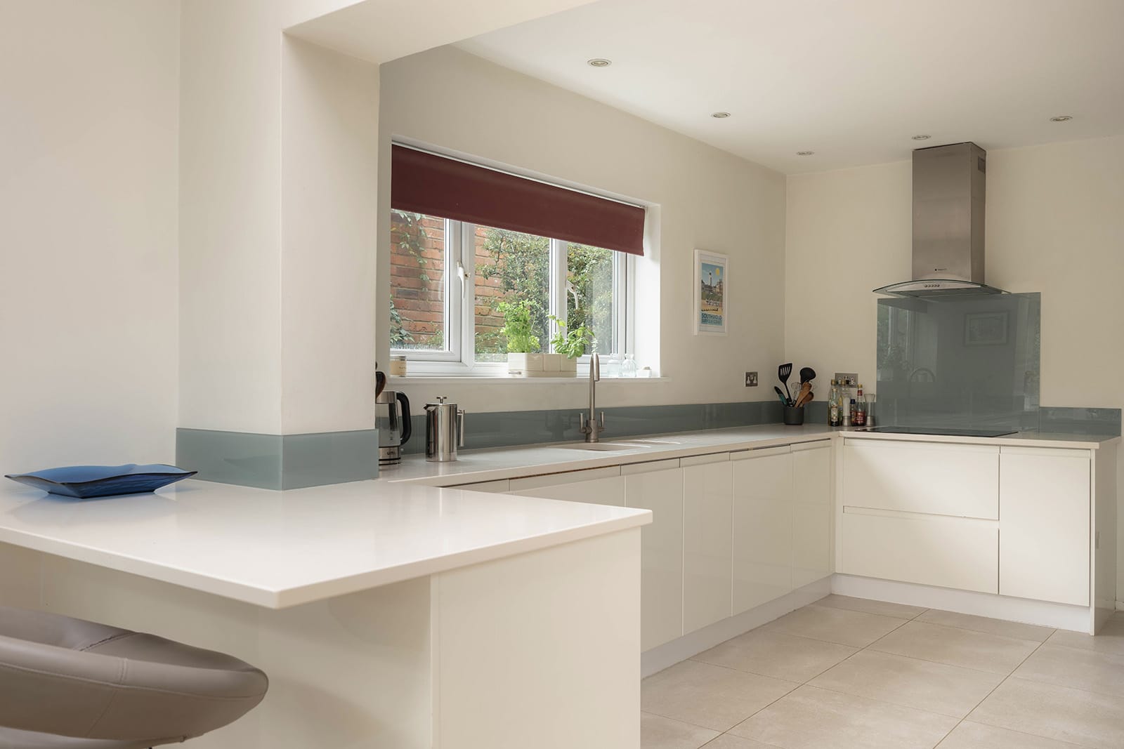 The kitchen is understated and refined, with streamlined cabinetry, crisp white stone worktops and a breakfast bar for informal dining. It flows seamlessly into the family room beyond, which in turn blends into the dining room, all creating a harmonious sequence of sociable rooms.