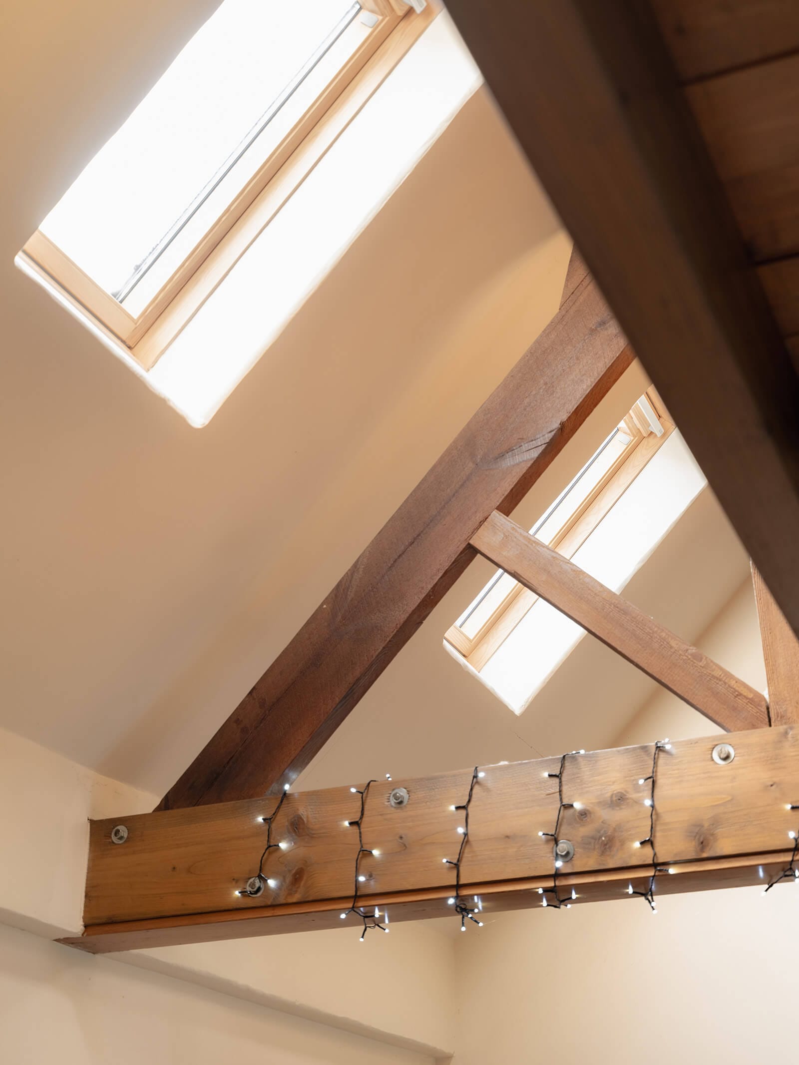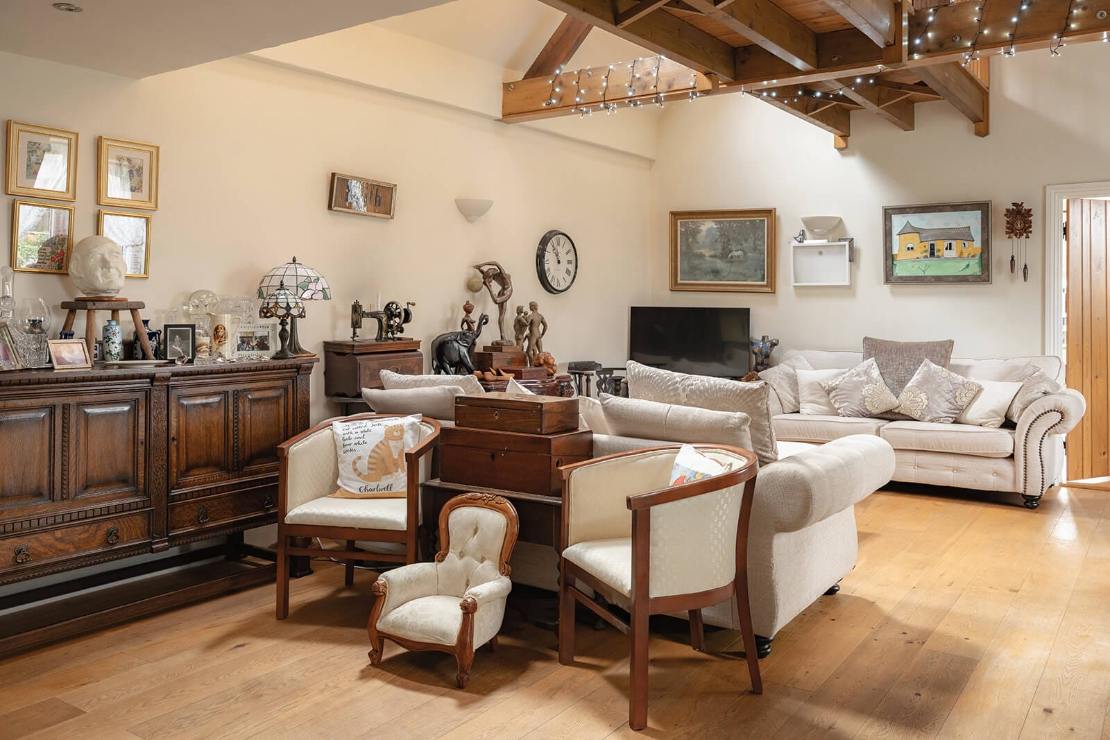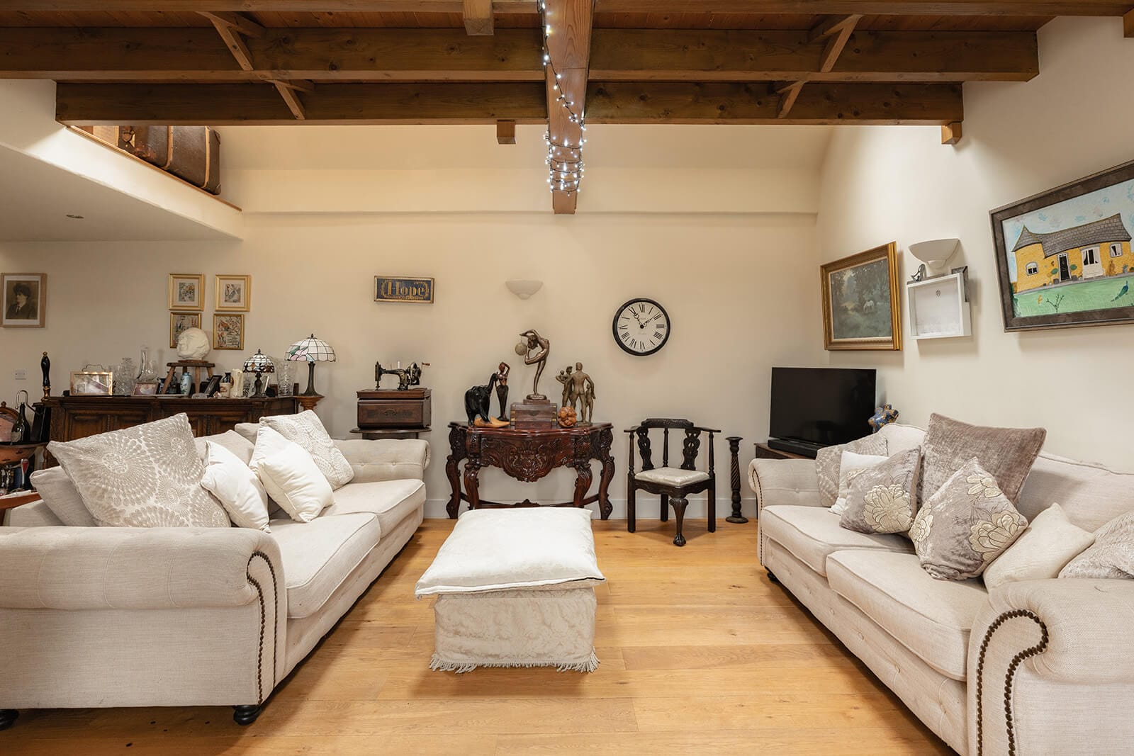 The entrance hall leads directly into the heart of the house: a striking open-plan sitting and dining room defined by its soaring vaulted ceiling rising over 17ft. Exposed oak beams, oak flooring and a remarkable sense of vertical space give the room architectural presence. Skylights above flood the interior with natural light, while a mezzanine bridge overhead adds both character and visual drama – a reminder of the building’s former life.