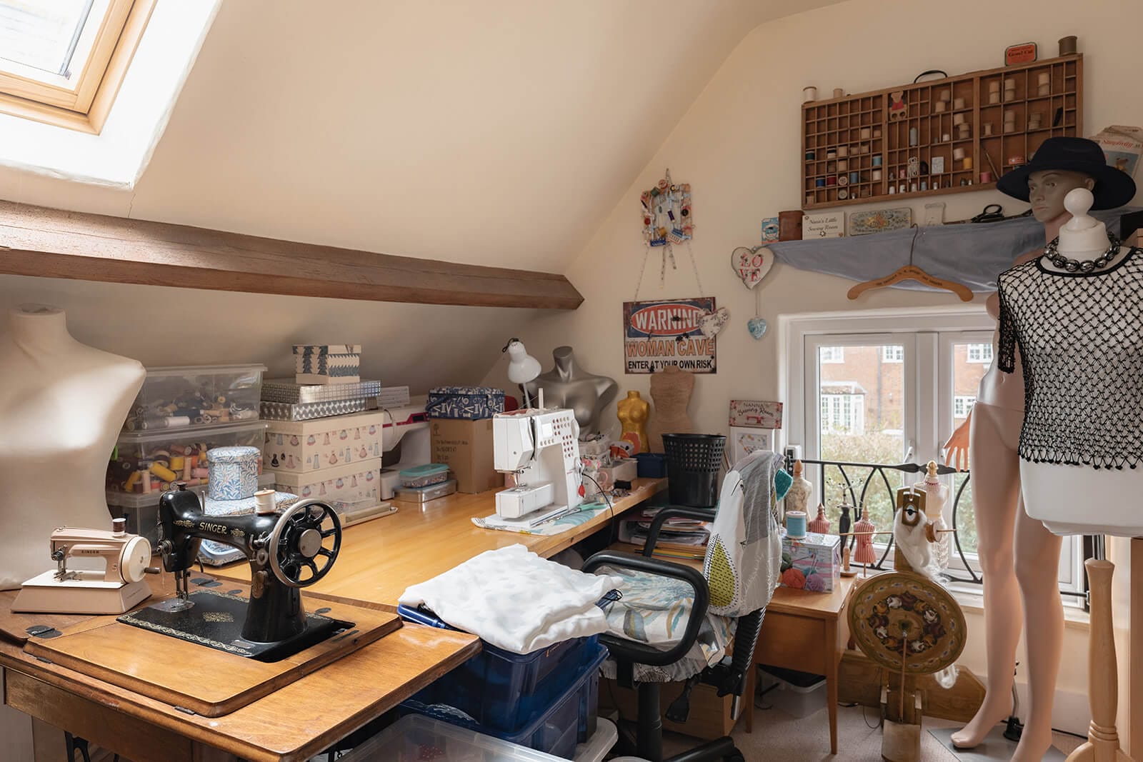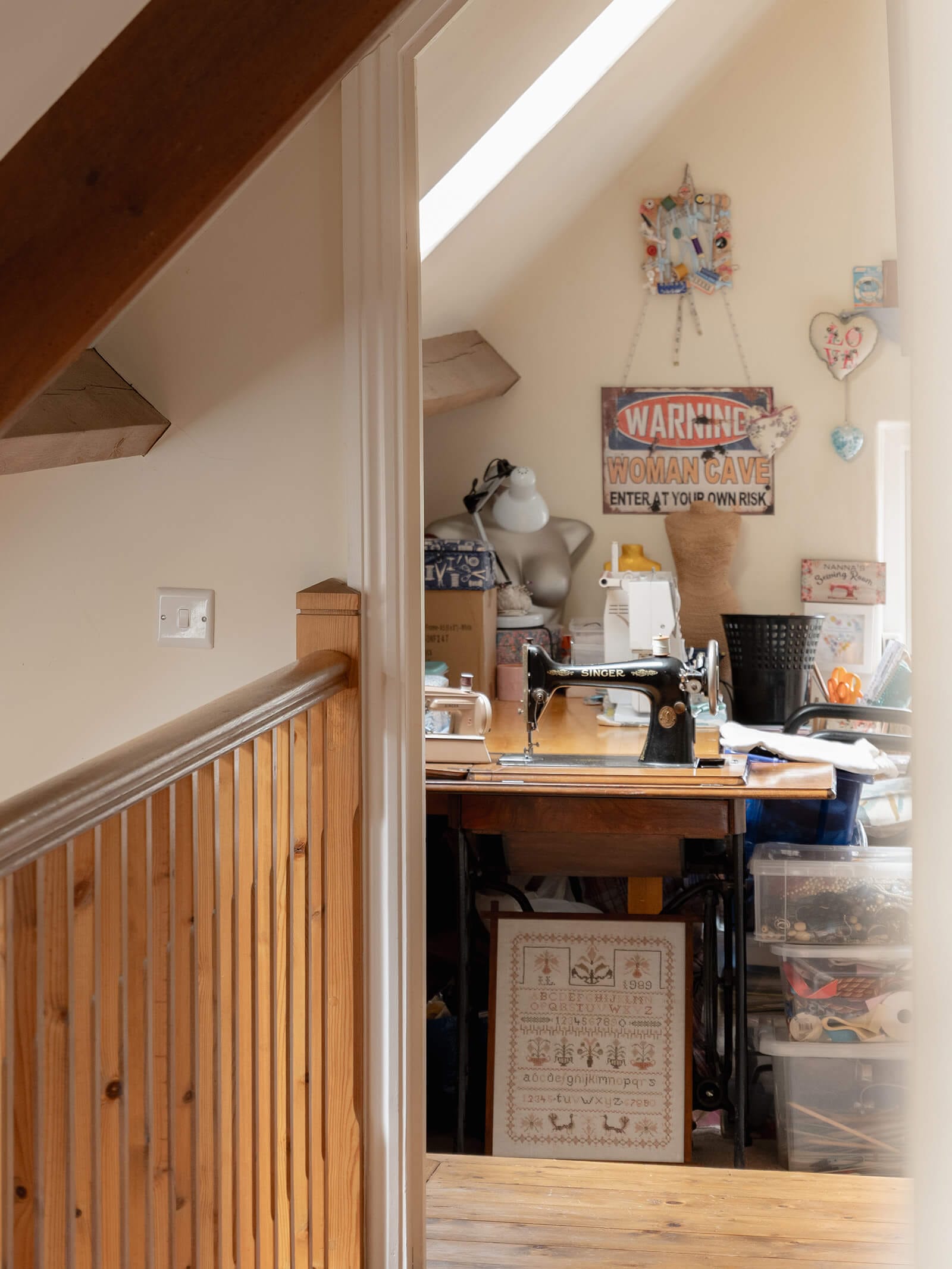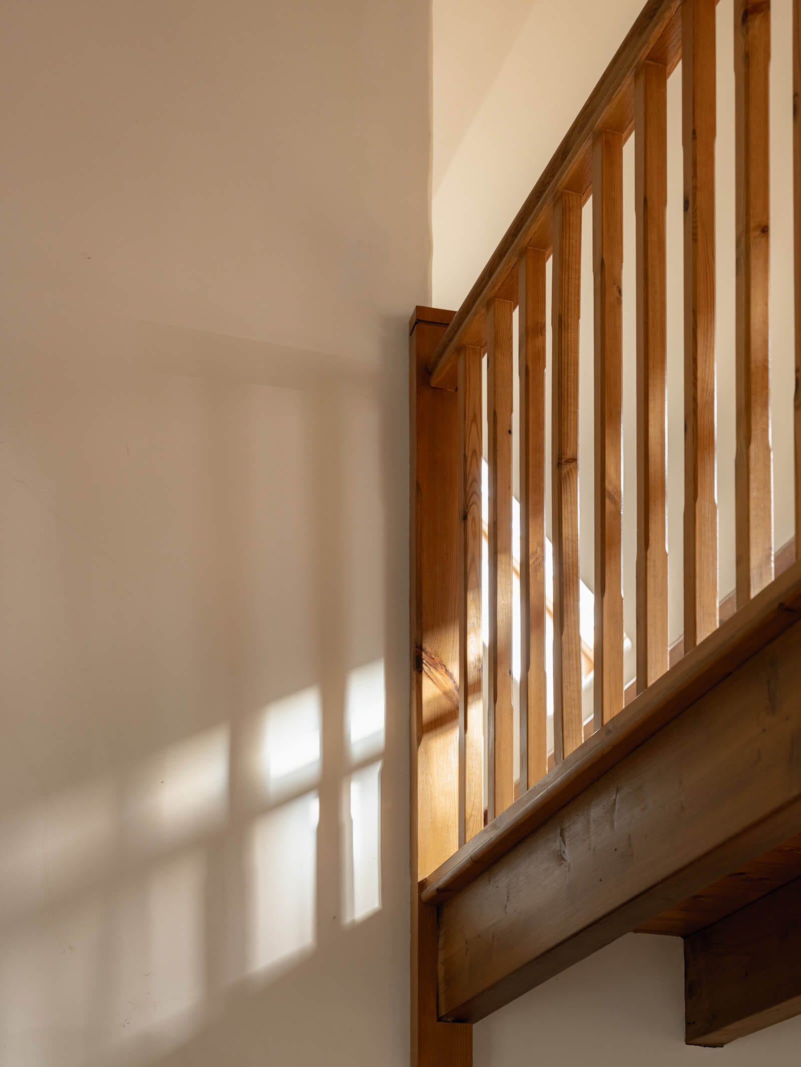 Stairs rise from the main living space to the first floor, where the mezzanine bridge and landing create a distinctive architectural moment. Two further double bedrooms are arranged on this level, one accessed along the walkway. Both are generous in proportion and are served by a family bathroom. The landing area also doubles as a pretty study area.