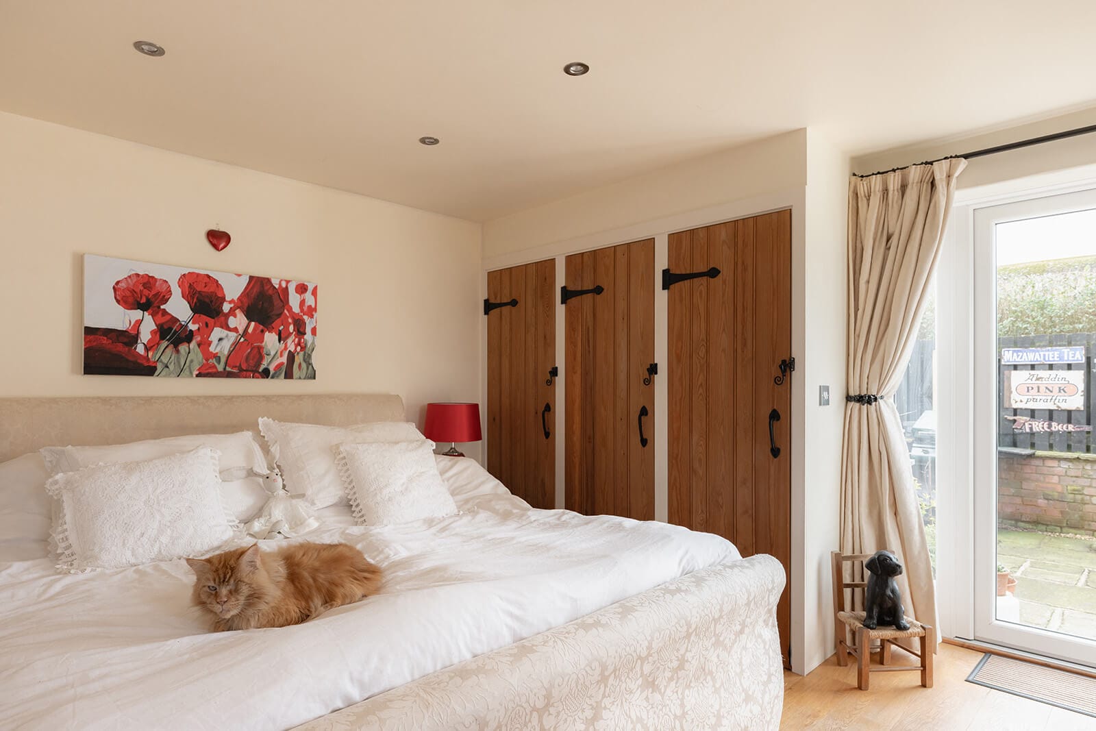 The principal bedroom is thoughtfully positioned on the ground floor and enjoys a dual aspect and direct access to the main garden. Fitted wardrobes and an en suite shower room provide comfort and convenience. A cloakroom completes the ground floor.