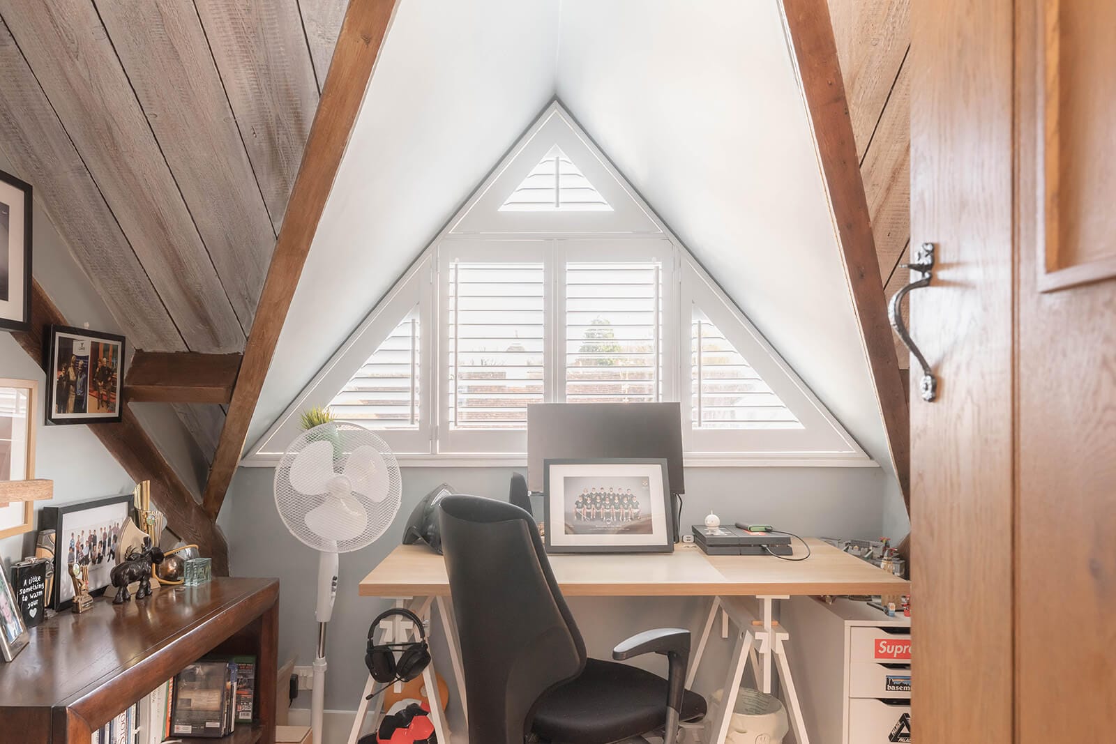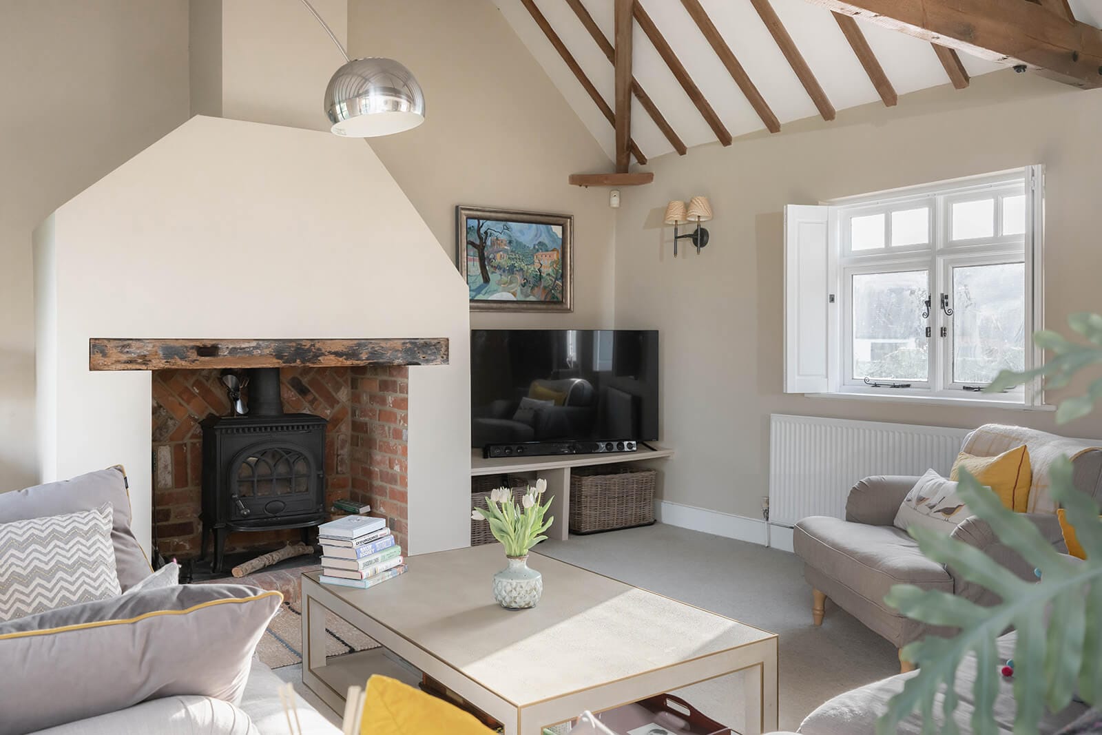 The approach is calm and understated, yet stepping inside feels almost theatrical: a galleried hallway rises upwards, hinting at the volumes and unexpected levels that make the house so characterful. The sitting room, positioned to the front, is a capacious, dual-aspect space where a large fireplace and wood-burning stove anchors the room, while the partly vaulted ceiling brings a sense of quiet drama. Contemporary black-framed glazing opens directly to the garden, the crisp lines setting up a gentle conversation with the property’s more traditional textures.