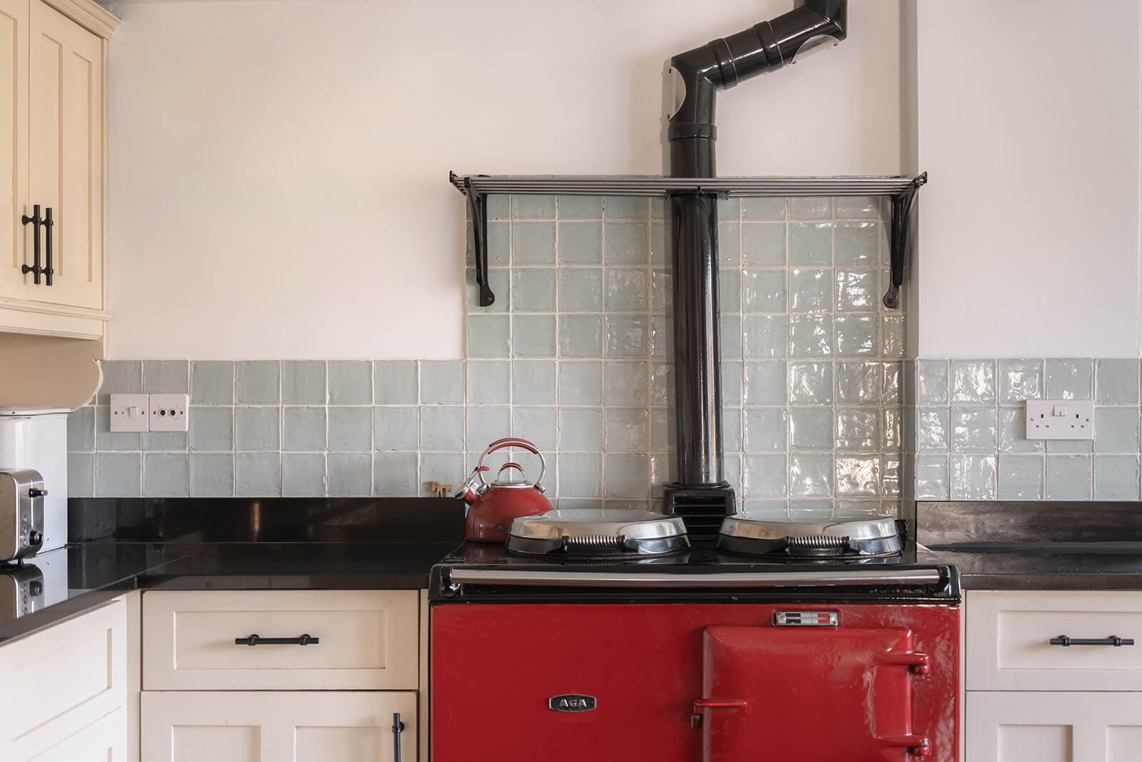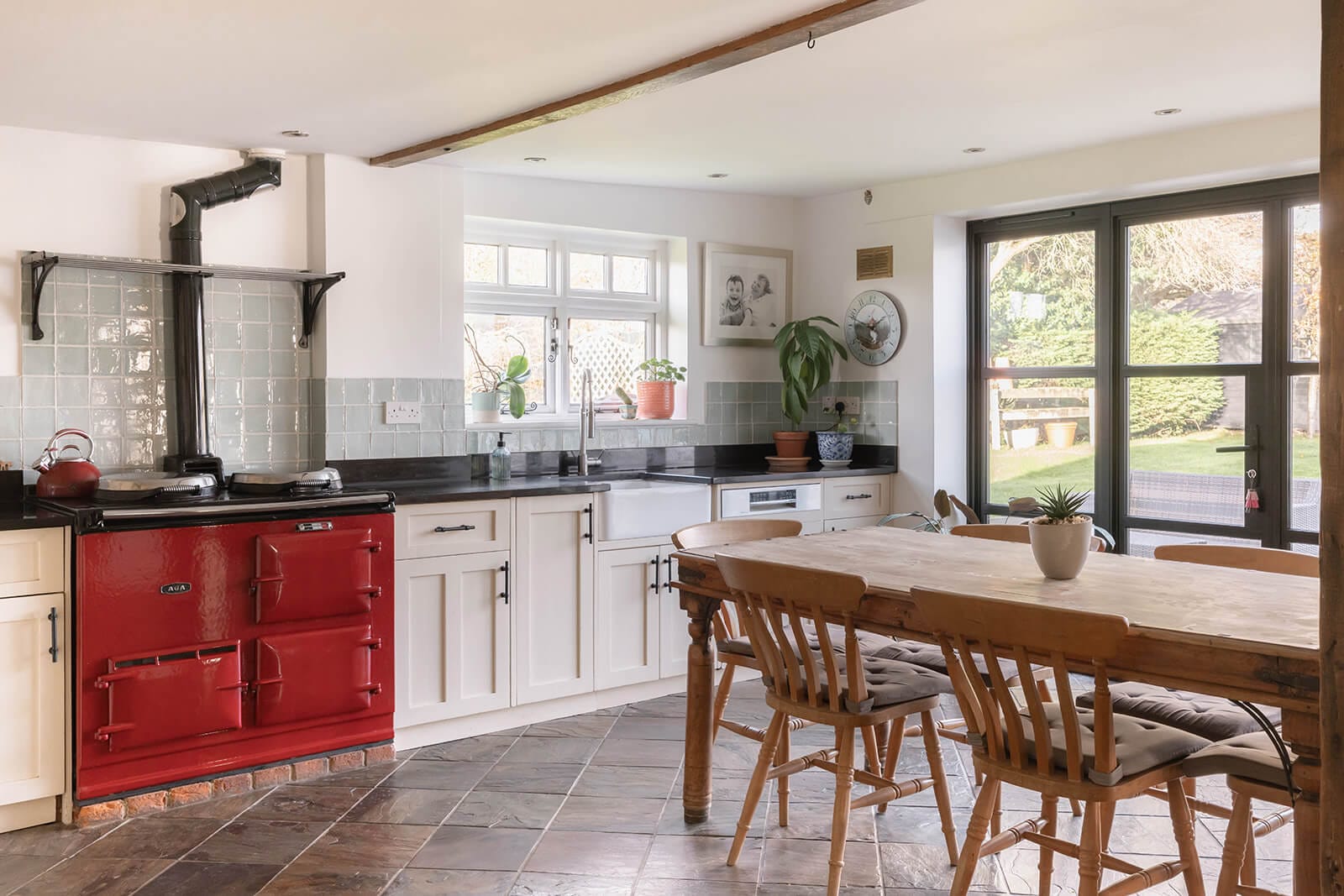 Farmhouse-style kitchen with cream Shaker cabinetry, black granite and red Aga