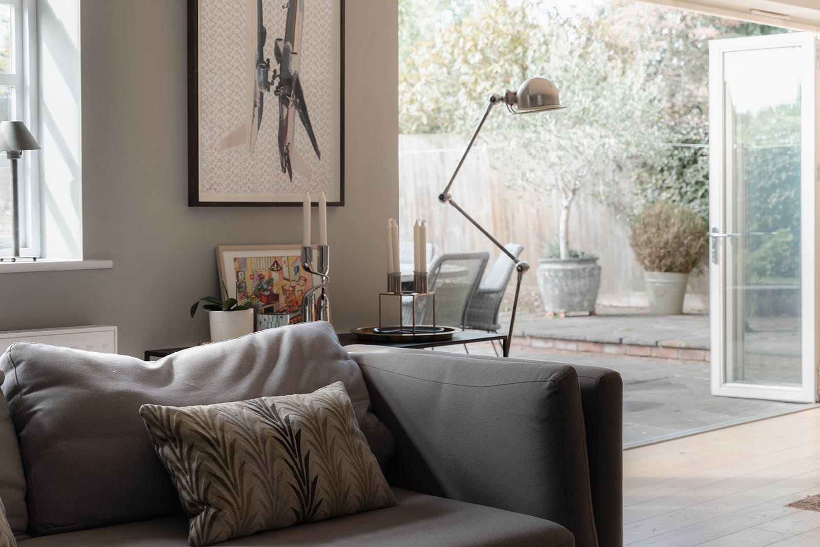 There are two further reception rooms on the ground floor: a peaceful study, decorated in sumptuous ink blue and with an arched window, and a sitting room that can be closed off for quiet moments. Both share a dual-aspect wood burner – a beautiful, sculptural object in its own right, and a source of warmth for the cooler months.