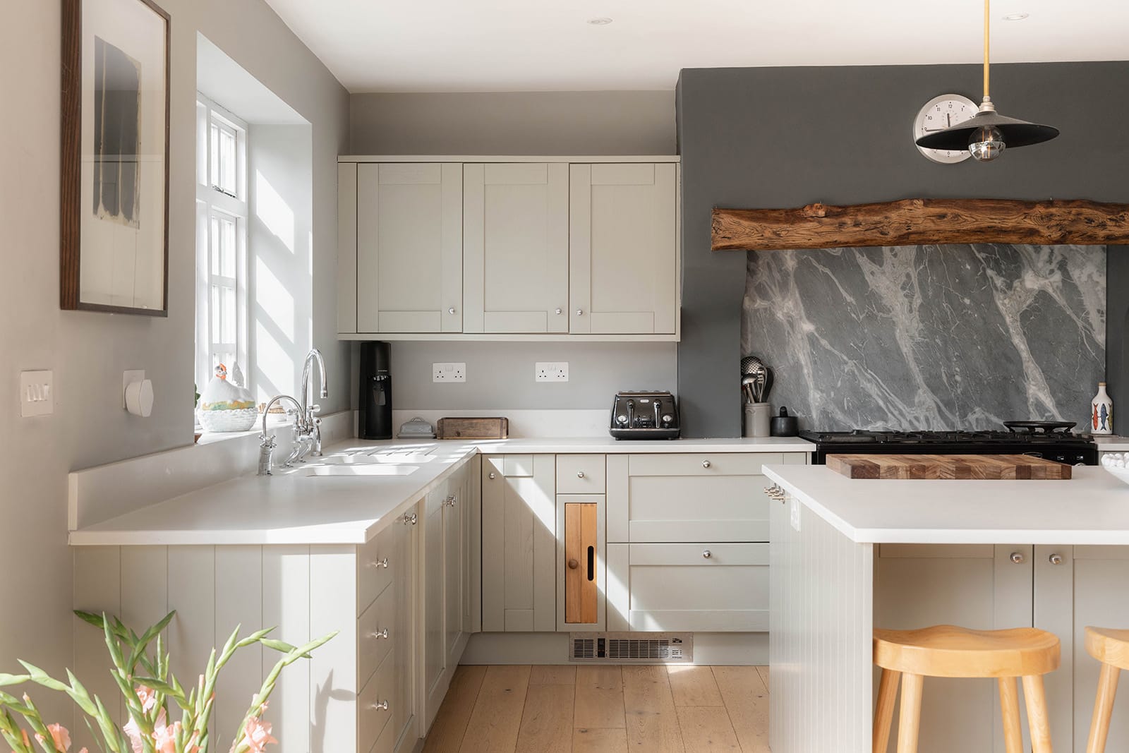 The main house unfolds across two storeys and has been sympathetically remodelled, blending generous proportions with a clarity of design. At its heart lies a show-stopping 40ft open-plan kitchen, dining and family room: a luminous, subtly zoned space that spans the full width of the house and opens onto the garden through bifold doors. There is no doubt, this a room designed for gathering: warmed by a wood-burning stove at one end, then beautifully fitted kitchen units at the other, and anchored by a large central island. Throughout, finishes are tactile and refined, with the kitchen featuring crisp white Silestone worktops and a range cooker set against a marble splashback – a balance of elegance and practicality.