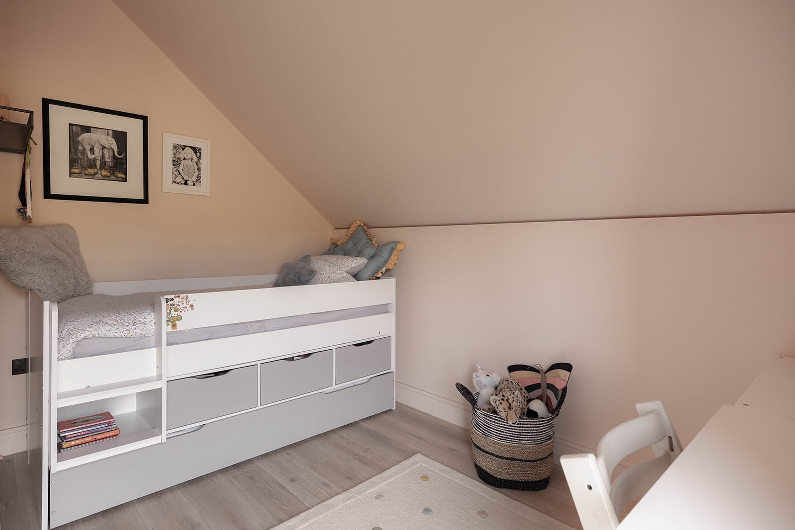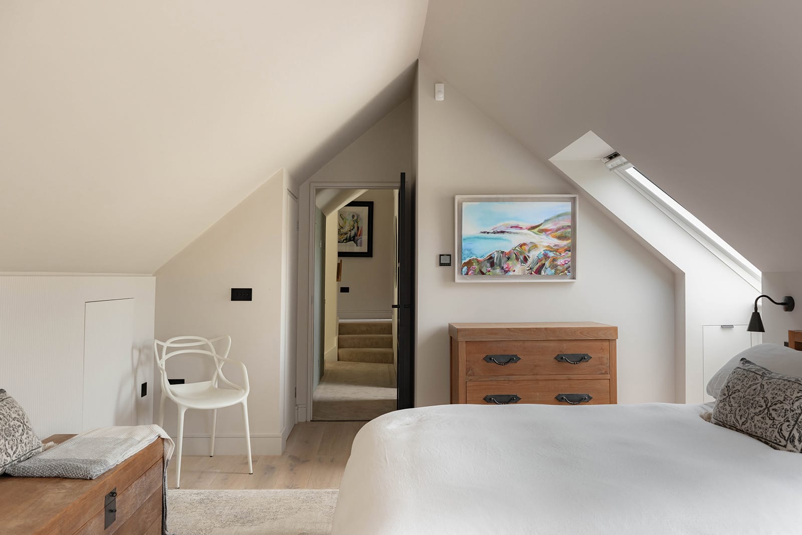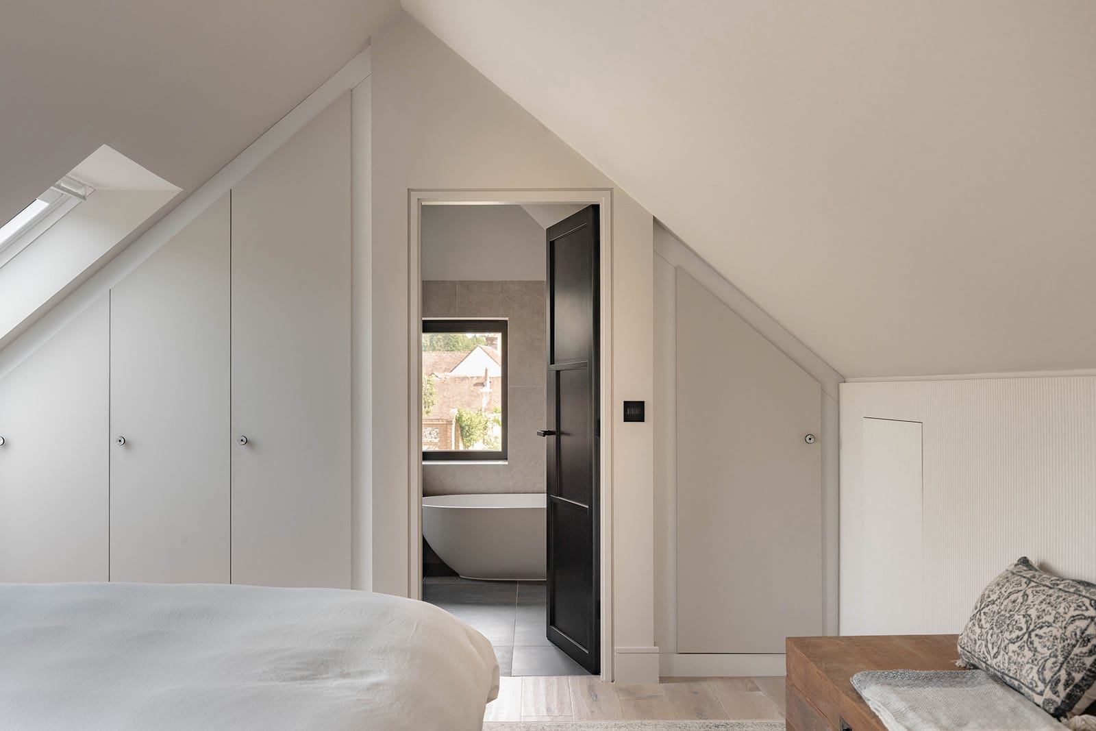 Upstairs, the home unfolds across two wings. The principal suite is set apart for privacy and includes bespoke wardrobes, eaves storage and a beautifully crafted en suite shower room. Designed by Watermark and fitted with Duravit and Coalbrook fittings, it balances function with a calm, spa-like atmosphere.