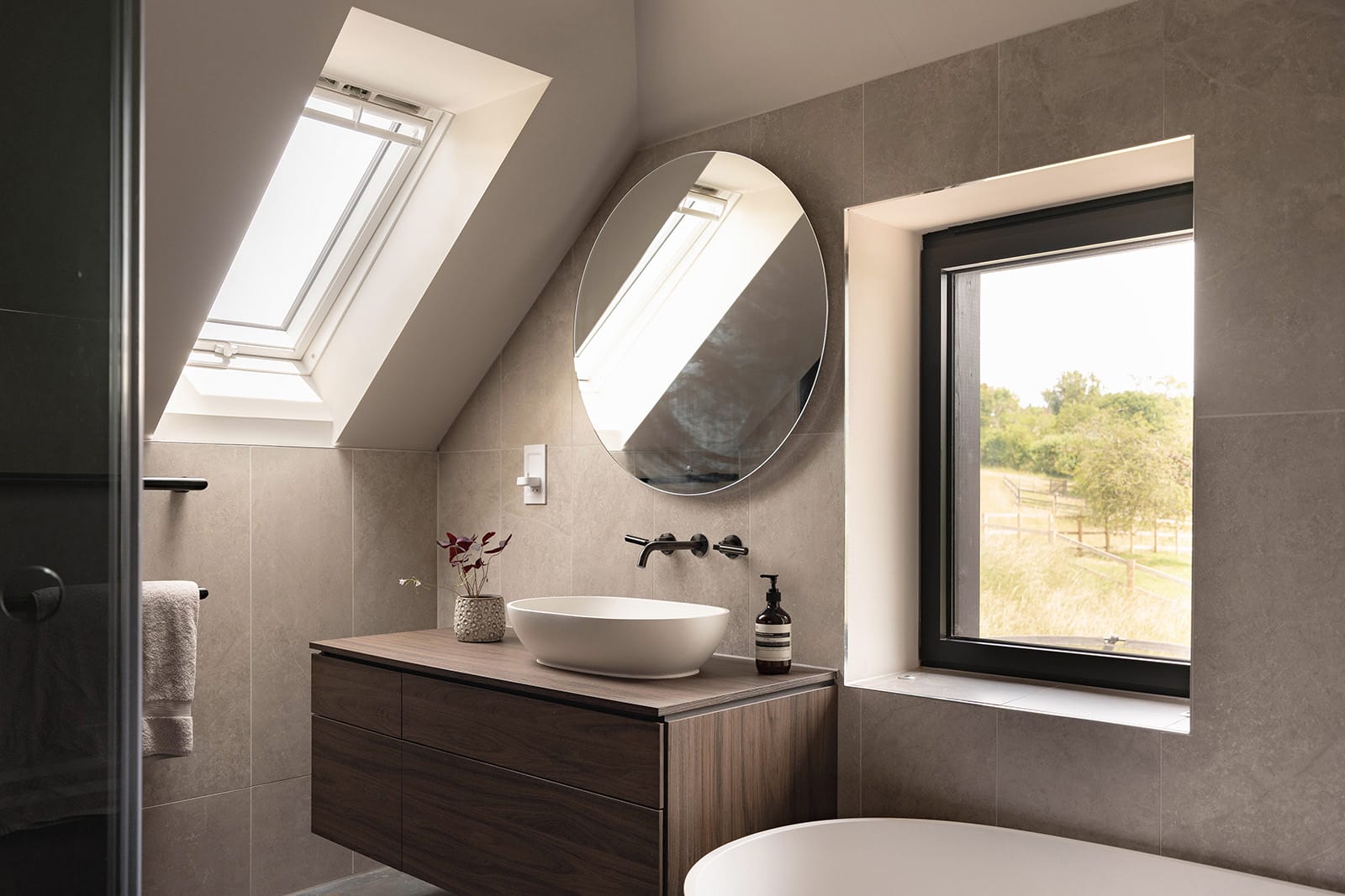 Two further double bedrooms sit across the landing. Each is generously proportioned and framed by countryside views, the ultra-slim glazing once again creating a sense of lightness and clarity. These bedrooms share a family bathroom that mirrors the en suite in tone and specification.
