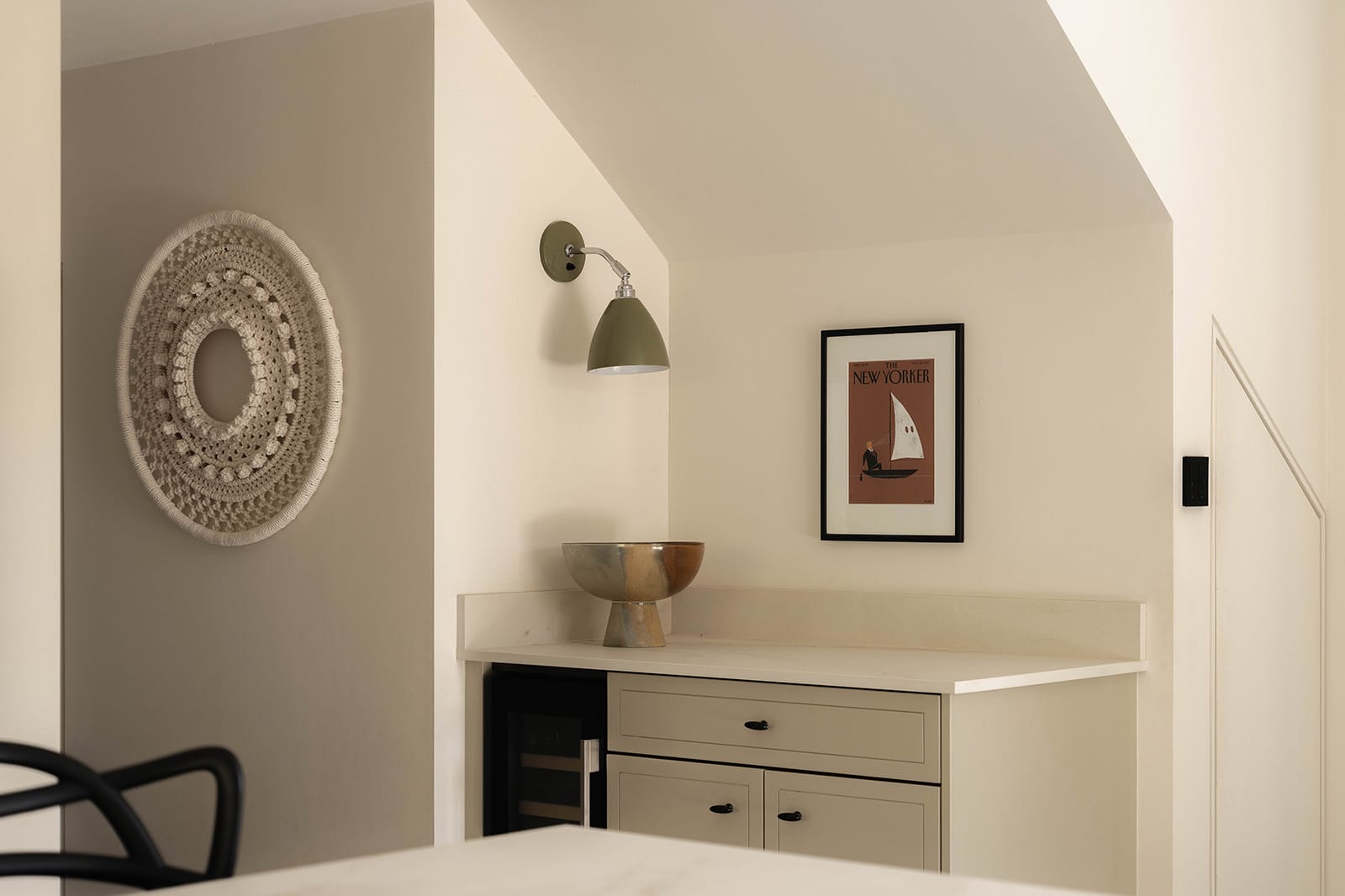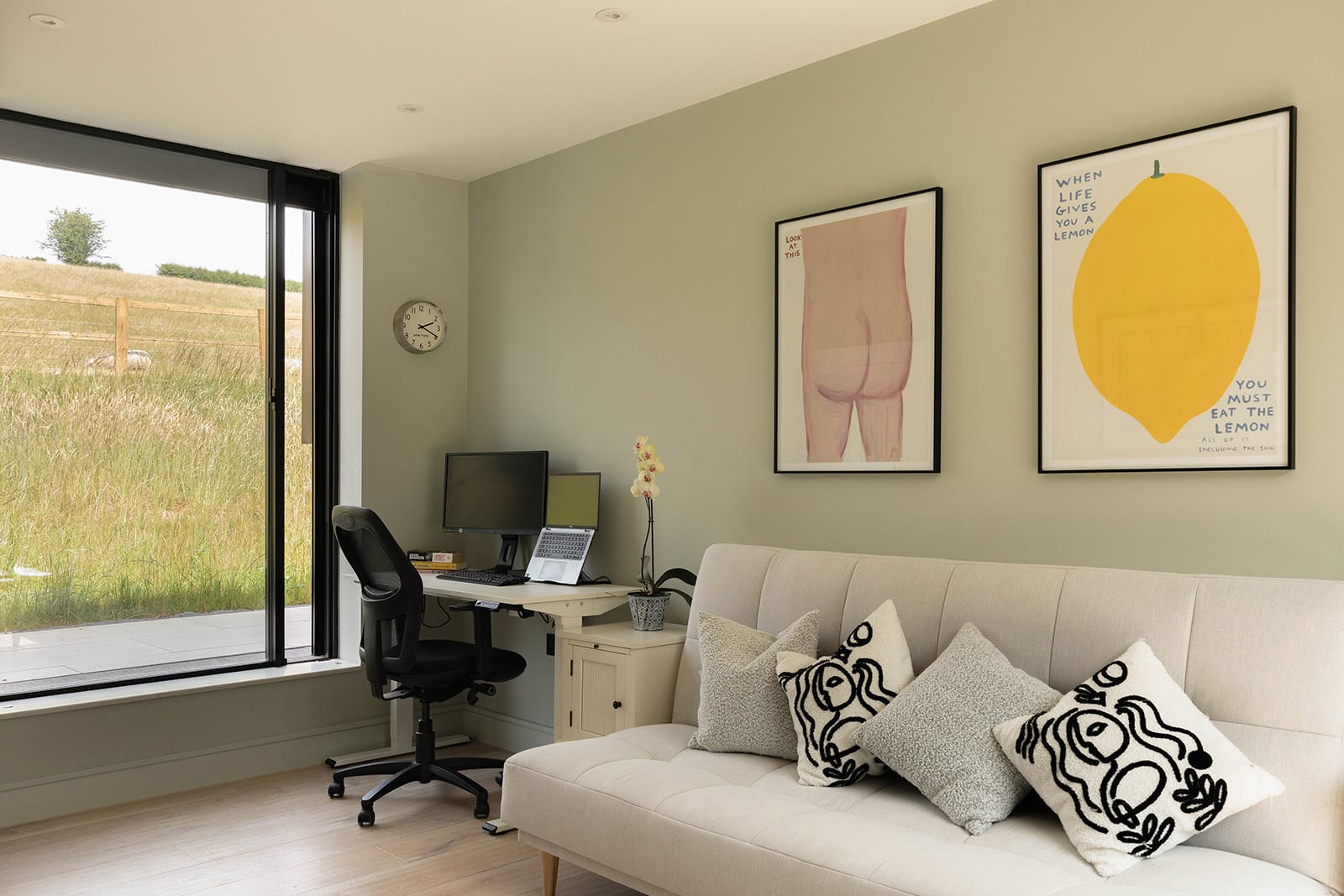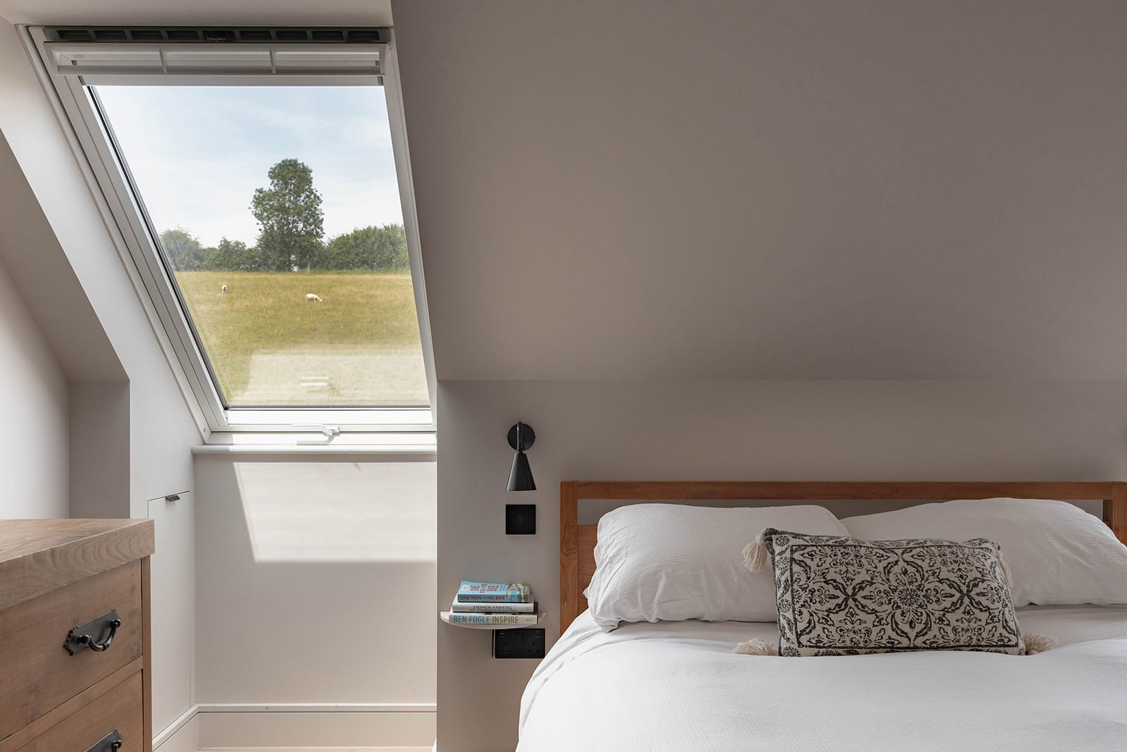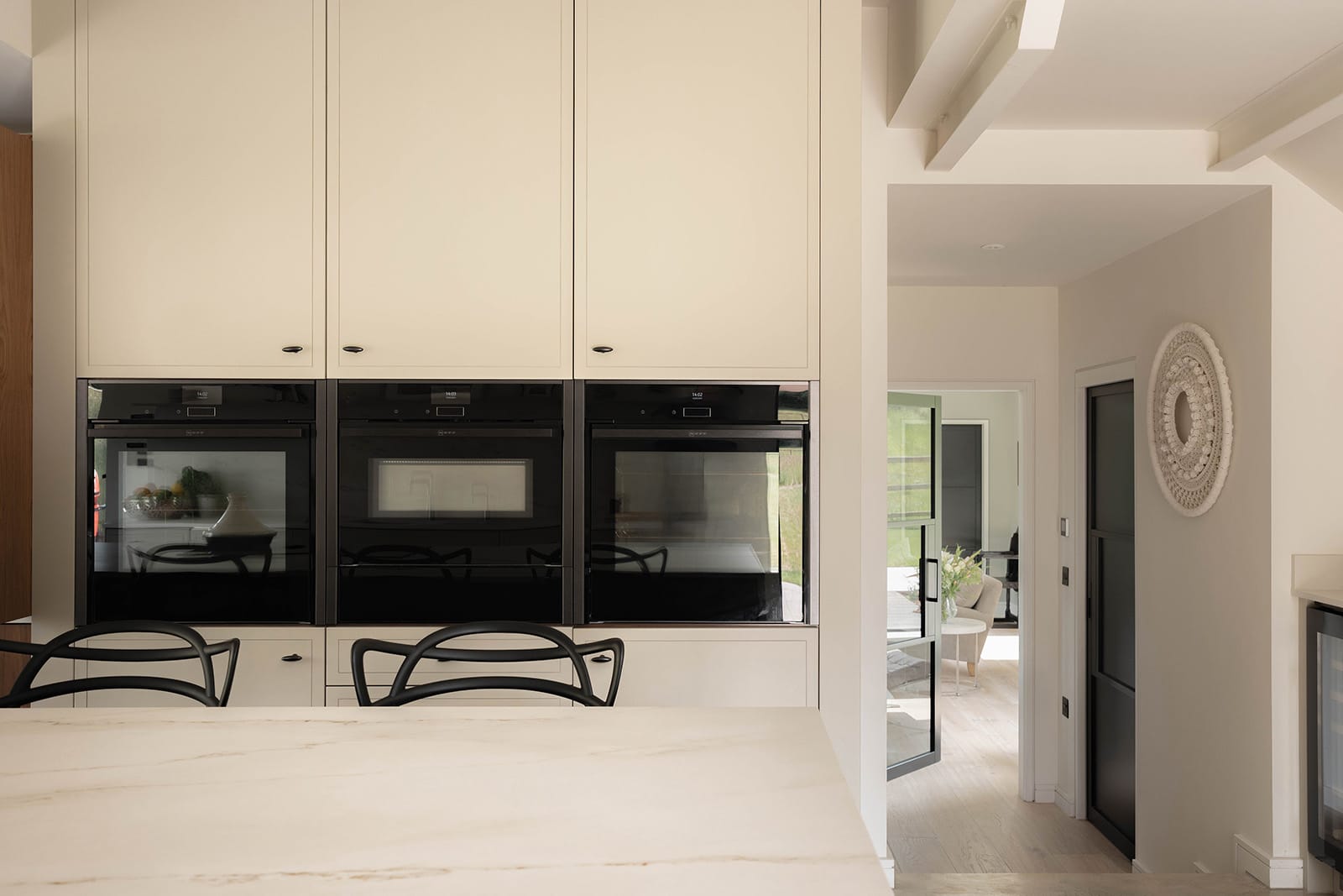 The connection between inside and outside is uninterrupted, and often reciprocal – sheep from the neighbouring field have been known to peer in, a gentle reminder of the home’s rural setting. Integrated appliances include a Quooker Pro 3 tap, Neff ovens, Miele dishwasher, Leibherr refrigeration and a Bora induction hob with through-floor extractor. A coffee station completes the space with understated efficiency.