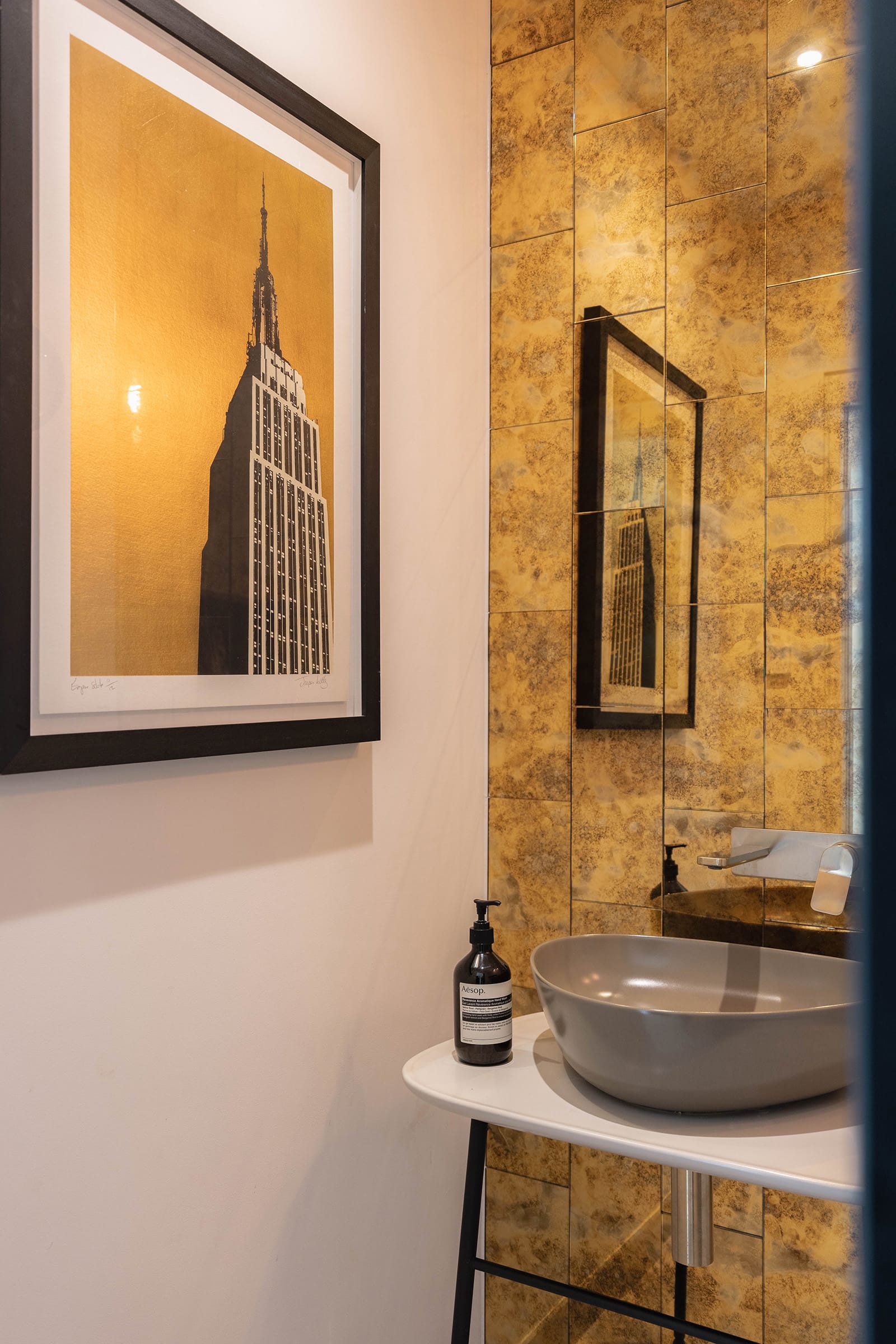 Along the hall, the utility room houses systems for water filtration, purification and softening. Drinking water is sourced from the aquifer beneath the land and treated to provide a clean, healthy and sustainable supply. Just across, the cloakroom is a surprising moment of expressive design. Gold mirrored tiles and Vitra sanitaryware elevate this small space into a refined composition that feels both playful and polished.