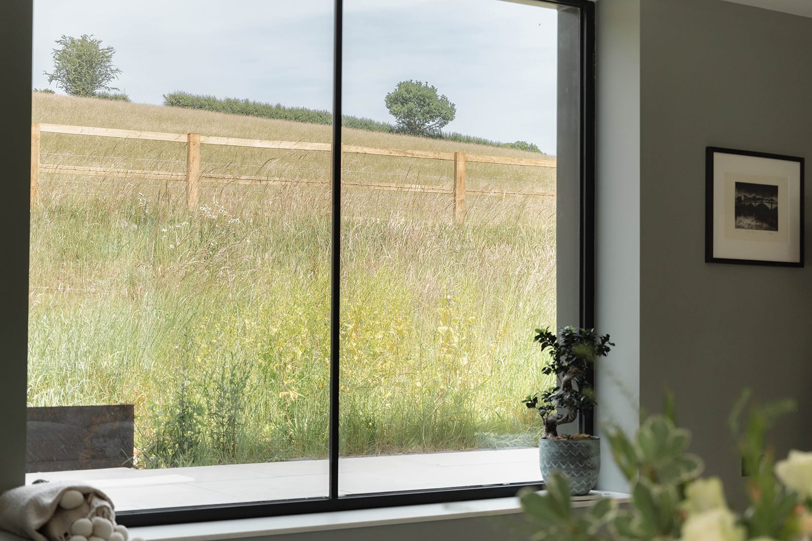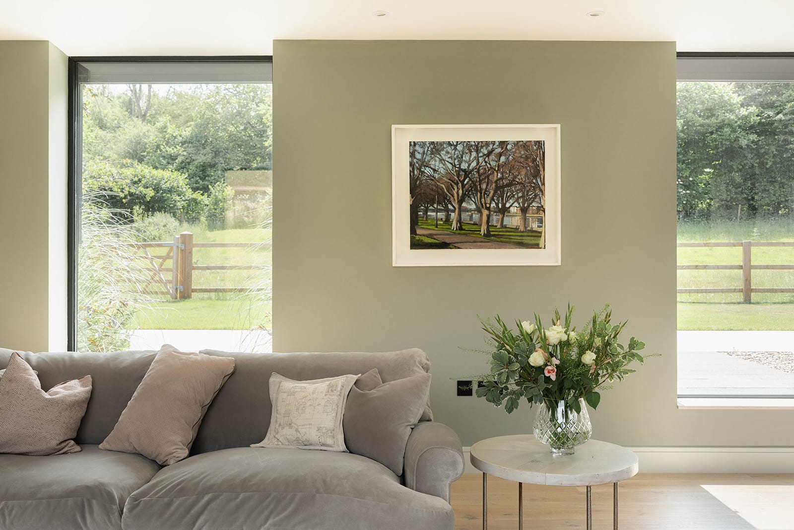 Outside, the landscaping has been purposefully restrained. Lawn and porcelain terraces give way to the natural contours of the surrounding fields. There are no high fences here, just simple post and rail, allowing the landscape to remain uninterrupted. A large, gravelled parking area accommodates four vehicles with ease.