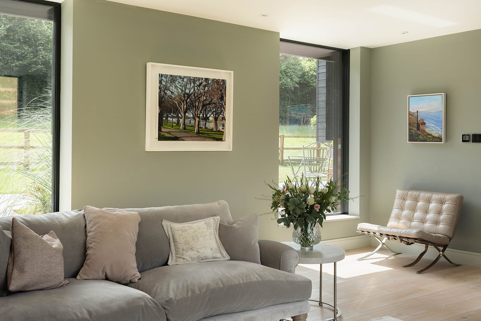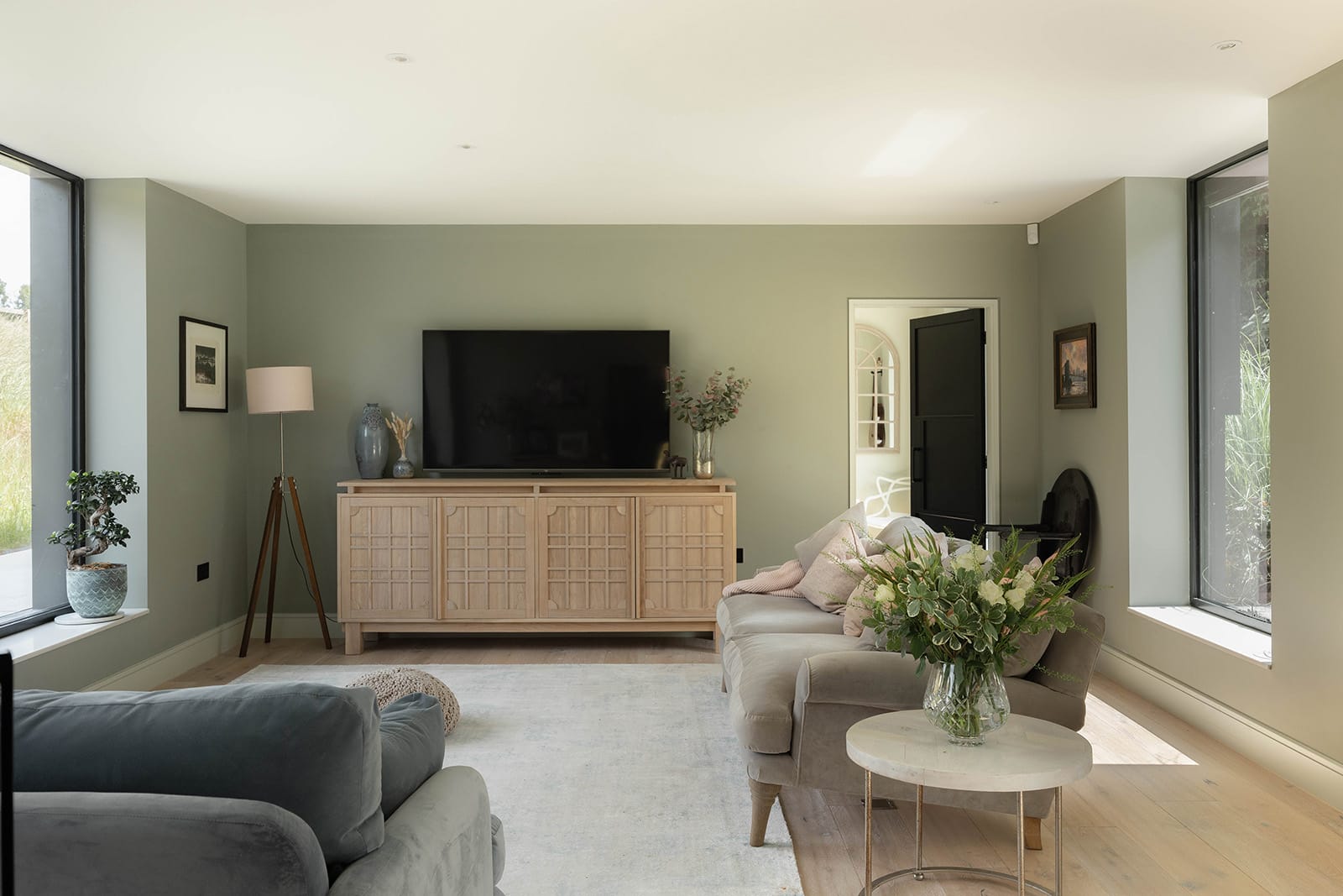 The sitting room lies beyond: a generous dual-aspect space defined by warm-toned engineered oak flooring by Ted Todd and more of the expansive IQ glazing. The effect is both cosy and expansive. A door leads through to a study/family room, again dual aspect, and finished in the same tactile material palette. The versatility of the house means the study could easily be used as an occasional guest bedroom if required.