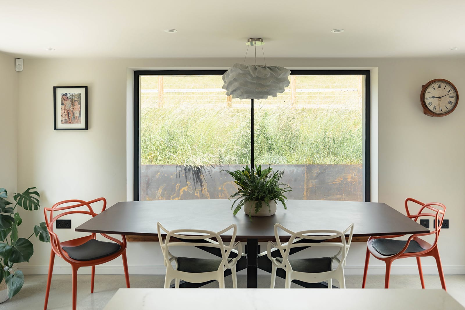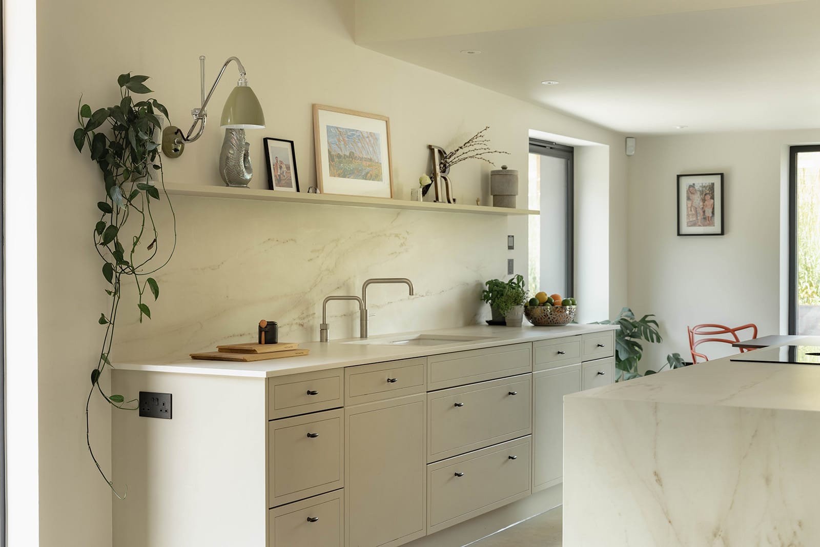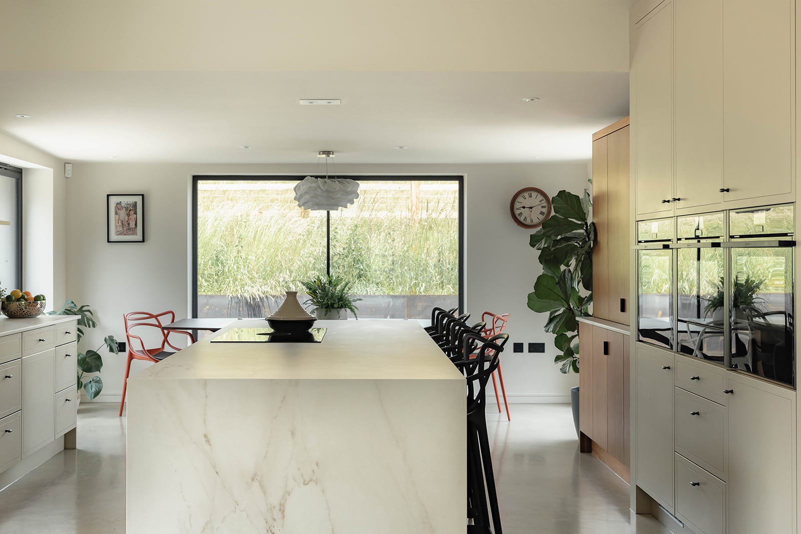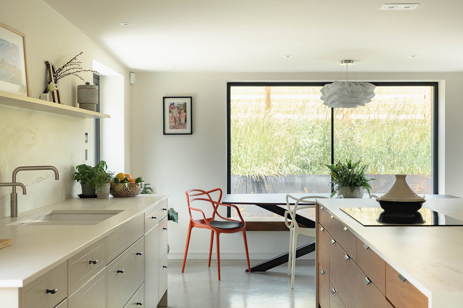 The kitchen and dining space forms the heart of the home. Light pours into the room through expansive ultra-slim glazing by IQ Glass, framing pastoral views that shift with the seasons. Bespoke cabinetry blends hand-painted finishes with rich tones of solid walnut, while Dekton worktops provide a tactile and durable surface. A matching Dekton dining table anchors the far end of the room, positioned to take full advantage of the views.