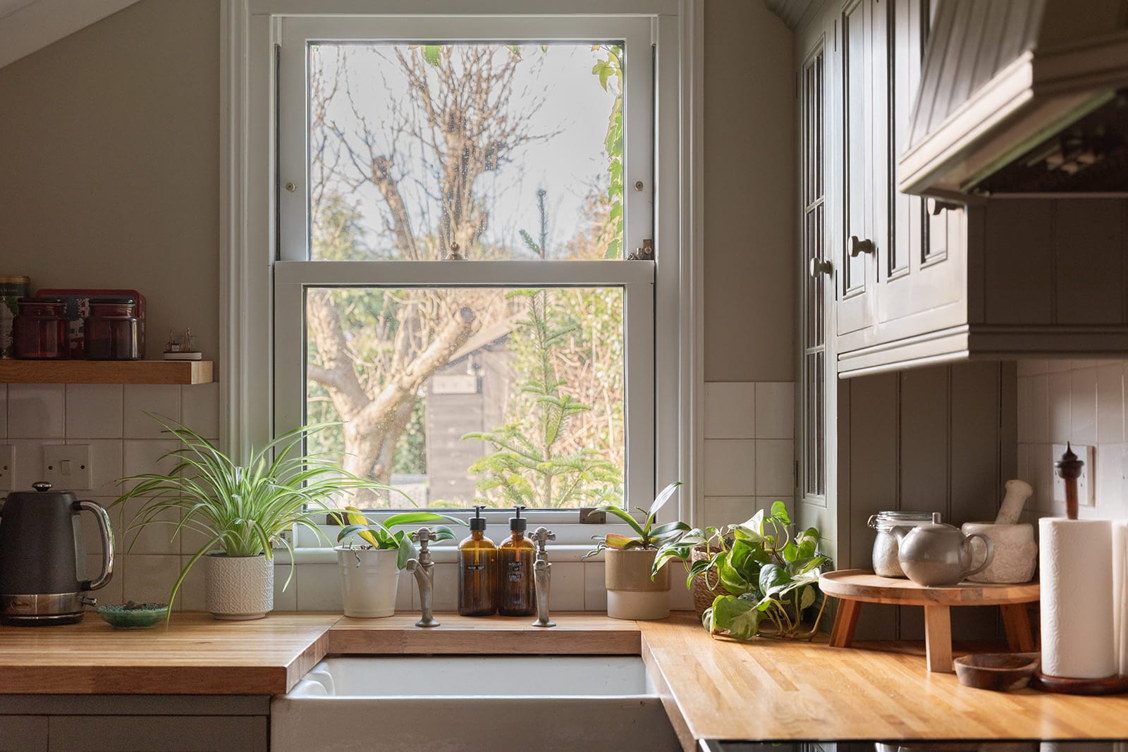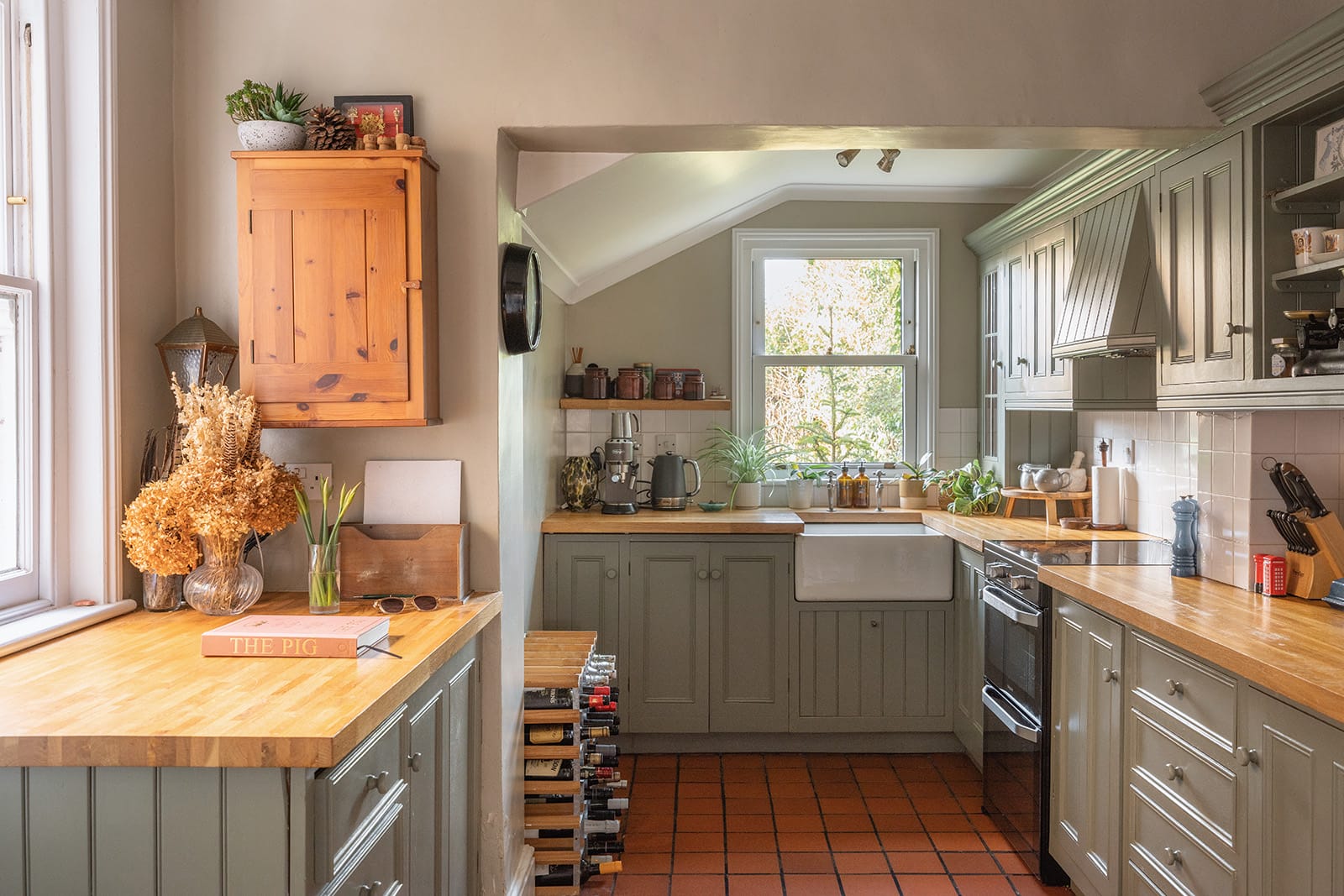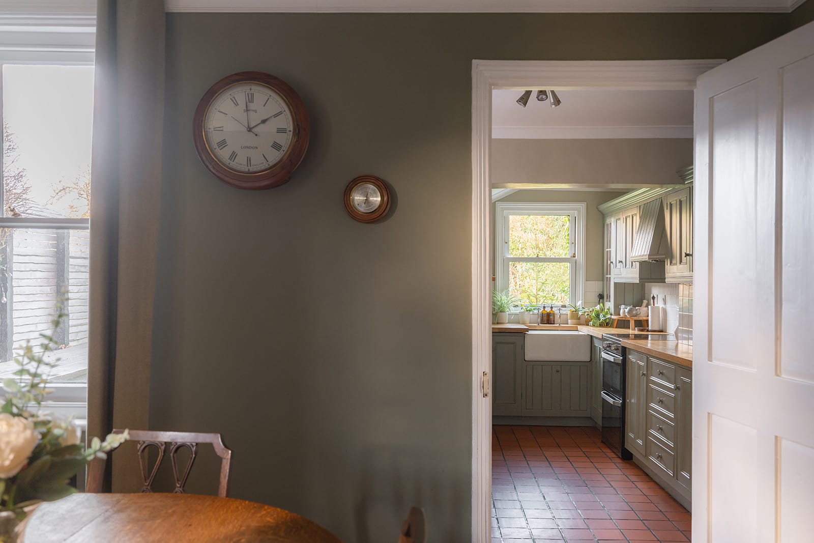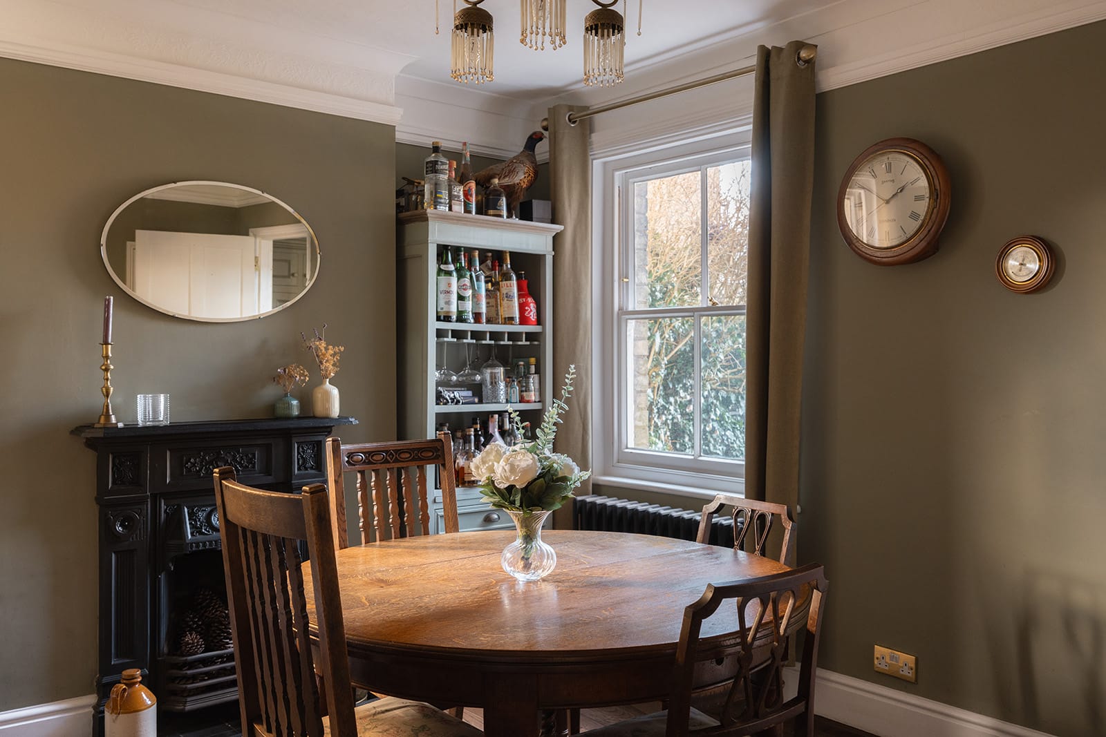 The accommodation includes two generous reception rooms: a well-proportioned sitting room with a bay window and open fire, and a spacious dining room featuring an open fire and beautiful oak flooring. The kitchen, designed in a traditional style, boasts bespoke fitted units, complemented by a wooden worktop and a classic Butler sink.