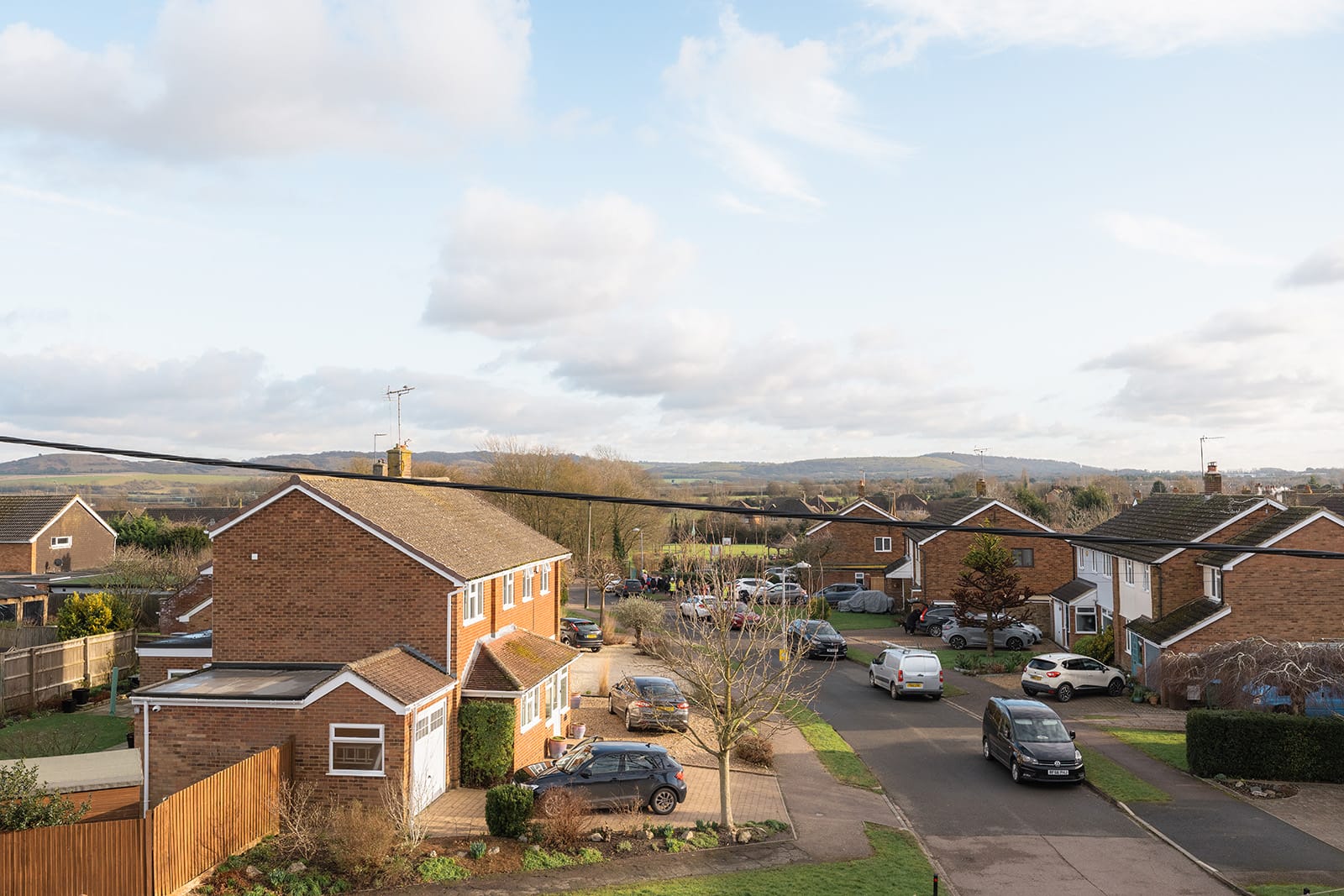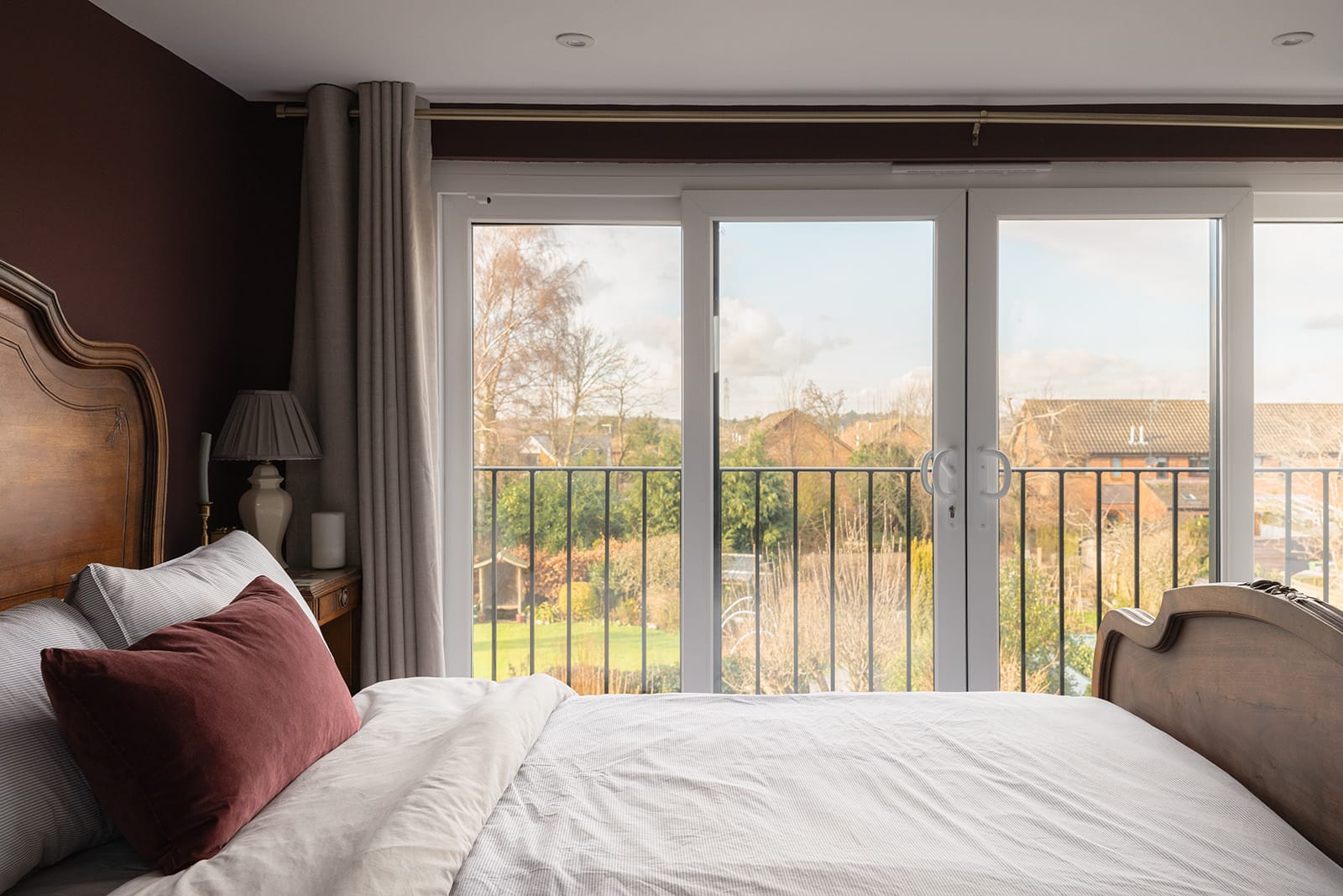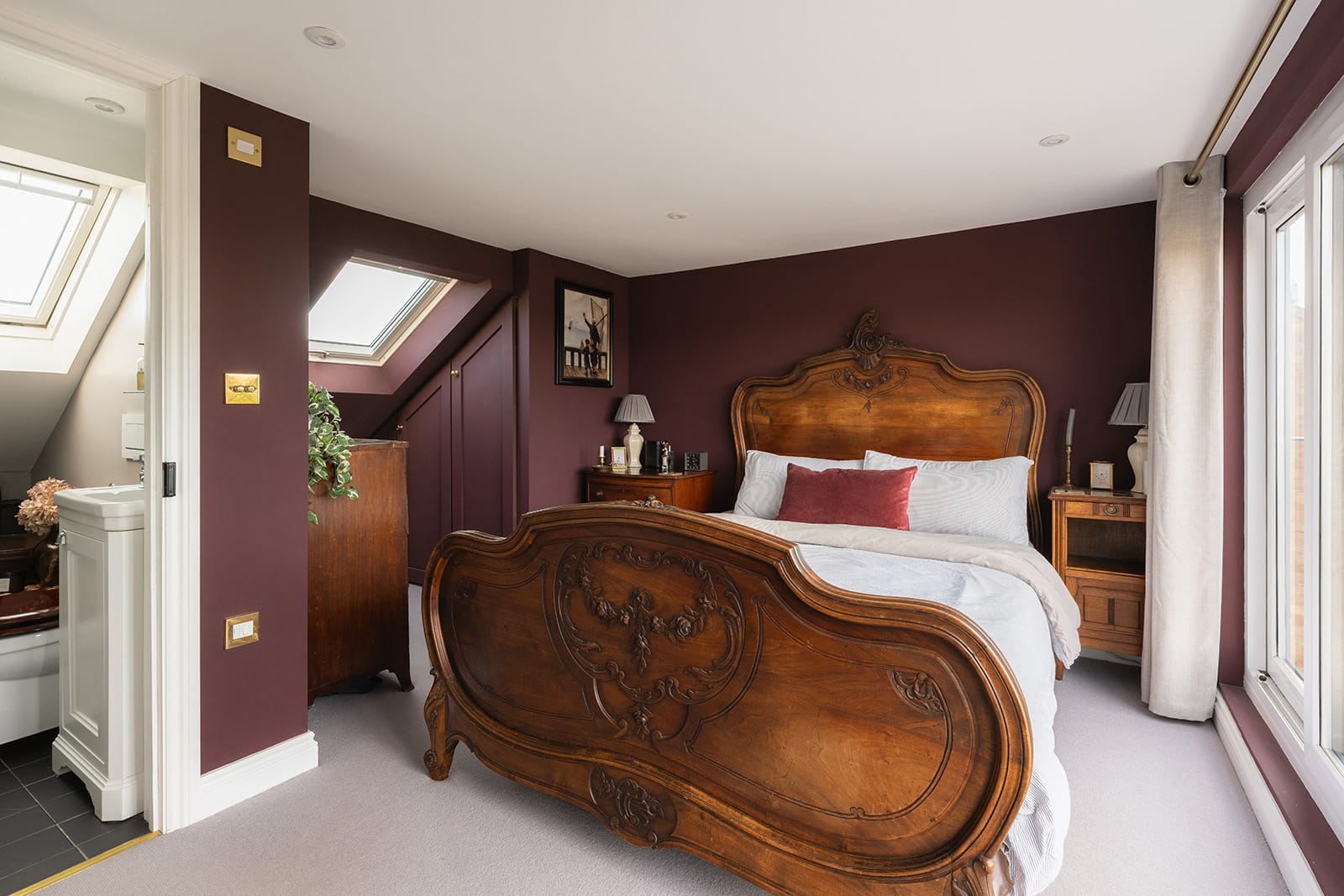 A further staircase leads up to the superb principal bedroom, which benefits from a stylish en suite shower room. Light pours into this lovely room through windows that stretch the full width of the space, providing a peaceful atmosphere and offering sweeping views of the neighbouring gardens and countryside beyond, while a charming Juliette balcony further enhances the appeal.