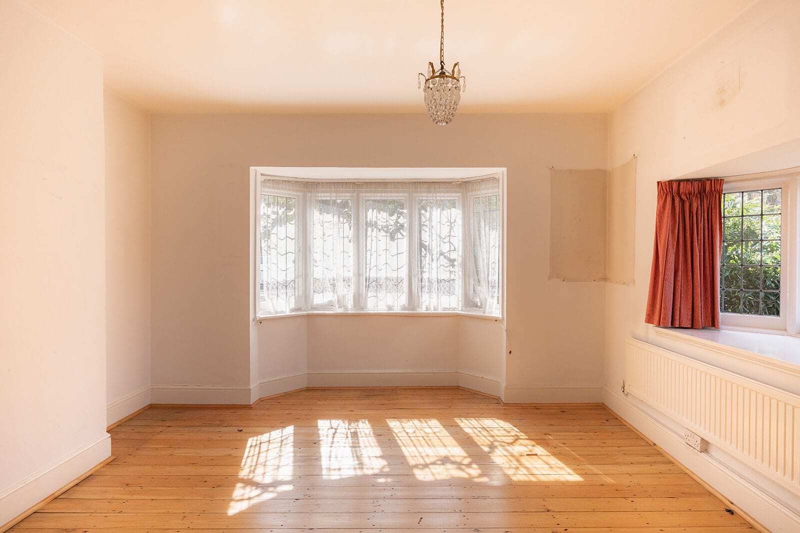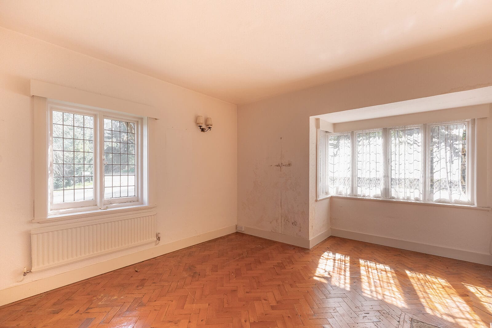 Beyond the kitchen, two beautiful reception rooms await. The first, a sitting room, is graced by two bay windows, one of which frames an enchanting view of the garden through a leaded-light bay window, allowing for a quiet moment of serenity. The second, the dining room, is an ode to classic elegance with its original parquet herringbone flooring, the honeyed tones of which speak softly of elegant dinners and lingering conversations.