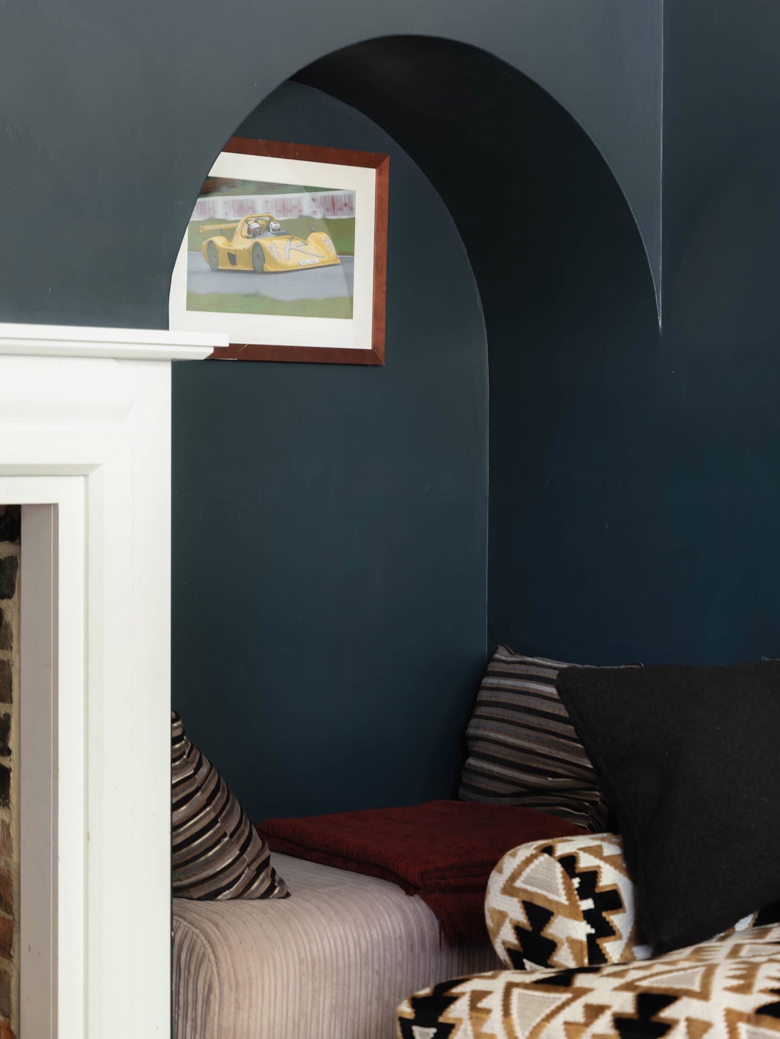 To the right, the sitting room is richly atmospheric, painted in a sumptuous deep blue, with a fireplace and aged timber floors underfoot. A picture rail traces the perimeter in classic early 20th-century style, anchoring the space in its historical context.