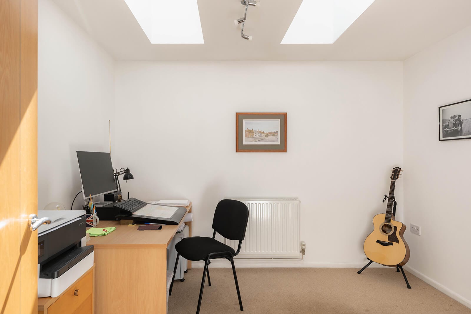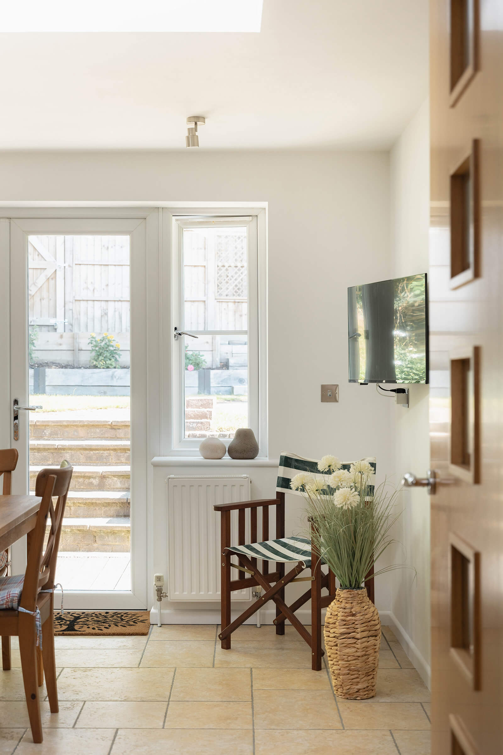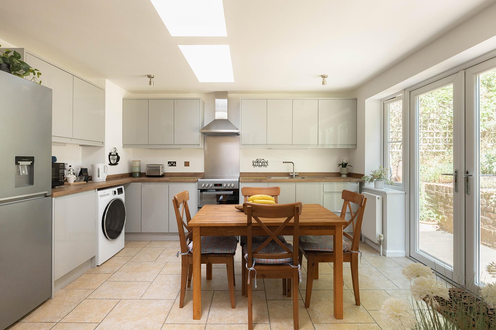 The kitchen dining room is a generous size and is clean-lined and contemporary, with sleek units in a muted grey palette. Two skylights continue the dialogue with natural light, while glazed doors open directly onto the garden. Positioning of the rooflights on opposite roof slopes results in both morning and evening sunlight entering this room.
