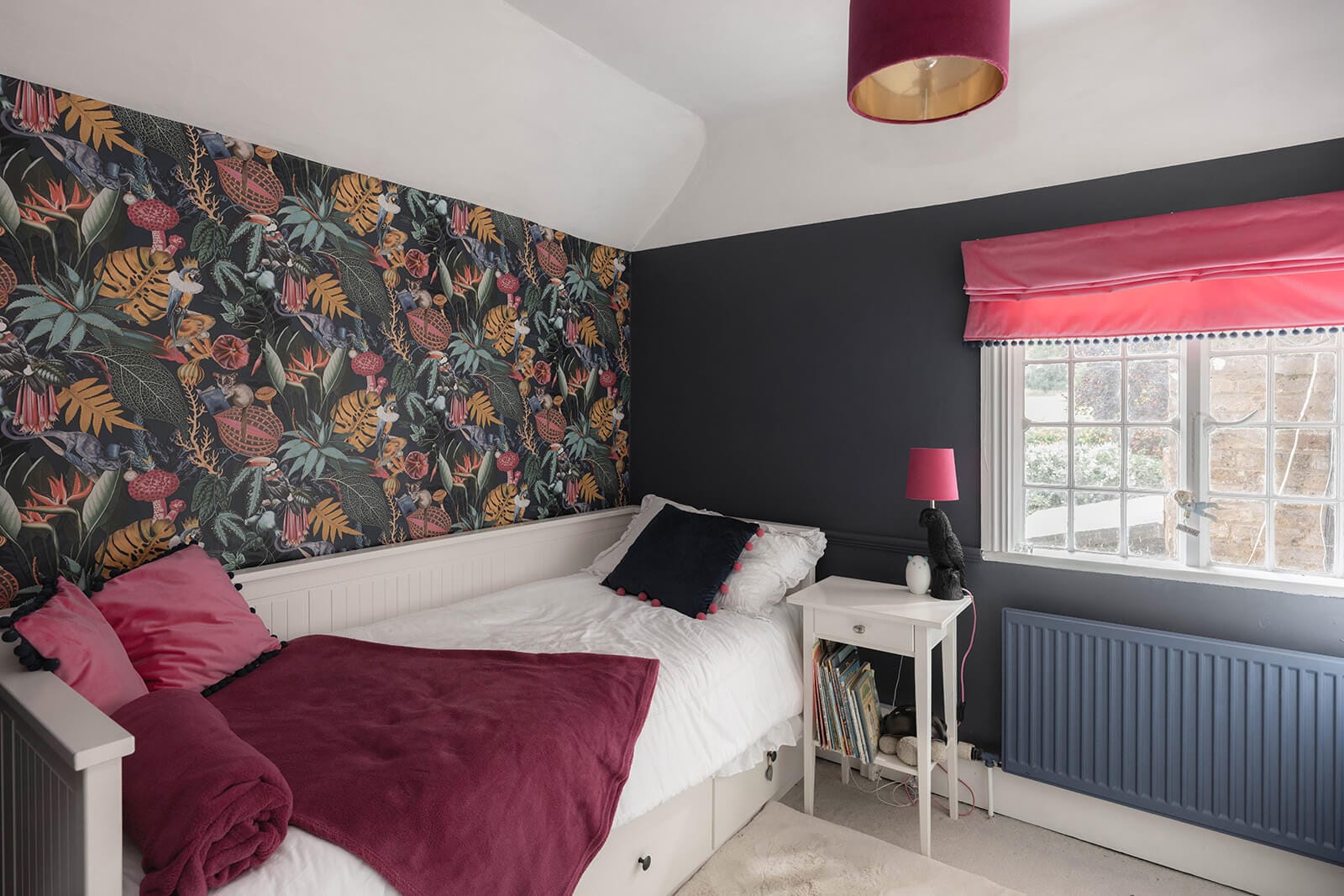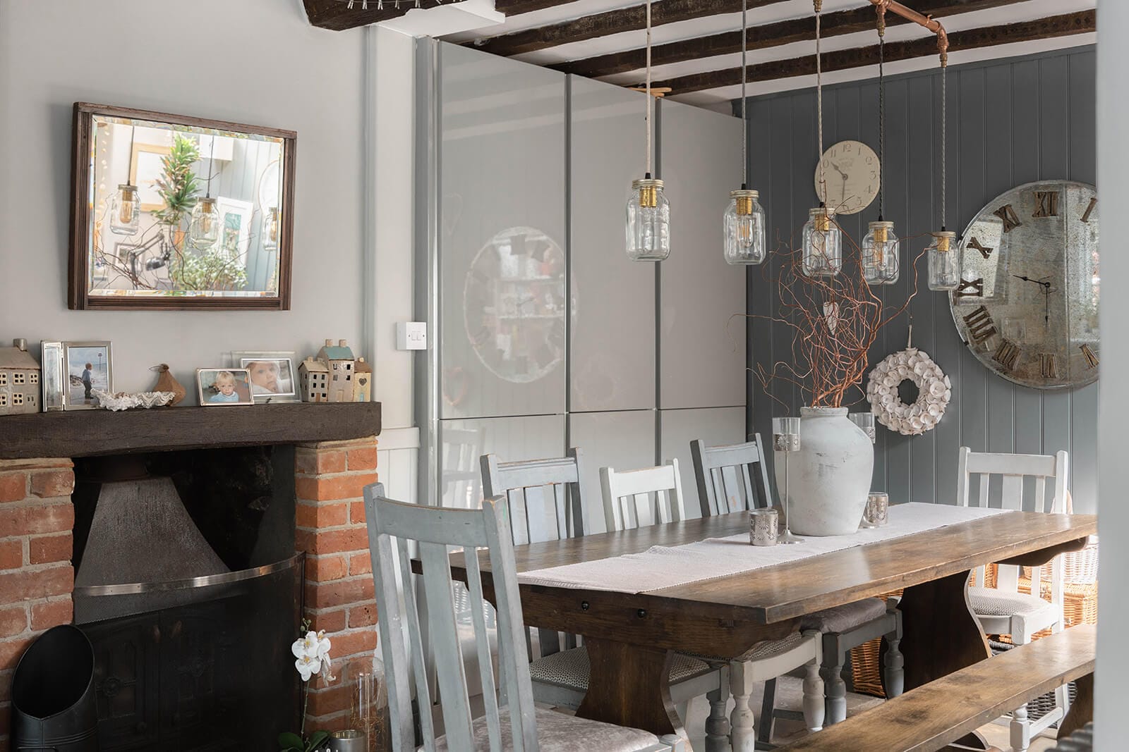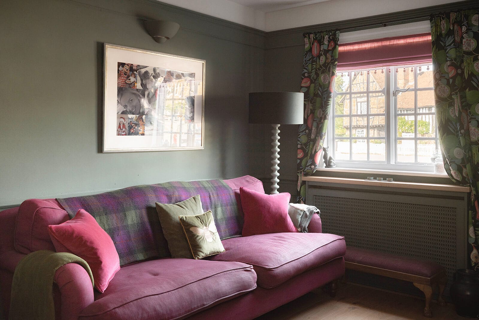 Inside, the house opens into a pretty hallway. To the front, the sitting room looks out over the village duckpond and centres around a large original fireplace. Deep, richly toned walls give the room an intimate, grounded feel. Further in, at the centre of the house, lies an open-plan kitchen and dining room. A quiet study area is zoned within this space; a discreet and functional addition.