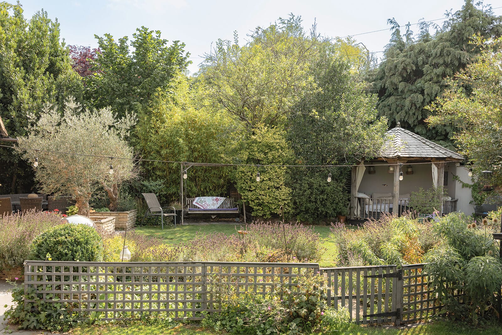 Outside, the garden is quietly secluded and thoughtfully planted. Mature borders and established lawns frame the house, while a paved terrace provides space for alfresco dining. A lavender-edged pathway leads to the garage and private parking area, and a timber pergola adds a sculptural focal point.