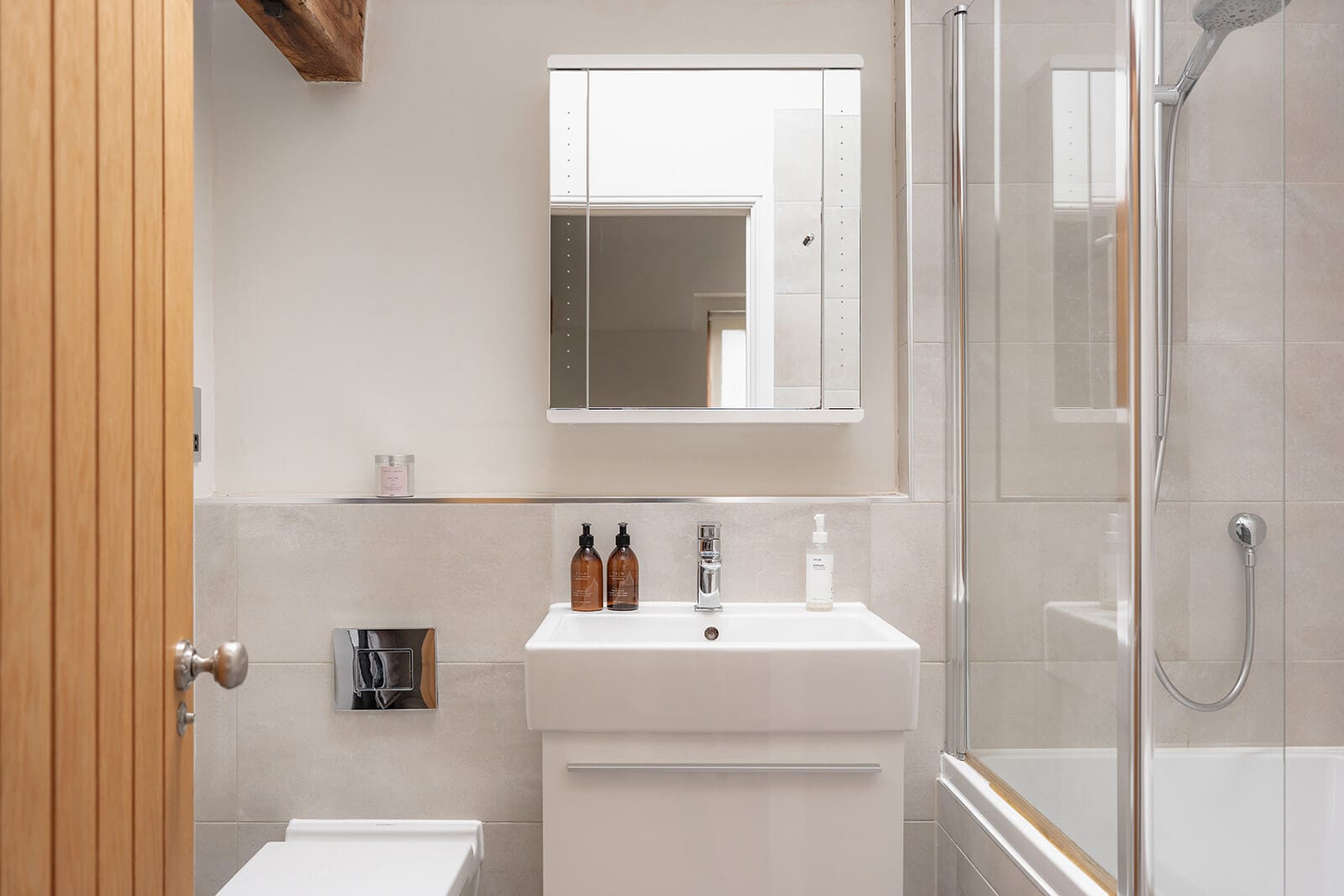 Upstairs, two further double bedrooms await, each with soaring 11ft vaulted ceilings. A contemporary family bathroom completes the upper floor.