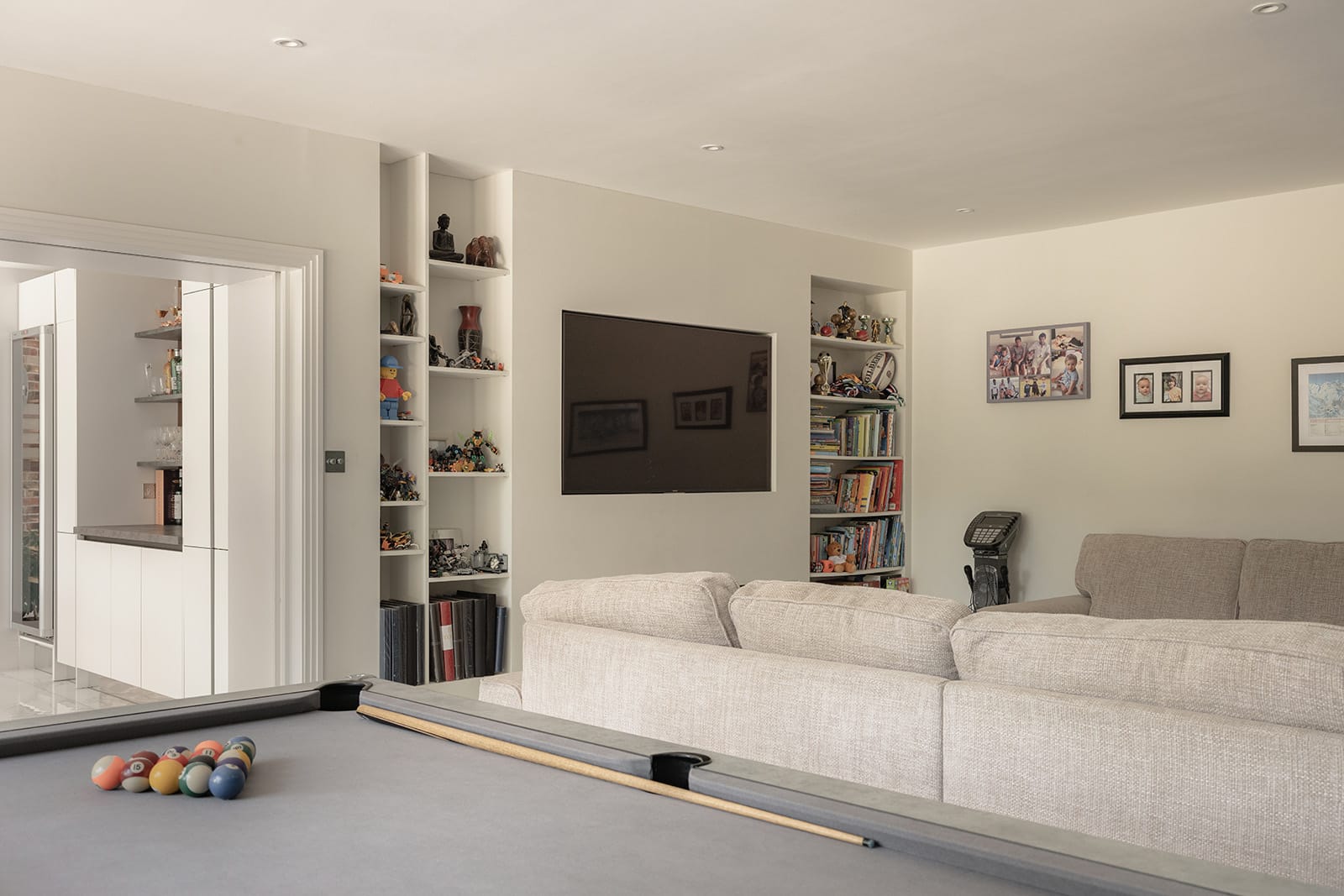 From the hallway, steel-framed Crittall-style glazed double doors open to a spectacular kitchen and dining space – around 500 sq ft of triple-aspect open-plan living, gloriously lit by a 16ft wall of bifold glazing that draws the garden deep into the interior. A generous central island acts as the social anchor and culinary stage, flanked by integrated appliances and precision Nolte cabinetry. A concealed, oversized pocket door offers connection – or separation – to the adjacent family room, where skylights punctuate the ceiling and bifold doors continue the home’s seamless dialogue with the garden.