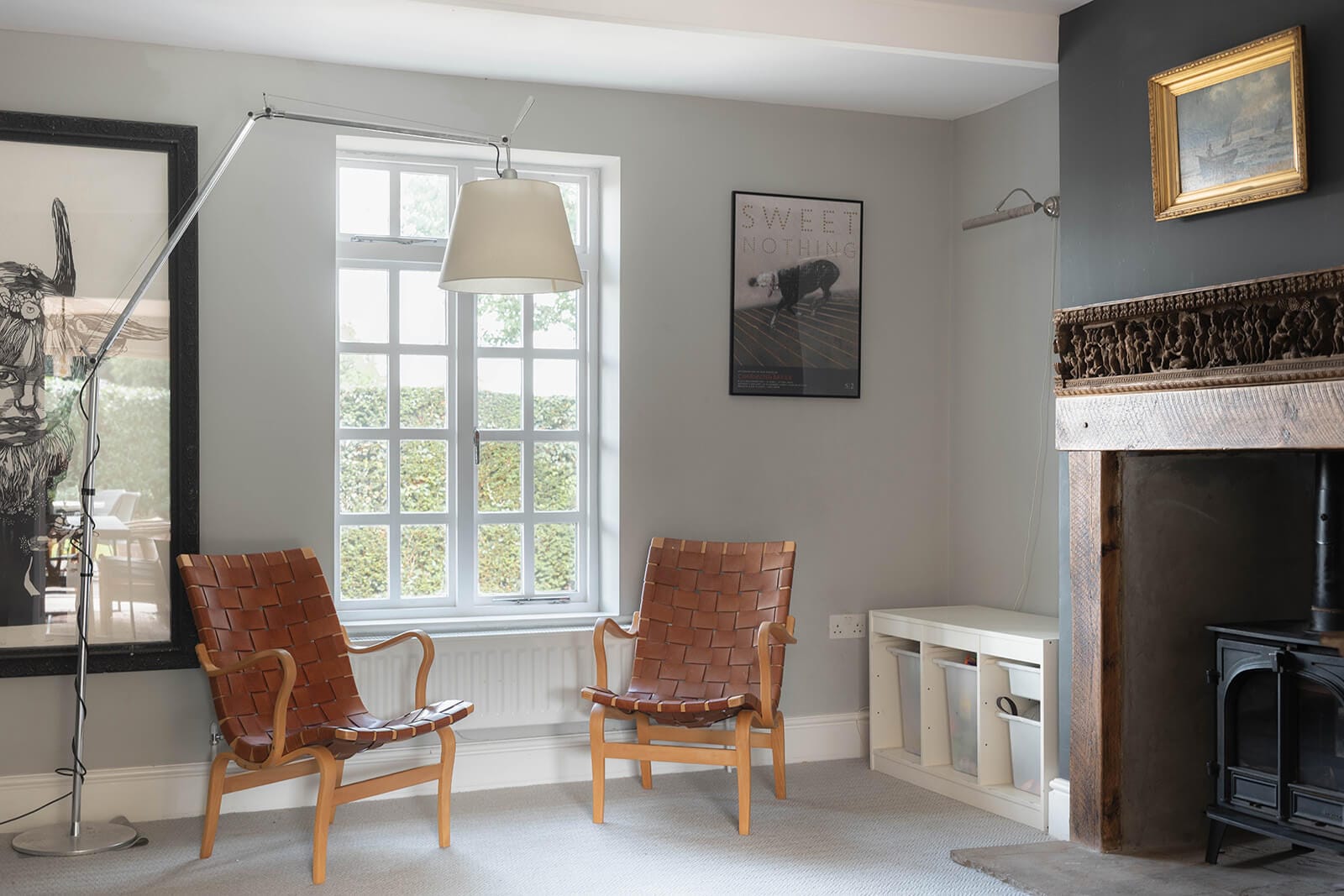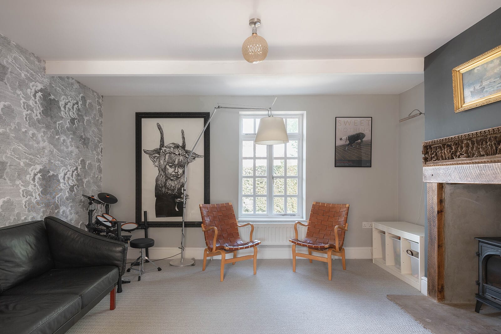 There are two further reception rooms on the ground floor: a peaceful study, decorated in sumptuous ink blue and with an arched window, and a sitting room that can be closed off for quiet moments. Both share a dual-aspect wood burner – a beautiful, sculptural object in its own right, and a source of warmth for the cooler months.